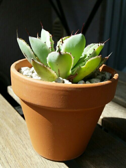 アガベ吉祥冠錦。 昨年4月5日購入。 4月9日、2.5号テラコッタに植え替えた。 あれから1年。 現在の吉祥冠錦。 全然生長していない。 いや正確には全くデカくなっていないというべきか。 新しい葉が出ないわけではないのだ。 新しい葉は出ているのだが、下葉も枯れるので、葉の枚数が変わらないのだ。 上から見たところ。 昨年4月9日。 現在。 う~ん。 同じだ。 一年経ったとは全く思えないな。 コイツ、しかし、一年間ずっと変わらなかったわけではない。 昨年5月10日。 下葉が枯れ枯れだ。 ネットで情報を集めると、アガベは植え替え時根を切ってはならないという記述が散見される。 オレは根を切った。 だからかもしれない。 今年は植え替えなしでいいかな。 デカくなったら来年植え替えよう。 買って一年。 今年は生長してくれよ。 目標直径20cm。 にほんブログ村