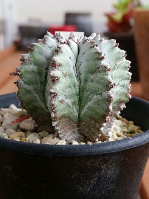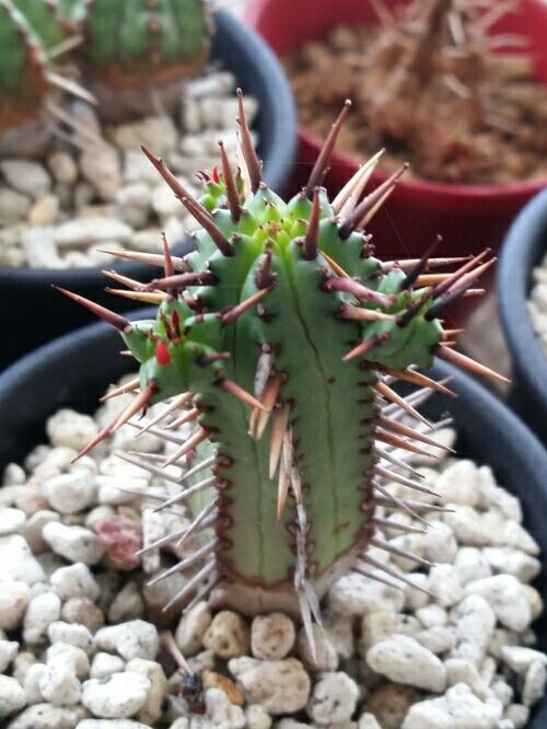 ユーフォルビア、ホリダ。 池袋屋上出身のエリートである。 ホームセンター、100均出身とは一線を画するのだ。 店頭に並んでいるときでもちゃんと陽に当たり、風に当たり、しかし雨には当たらないという最高の環境に置かれている。 購入後の生育もすこぶる良く、これまで順調に育ってきた。 購入後1年半経過。 そろそろ植え替えようかとも思うが、何せ今うちは日照ゼロ、躊躇してしまう。 バリダには色んなタイプがあるようだ。 白衣ホリダとかゼブラホリダとか、トゲありトゲなしとか、球体のもの柱状のもの、様々なバリエーションが存在する。 うちのは何なんだろう。 良く分からないが、トゲなしだということは明確だ。 と思っていたのだが、ここにきてトゲが出てきた。 球体の右下に赤いトゲ。 えっ!? こんなところからかよ! 天辺からじゃないのかよ! なぜこんなところからトゲを出す? フツーは上からだろう? バリダも紅彩閣も白樺キリンも、皆上からしか出さないぜ。 なぜお前だけ? 赤トゲ。 カッコいいな。赤トゲ。 コイツを上から出せばもっといいのにな。 上は相変わらず何もないままだ。 だが、 横からも何か出てきてない? 赤くないけどトゲじゃない? う~ん。 良く分からないが、このトゲなしホリダ、トゲありホリダに変身するつもりなのか? トゲありの方がいいのはいいが、トゲが下に集中するのはイヤだ。 カッコ悪い。 上からも出せよ! ホリダ! 頼むよ~。 にほんブログ村