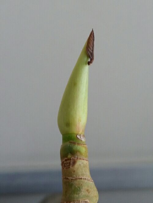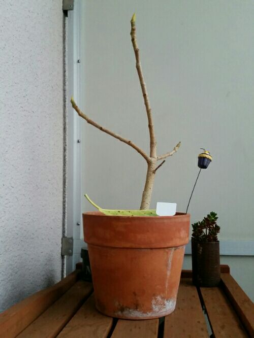 今日も日陰の我がベランダ。 徒長者も出現し先行きは極めて暗いが、そんななかでもパキポディム、デンシフローラムは今のところ順調に葉を伸ばしている。 3号鉢なのでまだまだ小さい株なのだが、それでもだんだん肥ってきて、貫禄のようなものさえ感じられる。 その、水をたっぷりと蓄えた塊茎はシルバーがかった独特の色と光沢を持ち、更に無数のトゲをつける。 そして天辺からは細長い葉っぱがワシャワシャ。 めちゃめちゃカッコイイじゃないか。 池袋屋上出身。 買ったのは2014年5月22日だから、もう2年うちにいる。 最初は細かったのだが徐々に肥り、今では下ぶくれのドッシリした体型に。 腹の出たオヤジは貫禄がある。 コイツにも似た雰囲気がある。 冬は葉が落ちる。 これは今年2月10日。 葉が2枚しか残っていない。 うち1枚は赤く、落ちる寸前だ。 滑稽な姿だが、これはこれで面白い。 冬場、デンシフローラムは室内で基本断水する。 すると、塊茎内の水分が徐々に減ってくる。 まるまると肥っていた塊茎が痩せていくのだ。 4月3日。 2ヶ月ぐらい断水するとこうなる。 スリムな体型になっているが、このぐらい全然平気。 水をやると元のでっぷりオヤジに戻る。 うちのデンシフローラムは冬休眠していないのか、冬場も完全丸坊主まではいかなかった。 最終的には葉を1枚残したまま4月末に新芽を出してきた。 残っていた1枚も最後は枯れ落ちたのだが。 休眠したら完全断水するつもりだったのだが葉が付いていたため、塊茎がへこんできたら20mlぐらいの小量を水やりしていた。 月イチぐらいかそれ以上間隔を開けていたと思う。 葉もだいぶ出揃った。 あとは陽をたっぷり浴びて生長するだけなのだが、あいにく日照ゼロ。 去年も一昨年も夏は土が乾いたら即タップリ水やりしていたのだが、今年は乾かしぎみにせざるを得ない。 陽も当たらないのにジャンジャン水やってたら腐ってしまう。 今年の夏はずっと日陰だが、頑張ってくれ、デンシフローラム。 足場撤去になったらまたタップリ陽を浴びせてやるからな。 にほんブログ村