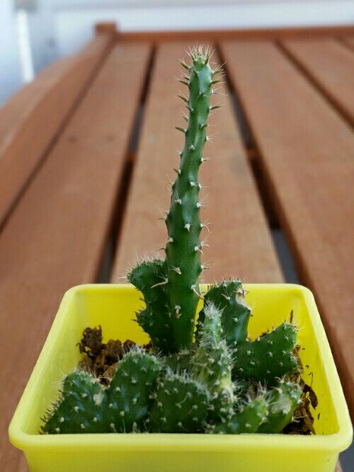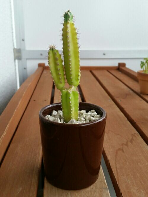 毎日何かしら具合の悪そうなヤツを発見してしまう今日この頃。 今日も朝からパトロールだ。 調子の悪そうなヤツはいないか~? シワになっていないか~? しおれていないか~? などとつぶやきながら巡回する。 変態だな。 先日記事にした翁団扇に目が止まる。 しおれてぐったりしていたのだが、うん、だいぶシャキッとしてきた。 どうやら水切れだったようだ。 コイツはかなりの水好きだとアドバイスを頂いた。 もう少しデカい鉢に植え替えてやろう。 すぐに水切れならないようにするのだ。 翁団扇と同時に購入したサボテンがある。 おなじみの黄色の角プラ鉢に植えられた綴化サボテンだ。 1本ひょろりと伸びる枝。 綴化していない枝だ。 コイツは長くなっている。 どのぐらい伸びたか購入時の画像と比較してみよう。 フムフム。 だいぶ伸びてるな。 色も濃くなった。 変わらない部分と伸びた部分が混在する。 全ての部分が生長するわけではないようだ。 なかなかイイぞ。 綴化サボテン。 今週末コイツも植え替えてやろう。 綴化サボテンはもうひと鉢ある。 珍しいので2個買ったのだ。 コイツも2、3箇所飛び出ているところがある。 生長したんじゃないの? 購入時の画像と比べてみよう。 う~ん。 そうでもないな。 一番飛び出ている枝は元からだったんだ。 しかし2番目に長い枝は購入時はない。 ところどころ生長するのね。 そしてところどころ焼けちゃってるね。 徐々にひなたに出したつもりだったんだけど甘かった。 綴化モノって初めて買ったんだが面白いな。 どんな風に生長するのか予測がつかない。 これ、デカくなったら化けるんじゃないだろうか。 今年は生長させられなかったけど、来年はデカくしたいな。 にほんブログ村