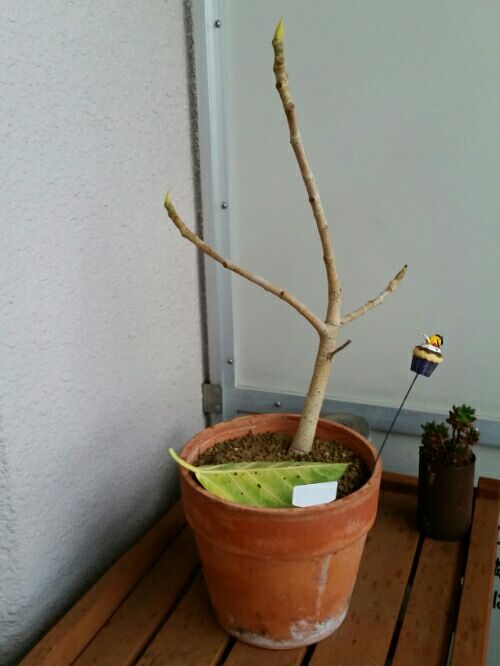 去年も一昨年も7月下旬から9月上旬までが生長期だったユーフォルビア、ホワイトゴースト。 今年は5月下旬から盆明けまで足場が設置され日照ゼロだったためだろう、全く生長しなかった。 昨日は最高気温でも22℃。 シャツ一枚では肌寒いぐらい。 もうすっかり秋。 ホワイトゴーストも生長しないまま冬を迎えるのか。 生長再開は来年7月。 長いなあ。 などと思っていたら、最近になって生長し始めた。 特にこの枝。 ところどころ蛍光ピンクになっているが、ここが生長を始めたのだ。 枝の先端からは新しい葉が、途中からは脇芽が出てきている。 脇芽の数も多い。 全部が枝になるとは限らないが、3、4本は枝になるだろう。 生長しているのは画像左側の長い枝。 右下の二股の枝も先端が生長を始めている。 一方てっぺんは、 本当はここが一番生長してほしいのだが、ここは全く生長していない。 背が高くなるのを望んでいるのに、ここが生長しなければ背が高くならないではないか。 しかし何故今頃生長を始めたのか? 8月17日に足場が取れてからはずっと日なたに置いていたが、それにしても最近は雨ばかり。 9月は日照時間がひどく少ないのに、何故か一部の枝で活発な動きを見せるコイツ。 だが、まあいいじゃないか。 今年は生長ゼロだとあきらめていたところに生長し始めたのだ。 喜ばしいことだ。 できればこの勢いでてっぺんも少し生長してくれるともっとうれしいのだが。 にほんブログ村