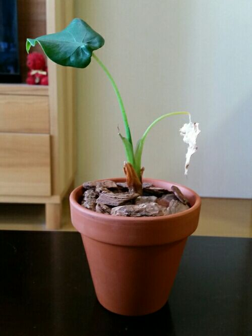 イモなしクワズイモを5月4日に植え替えた。 3号鉢だ。 この時点では2枚しか葉がなく、うち1枚は枯れている。 つまりマトモな葉は1枚だけの状態だったのだ。 しかもクワズイモの魅力であるイモはなし。 何も面白いところのない、ただの草であったのだ。 6月28日。 2枚目の葉が出て、さらに3枚目も出てきている。 7月25日。 4枚目の葉が出てきている。 植え替えた時はデカいと感じた3号鉢が小さく見える。 それにしても妙に茎が長くないか? 日照不足だったかもしれないな。 現在のクワズイモ。 2週ほど前に植え替えた。 3号鉢から4号鉢に昇格。 何だか巨大になってきた。 茎も長いが葉もデカい。 ほんの数ヵ月前までは小さい株だったのだが、今やセロームやパキラ1号と同等の大きさに。 これは5月4日、植え替え直前の姿。 2.5号ぐらいのプラ鉢に植わっていたのだ。 画像左下の空き鉢がそれだ。 デカくなったなあ、クワズイモ。 こんなに急激に巨大になるとは。 でもイモなし。 イモっていったんなくなると、ずっとイモなしなんだろうか? それともセロームみたいに徐々に茎が形成されていくのか? はたまた地中にイモができてくるのか? 全く分からないが、まあ、このまま育ててみよう。 いつかイモができるといいな。 イモあってのクワズイモだから。 にほんブログ村