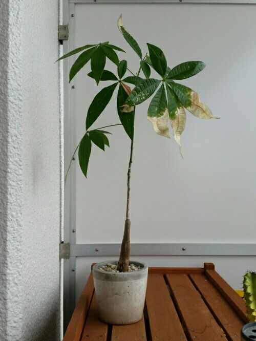 パキラ2号。 幹がシュルシュル~っと長く伸び上の方に葉を繁らせる。 理想的な形になってきた。 横から見ると幹は湾曲している。 鉢回しをせず曲がるように仕向けたのだ。 これも目論み通り。 だが、葉が…。 枯れ枯れだ。 台風9号だったか、2、3週前の台風のとき、大した風じゃなかったので外に出しっぱにしてたのだ。 これでやられた。 翌朝見ると葉はしおれてぐったり。 あわてて部屋に入れたものの時すでに遅し。 パキラはどうやら風に弱いようだ。 以前も寒風にやられたことがあった。 ただこのときは11月末。 風というより寒さに当たったことが原因だと思っていた。 しかし今回は真夏。 真夏でも強風に当たるとダメなのだ。 パキラ2号は2014年6月購入。 2.5号鉢に植えていた。 昨年5月、4号鉢に昇格。 今年は植え替えていないが、背も高くなったし、来年は5号昇格かな。 デカくなれよ、パキラ。 目標2メートル。 にほんブログ村