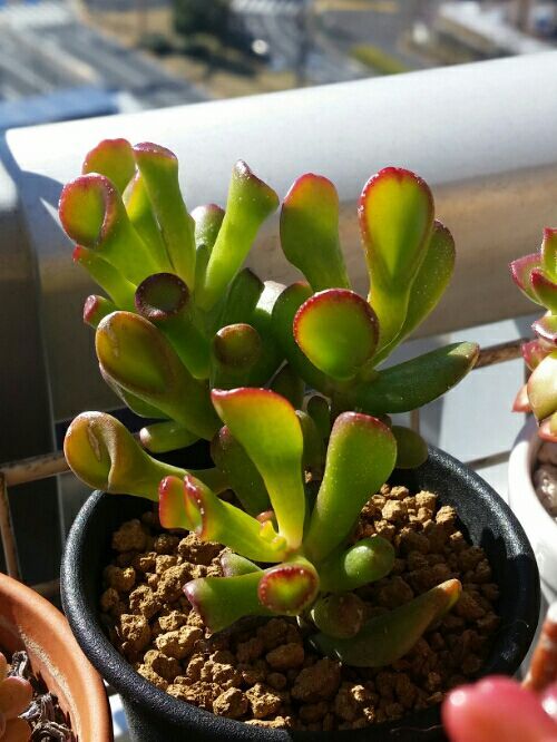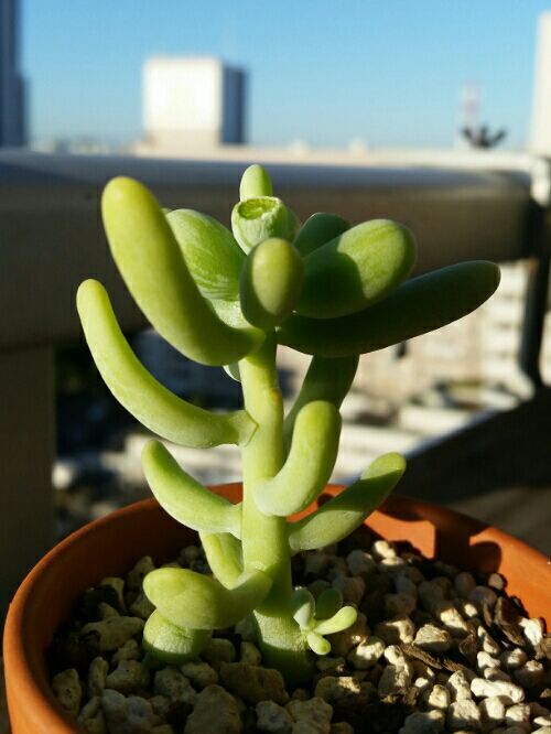 銘月を買ったのは2年前の2014年11月。 黄色いプラ鉢でおなじみダ○ソーの100円多肉だった。 100円でも紅葉する。 外で陽に当てると12月には綺麗な黄色に変化した。 これは綺麗だ。 買って良かった。 翌年2015年3月。 寄せ植えの一員となる。 火祭りの赤、テトラゴナの緑、ファンファーレの青とともにコントラストを見せる銘月。 だが8月になると全部緑になり地味なひと鉢に。 2016年1月。 再び紅葉。 いやあ綺麗だな。 しかし全体的に茎が伸びてきたな。 仕立て直すか。 5月。 単体で植えてみた。 いいじゃないか。 イエローとテラコッタ色はよく合う。 8月。 なぜか茎が曲がる。 色も緑に。 緑だと恐ろしく地味だ。 そして現在。 腰は曲がったままだが葉は増えた。 紅葉も綺麗だ。 ついに仔吹きも始まった。 枝ができるのだ。 いいぞいいぞ。 セダム銘月。 ベランダ最前列に配置。 水は週イチから2週に1回ぐらい。 寒さには強く去年も一昨年もベランダで難なく冬越し。 セダムでも乙女心やオーロラは真冬や真夏に下葉が枯れたりするがコイツはそんなこともない。 丈夫なのだ。 さてこれからどうしよう。 茎も伸びてきたし春にカットするか? それともこのまま伸ばし続けるか? 枝分かれして樹木のような姿になればいいのだが2年経過でようやく脇芽1個出ただけ。 木のような姿になるかは怪しいところ。 まあいいや。 どっちみち春にならないと何もできない。 ゆっくり考えよう。 にほんブログ村