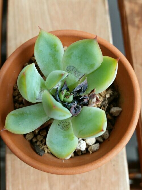 七宝樹を棚から落下させてしまったという記事を書いた。 だが棚から落下させてしまったのは七宝樹だけではなかった。 コイツもだ。 セダム天使の雫。 七宝樹は鉢が割れただけで済んだがコイツは折れてしまった。 葉ももげた。 せっかくここまで育てたのにショックだ。 だが折れたものは仕方がない。 断面が乾いたら挿してみるか。 葉は放置して様子をみよう。 根が出たら葉挿しにするか。 しかしこれから冬だというのに根が出るのか。 暖かい室内窓際に置くとしよう。 一方折れた元の方。 こんなになってしまった。 仕方がない。 脇芽が出るのを待つとしよう。 あっ! 既に出てるじゃん! 全然気がつかなかった。 初めての脇芽だ。 よし、これはこのまま育てよう。 いずれデカくなるはずだ。 在りし日の姿。 こうやって見るとカワイイ。 またイチから出直しだ。 頑張って復活させるぞ~。 にほんブログ村