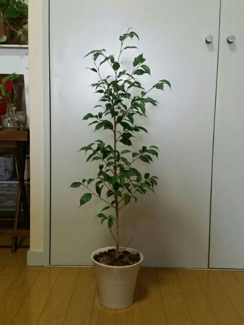 ベンジャミン。 今腰ぐらいの高さだ。 毎年4月ぐらいから10月ぐらいまで生長する。 最盛期は夏。 次々と葉を出してくる。 今年もよく生長した。 どれぐらい生長しただろうか。 過去の画像と比べてみよう。 これは5月4日の植え替え時。 現在。 20cmほど伸びただろうか。 枝はかなり増えボリュームが増した。 樹形も変化している。 5号鉢。 ホームセンターで買った鉢だ。 確か500円もしなかった。 だが模様がレトロな雰囲気を醸し出しており気に入っている。 毎年植え替えの度に鉢を大きくしている。 3号から4号へ、そして5号へ。 今5号鉢でちょうどいい。 来年6号にするか、それとも同じ5号にするか迷うところだ。 灰褐色の幹の色が好きだ。 この幹に緑色の葉がよく合う。 葉は小ぶりで少し波打つ。 もうほとんど生長していないが完全には止まっていない。 今も超ゆっくり新葉が出てきている。 ベンジャミン。 終日室内窓際。 水は今3週に1回ぐらい。 2メートルを目指す。 パキラやツピダンサス、アルテシマなども2メートルを目指しているが、ベンジャミンが一番生長が速い。 しかもずっと順調。 コイツが一番早く2メートルに到達しそうだ。 とはいってもまだ1メートルにも満たない状態。 2メートルに到達するのは、年20cmづつ伸びたとしても5年かかる計算になる。 しかし元々はわずか20cmぐらいのハイドロカルチャー苗。 大きくなったものだ。 にほんブログ村