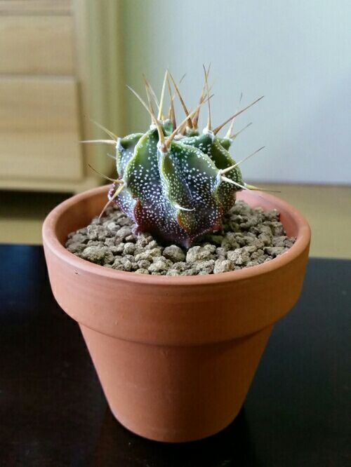 パキポディウム、デンシフローラム。 トゲトゲだ。 塊茎はシルバーがかった、ややメタリックな色をしている。 もう3週間ほど水やりしていない。 水やり直後はパンパンにふくらむが、体内の水分量が減るとへこんでくる。 今はまだへこんでいないので、まだ水はやらない。 かなりへこんできたら20~30mlぐらいやる。 恐らく次は12月末ぐらいになるだろう。 11月頭に始まった紅葉。 だいぶ進行してきた。 下半分ぐらいの葉が真っ赤だ。 いずれは茶色くなり落ちる。 今はミドリの葉も1月になると赤くなり、最終的には丸坊主になる。 だが丸坊主なのは1ヶ月ほどで、3月か4月には新葉を出してくる。 どっしりとした塊茎。 どんなカタチに変化していくだろうか。 デンシフローラム。 3号プラ鉢。 室内窓際。 晴れて7、8℃以上あるときは出社前ベランダに出し陽を浴び風に当たる。 帰宅後取り込み、夜は室内。 まだ花は咲いたことがない。 来年は咲いて欲しいものだ。 分頭し塊茎を更に太らせて欲しい。 まあ、そううまくはいかないかな。 でもいいのだ。 徐々に徐々に大きくなっていくのを眺めるのも楽しいものなのだ。 にほんブログ村