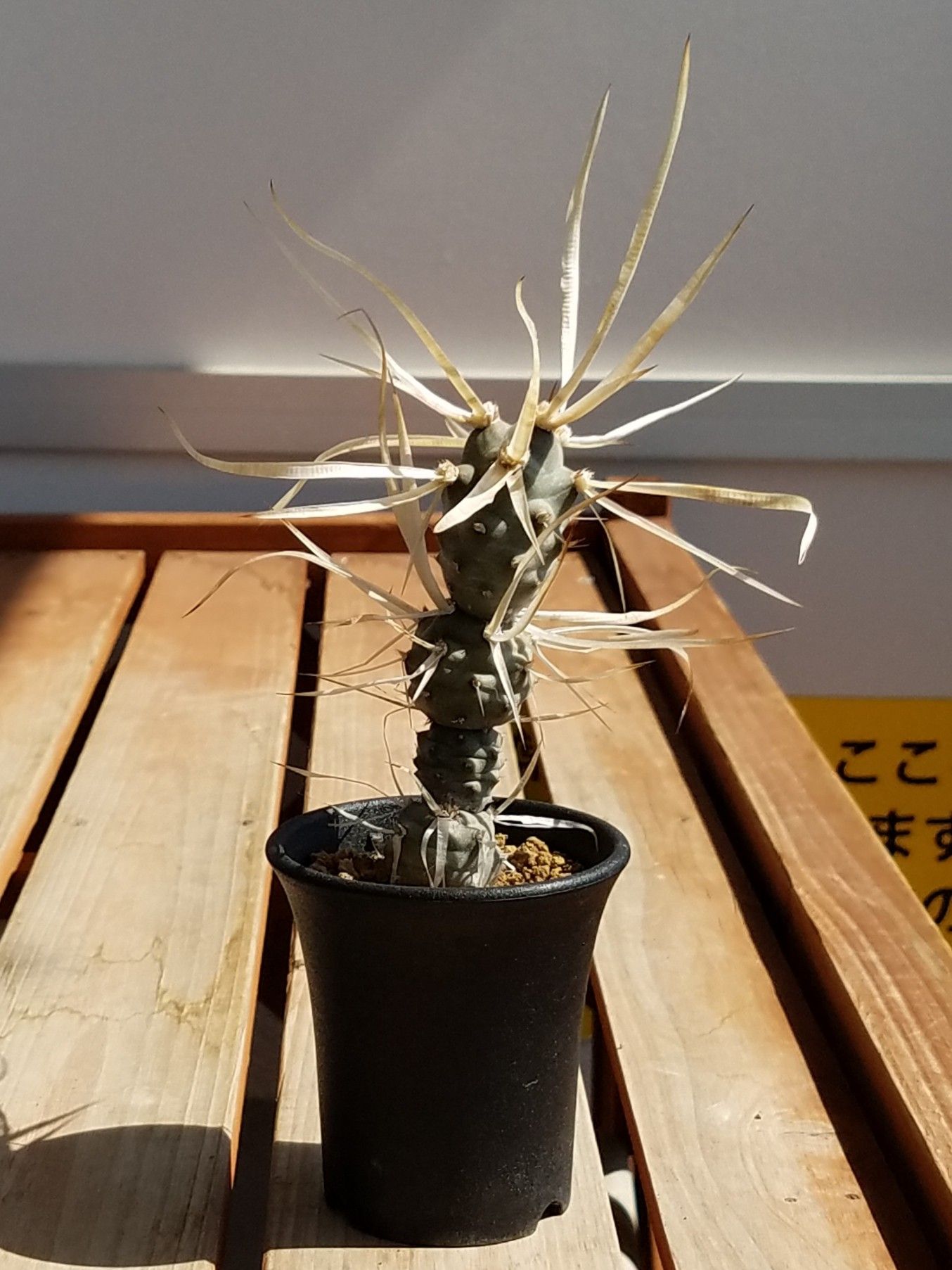 武蔵野。 ペラッペラの紙のようなトゲを伸ばす面白いヤツ。 玉のような茎節を連ね上に伸びていく。 どこまで上に積み重なるのか知らないがこの茎節、ポロっと取れやすい。 一番上の茎節はデカく重そうだ。 いつか取れてしまいそうだ。 実際下の方から出てきた茎節は何かの拍子にポロリと取れた。 ちょっとした力が加わるだけでも取れてしまうのだ。 どうせ取れてしまうなら取っちゃうか。 アタマせっかちだし絶対取れちゃうよなコレ。 案の定アタマは簡単に取れた。 簡単に取れるようになっているのだろう。 ポロっと落ち、根を出し、新たな茎節を出し、また落ち、増えていく。 多分そういう戦略なのだろう。 2年前の姿に戻ったかのような武蔵野。 春だし新しい茎節をまた出すことだろう。 どこから出すかな? まさかこの切り口から出てくることはないよね? 周辺の刺座あたりが有力かな。 コイツもいずれ植えてやろう。 武蔵野。 終日室内。 水は2週に1回たっぷり。 そう言えば。 1月12日に「シワッシワの武蔵野」という記事を書いている。 昼は外夜は室内にしていたらしわくちゃになったのだ。 しかしその後終日室内にしたところ元に戻った。 松笠ウチワも同じく終日室内にしたら戻った。 サボテンは来年から冬は終日室内にしよう。 にほんブログ村 サボテン:テフロカクタス 長刺武蔵野*幅12cm(刺の幅含む) 松笠団扇 サボテン:テフロカクタス モリネンシス 妖鬼殿 S*全幅2cm 【写真現物販売商品】テフロカクタス アンティーク風インテリア陶器鉢植え♪ 受け皿付き♪BS-10現品販売品 観葉植物 サボテン マニア系【楽ギフ_包装】【送料無料】プレゼント 開店祝い 新築祝いなどにも♪お買い物マラソン10%オフセール ゲオメトリクス