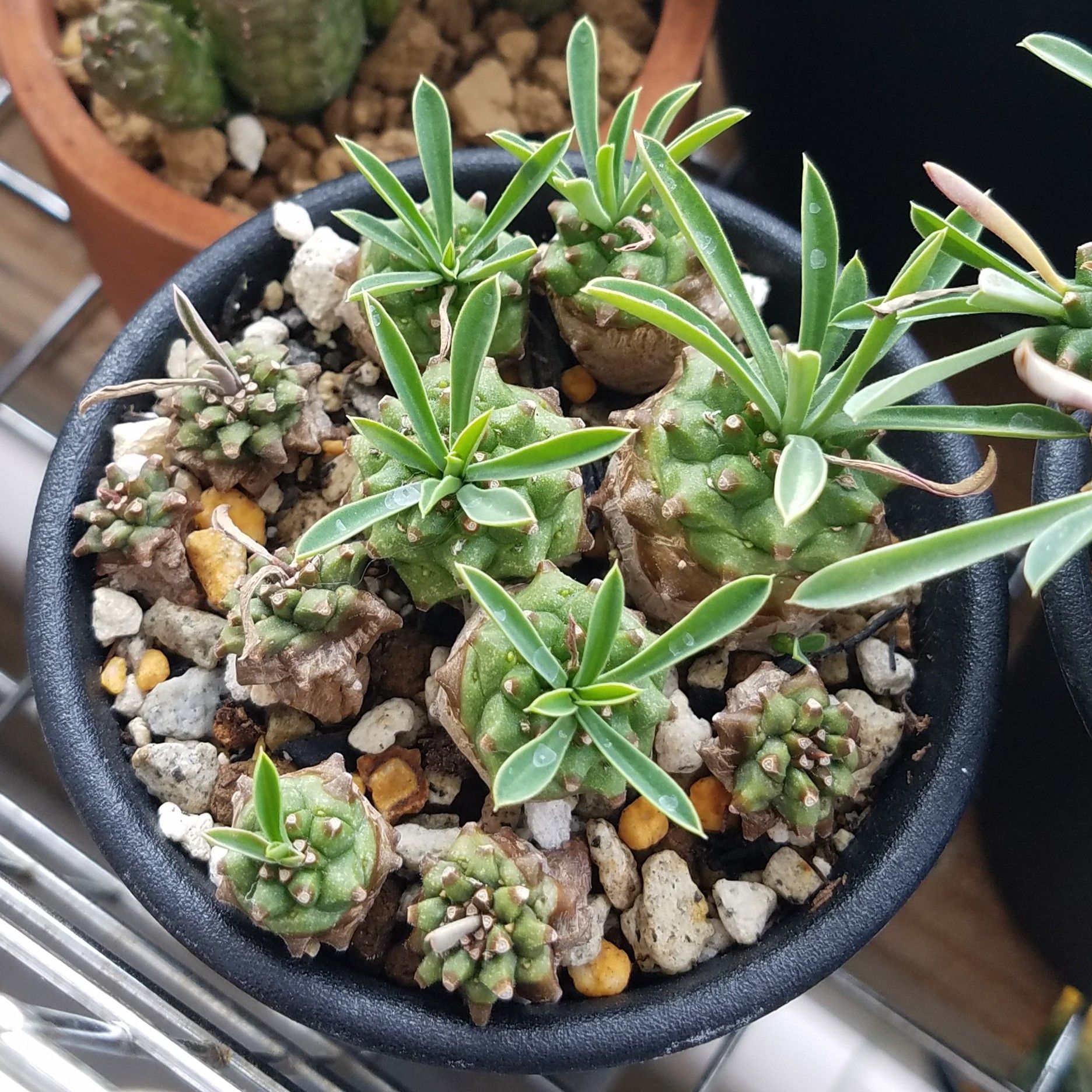 ユーフォルビアはほとんど夏型。 冬型もいるようだがうちにいるユーフォは全て夏型とされるもの。 紅彩閣などは夏に休み冬に生育するのでオレは冬型だと思うのだが世間では夏型とされている。 おそらくうちの環境(夏より冬によく陽が当たる)によるものだろう。 しかし夏型といっても生育する温度帯は種によって違う。 真夏にならないと生育しないものと春ぐらいから生育を始めるものがあるのだ。 ホワイトゴーストやキブウェゼンシス、グランディアラータは7月ぐらいに生育を開始するが、白樺キリンやミルクブッシュ、レウコデンドロンなどは3月ぐらいから動き始める。 峨眉山もそう。 比較的早い時期から動く。 そしてこういうヤツらは冬に葉が枯れて丸坊主になってしまうこともない。 これが現在の姿。 下葉はある程度枯れているがかなりの葉が残っている。 ホワイトゴーストなどの高温性グループに属するヤツらは冬には完全に葉を落とし生きているのか死んでいるのか分からない姿になるが、コイツは青々とした葉を残し元気な姿を見せてくれている。 しかし枯れ葉はちょっと見苦しい。 取っちゃうか。 さわるだけでポロポロ落ちるぞ。 大ざっぱだがある程度枯れ葉を落とす。 ちょっと男前になったな。 でもナナメだね。 去年5月の植え替え時に根上がりで植えたのだがアタマでっかちな上に根はショボいのでやっぱりナナメってしまう。 今年は根上がりはやめよう。 もうひと鉢の峨眉山。 去年の植え替え時に仔を取ってひと鉢に詰め込んだものだ。 一見元気そうに見えるが、実は半分ぐらいしか元気じゃない。 上の5個は根も張り青い葉を出しているが下の6個は葉を落とし縮こまっている。 元気なヤツらはいいとして、このショボくれ野郎ども。 コイツら昨年5月に掻き取ったからもう10ヶ月。 もう根は出ないのではないだろうか? だが揺すってみるとグラグラしないヤツもいるぞ。 根が出てるみたいだ。 とするともう少し暖かくなったら葉を出し成長を始めるのかもしれない。 これは昨年10月21日。 鉢をひっくり返してしまった時の画像だ。 このときほぼ全部鉢から飛び出したがこの一個だけ出なかった。 根が張っていたのだ。 で、他のヤツらはというとこの通り。 ほとんど根が出ていない。 掻き取ってから5ヶ月。 5ヶ月経っても根が出ないのだ。 何だコイツら? 根出せよ!根! しかしその後一部のヤツらは根を出し水を吸って成長を始めた。 それがコイツらなわけだ。 ユーフォルビア峨眉山。 昼はベランダ夜は室内。 水は2週に1回じょうろでひと回し半。 丸い本体に仔がぐるり。 細長い葉っぱを繁らせる面白いヤツ。 いいなあ峨眉山。 やっぱ好きだわコレ。 にほんブログ村 多肉植物:ユーフォルビア 峨眉山(がびざん)*葉幅4cm ユーフォルビア 峨眉山 ユーフォルビア峨眉山多肉植物9cmポット ユーフォルビア・ステラータ ユーフォルビア キリンドリフォリア+ plants monsters pot | 塊根 花 インテリア おしゃれ 人気 ギフト プレゼント 観葉植物 自宅 室内 リビング 飾り 祝い 誕生日 結婚 人気 新生活 棚 贈り 卓上 オフィス 可愛い 珍しい 育てやすい 鉢