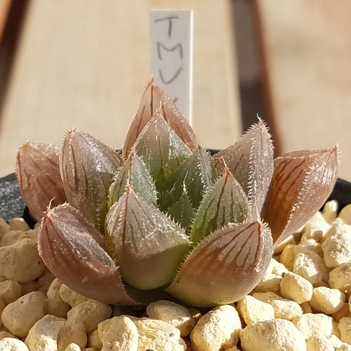 今年1月。 購入間もない頃のTMV×PV。 赤い。 葉脈も赤ければ窓部分も赤い。 中心部に緑は残るが全体が赤い。 この赤さが気に入って買ったのだが現在はかなり変化している。 青くなったのだ。 葉脈は紫に。 窓は青く。 かなりの変化だ。 コイツが元々何色なのかは分からない。 そもそもTMV×PVという暗号のような品種名すら何だかよく分からない。 ネットの情報によると(テネラマジョール×ベヌスタ)×ホワイトフォックスらしい。 なるほどTM=テネラマジョール、V=ベヌスタ。 しかしホワイトフォックスはPVじゃないんじゃないの? White FoxつまりWFになるんじゃないの? よく分からん。 まあ名前の由来はどうでもいい。 姿カタチが気に入っているのだ。 青いレンズ。 光に透かして見ると非常に美しい。 そこに下から伸びる紫の葉脈。 よく見ると葉の縁には細かいトゲ状のものが生えている。 さらに観察するとトゲ状のものは葉の縁だけではなく、 裏や表面にもある。 これは中心に向かうほど顕著になる。 外葉はそうでもない。 ということはこれからさらにケバケバ葉が出てきて最終的にはかなりのケバケバ野郎になるということかもしれない。 マジョール、ベヌスタ、ホワイトフォックス。 いずれもケバケバ野郎。 その血を引くコイツも多分ケバケバになるのだ。 TMV×PV。 室内窓際置き。 水は2週に1回たっぷり。 2.5号ミニラン鉢植えのコイツ。 まだ小さい。 デカくなったらもっと面白い姿になるかもしれない。 どのくらいデカくなるかは不明だが。 にほんブログ村 マジョールハイブリッド ハオルチア属 【ジュエルプランツ】多肉植物 9cmポット ハオルチア 特選タイプベヌスタ | 多肉植物 新生活 育てやすい インテリア おしゃれ 人気 ギフト プレゼント 観葉植物 自宅 室内 リビング 飾り 祝い 誕生日 結婚 美容院 開店祝い 贈り物 オフィス グリーン 可愛い 珍しい インスタ オススメ デスク 玄関 棚 ハオルチア ベヌスタ 多肉植物 3号鉢 おしゃれ かわいい ni1ハオルチア 白雪絵巻D(白雪姫×ベヌスタ)×巨大レッドレンズオブツーサ NS-1/1 多肉植物 ハオルチア 7.5cmポット 【送料無料】 ハオルチア クーペリー ヴェヌスタ変種 Haworthia cooperi venusta 【3号鉢】多肉植物 観葉植物 サボテン