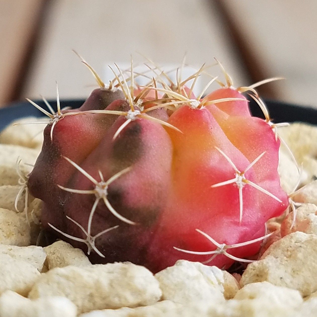 翠晃冠錦。 蛍光ピンクに濃い緑、ところどころオレンジも混ざり非常に美しい。 水もよく吸っており十分にふくらむことでキレイな曲線が作られている。 しかしコイツ、緑が減ったな。 以前は半分ぐらい緑だったぞ確か。 ちょっと確認してみよう。 昨年9月。 やはり。 半分以上が緑だ。 再び現在。 こうやって見ると、元々緑だったところがピンクに変化している部分もあることが分かる。 いまや7割がた斑だといっていい。 これは成長遅いだろうな。 葉緑素が少ないんだもんな。 まあいいや。 ついでにもうひと鉢の翠晃冠錦も見ておこう。 2個植えのこの鉢では右の大きい方が元気だ。 プクプクにふくらみ新トゲも出ている様子。 斑の割合は低いが、 蛍光ピンク、黄色、緑が入り交じりものすごくキレイだ。 一方左側は状態が良くない。 水を十分に吸っていないのかふくらみが足りない。 とっくの昔に成長期突入していると言うのにこの姿は何だ? パンパンにふくらんだらかなりキレイそうなのだが。 錦じゃないがついでに赤い翠晃冠も見ておこう。 全て赤だったコイツだが、だんだん緑が増えてきた。 最近成長した部分は緑だ。 直射光ガンガンなのだがそれでも緑。 昨年秋は赤いまま成長したのになぜ? よく分からないヤツだ。 このまま全ミドリになったりしないだろうな? ミドリだと全然面白くないぞ。 真っ赤だった頃。 やっぱこっちがいい~ にほんブログ村 翠晃冠錦 ◇ギムノカリキウム◇翠晃冠錦◇2寸鉢◇ 翠晃冠錦 翠晃冠錦 サボテン 翠晃冠錦 サボテン