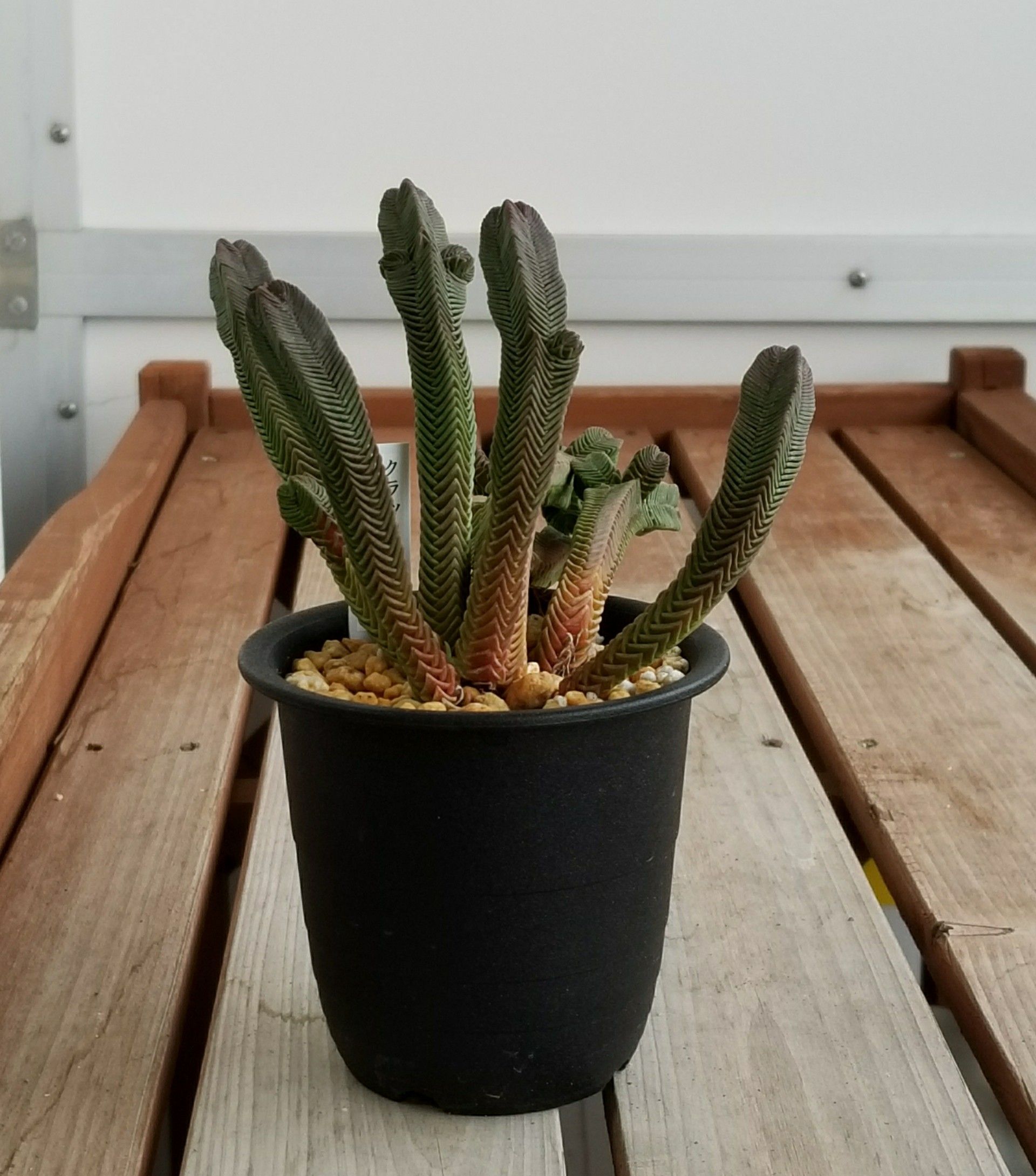 ナタリーはベランダ奥の棚。 日に数時間直射日光を浴びているが元気に育っている。 ふっくらツヤツヤ。 半日陰じゃなくても育つヤツは育つんだね。 11月19日。 現在。 あ、ちょっとだったね。 1ヶ月で2ミリ程度か。 寒い時期は成長しないんだね。 失礼。 でも元気そうで何より。 雪うさぎピグマエアも奥の棚で元気そう。 葉の丁面は盛り上がりふっくら。 11月24日。 現在。 これも成長は少しのようだね。 花芽が少し大きくなっているかな。 筋斗雲。 いいじゃないですか。 赤っぽい色に透明のブツブツ。 コイツはベランダ柵裏。 半日陰的な場所にいる。 9月25日。 現在。 3ヶ月でこの成長。 遅いと言わざるを得ないが元気だからいいのだ。 ま、ハオルシアの成長速度はおおむねこんなもんのようだな。 もう確認するのはやめだ。 ブルーダイヤモンド。 柵裏置き。 黒っぽい色だが丁面には透明のギザギザが密集している。 ダイヤモンドと言われればそう見えなくもない。 面白い質感だ。 水晶101。 焼けて赤黒くなっているがツヤもありいい状態。 網目模様もいい。 柵裏置き。 翡翠ピクタ。 ロゼットは整っていないがツヤツヤでふっくら。 ちょっとくすんだミドリの色もいい。 コイツも柵裏。 柵の丸い穴越しに当たる光がちょうど良いのだろう、柵裏のヤツらが一番状態がいい。 皇妃和之宮。 ピンクと白と茶が入り交じった微妙な色合い。 丁面には透明のツブツブがびっしり。 質感もいいじゃないか。 ハオルチアの3分の2は終日ベランダ。 夜は冷えるが特に問題はない。 さすがに成長はほぼしてなさそうだがダメージが出たりするヤツはいない。 もっともヤバそうなヤツはすでに室内に入れている。 葉がへこんだり焼けすぎなヤツ。 そういうのが出たら随時取り込んでいるのだ。 しかし1月2月は終日ベランダだと厳しいかもしれない。 0℃近くまで下がる日も出てくるだろうしマイナスに突入する日も出るかもしれぬ。 そんな日は夜だけ取り込んだ方が良さそうだ。 にほんブログ村 多肉植物 niハオルチア NS1(チョコバー×ウィミー交配種)×ブルーダイヤモンド実生選抜 IK No.1 実生苗 多肉植物 カクタスニシさん苗 ハオルチア 0611-043 現品販売 7.5cmポット 多肉植物 niハオルチア MR(silviae×GM452 N1スプレンデンス)×splendens(Rollason)実生苗 多肉植物 カクタスニシさん苗 ハオルチア 0904-79 現品販売 7.5cmポット 多肉植物 niハオルチア 烏城(スプレンデンス交配黒肌)×NS1/1(ティファニー×パルテノンA)実生苗 多肉植物 カクタスニシさん苗 ハオルチア 0904-63 現品販売 7.5cmポット 多肉植物 ハオルチア黒ピクタ実生特選ギャラン7.5cmポット ◇ハオルチア◇ピクタ◇3寸鉢◇ 多肉植物 niハオルチア インペリアル(シルバームチカ×特白ピクタ)×ピンクパールピクタ 実生苗 多肉植物 カクタスニシさん苗 ハオルチア 0611-045 現品販売 7.5cmポット 多肉植物 ハオルチア黒ピクタ実生特選ギャラン7.5cmポット ◇ハオルチア◇ピクタ◇3寸鉢◇ 多肉植物 niハオルチア インペリアル(シルバームチカ×特白ピクタ)×ピンクパールピクタ 実生苗 多肉植物 カクタスニシさん苗 ハオルチア 0611-045 現品販売 7.5cmポット