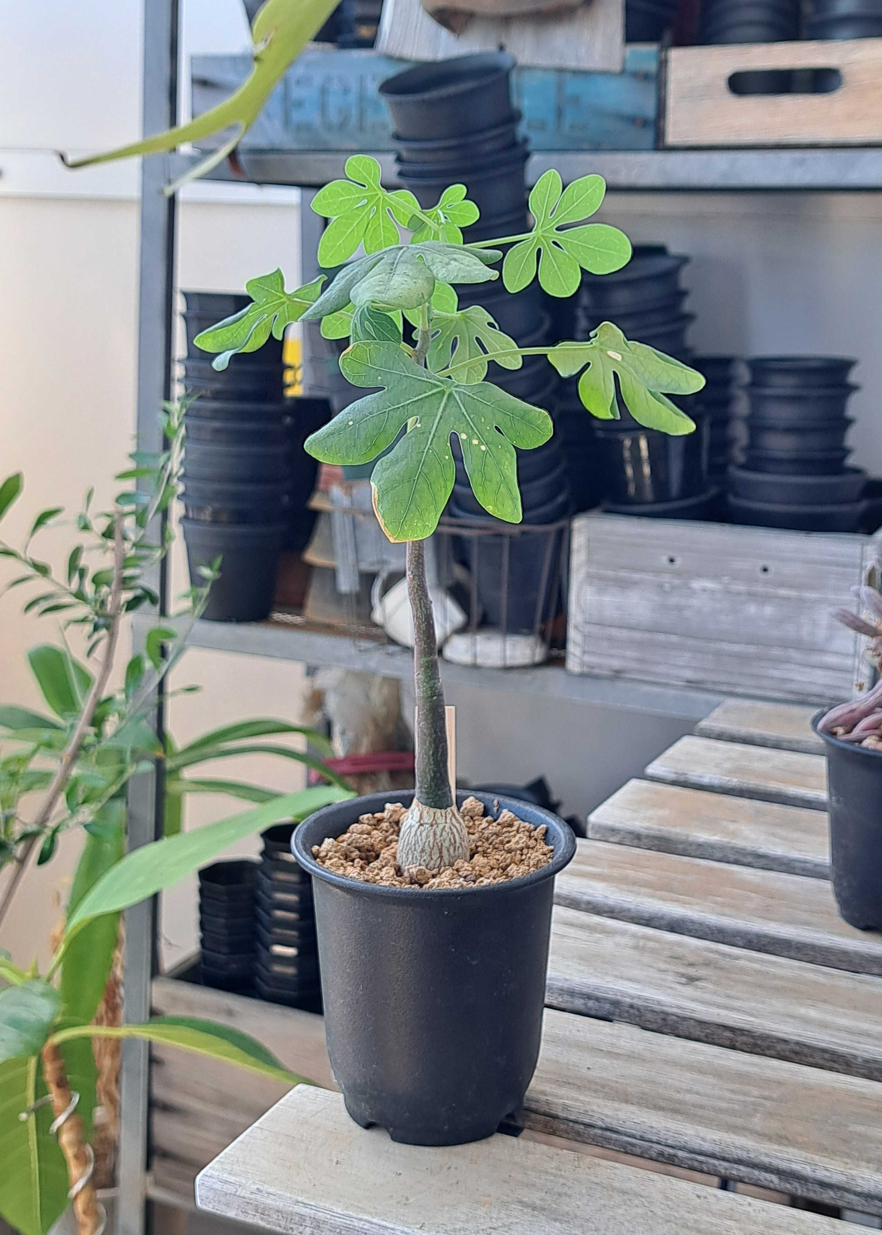 ボンバックスは外置きより室内置きの方がよく育っているがアデニア・グラウカはどうだろう。室内置きの1号。うん。いい感じ。葉はピンと張り元気そう。塊根があって、そこからすーっと茎が伸びてっぺんに葉を茂らせる。よくある形態だがこれぞ王道。多肉じゃないけどパキラなんかもこうなるから好きなんだよね。てっぺんの拡大画像。きれいな緑色の部分が今年成長したところだろう。先端には出たばかりの小っちゃい葉も。順調であることが分かる。直射日光が当たらない室内の窓際。人がいる時間帯は冷房で涼しくなる。これで順調ということは暑ければ暑いほど良いという高温性植物ではないということか。水は週イチ程度。室内置きの2号。コイツもまあいい感じに育っている。葉に張りがあり状態が良い。新葉も出ている。今の環境で合っているように思える。しかし…外置きの3号。おっと、様子が違うぞ。葉に張りがない。うなだれている。外置きで直射日光にもガンガン当てているので土が乾くのが早く、その分水やりも多めにしているのだがダメのよう。さらに葉焼けも。う~む。直射ガンガンはダメなようだ。日陰に移そう。で、様子を見る。外の日陰と室内、どちらが良いか検証するのだ。室内でもいいのだが、できれば外で風に当てて育てたい。さて、どうなるか?変化が出たらまた記事にする。☆特価☆多肉植物:アデニア グラウカ*S 塊幅1.8cm ☆赤松実生コーデックス:アデニア グラウカ 3個セット*塊根幅1.8cmグラウカ[ アデニア グロボーサ Mサイズ @30000] 塊根植物 多肉植物 盆栽 観葉植物コーデックス:アデニア プセウドグロボーサ*塊根幅18cm 現品!一品限り