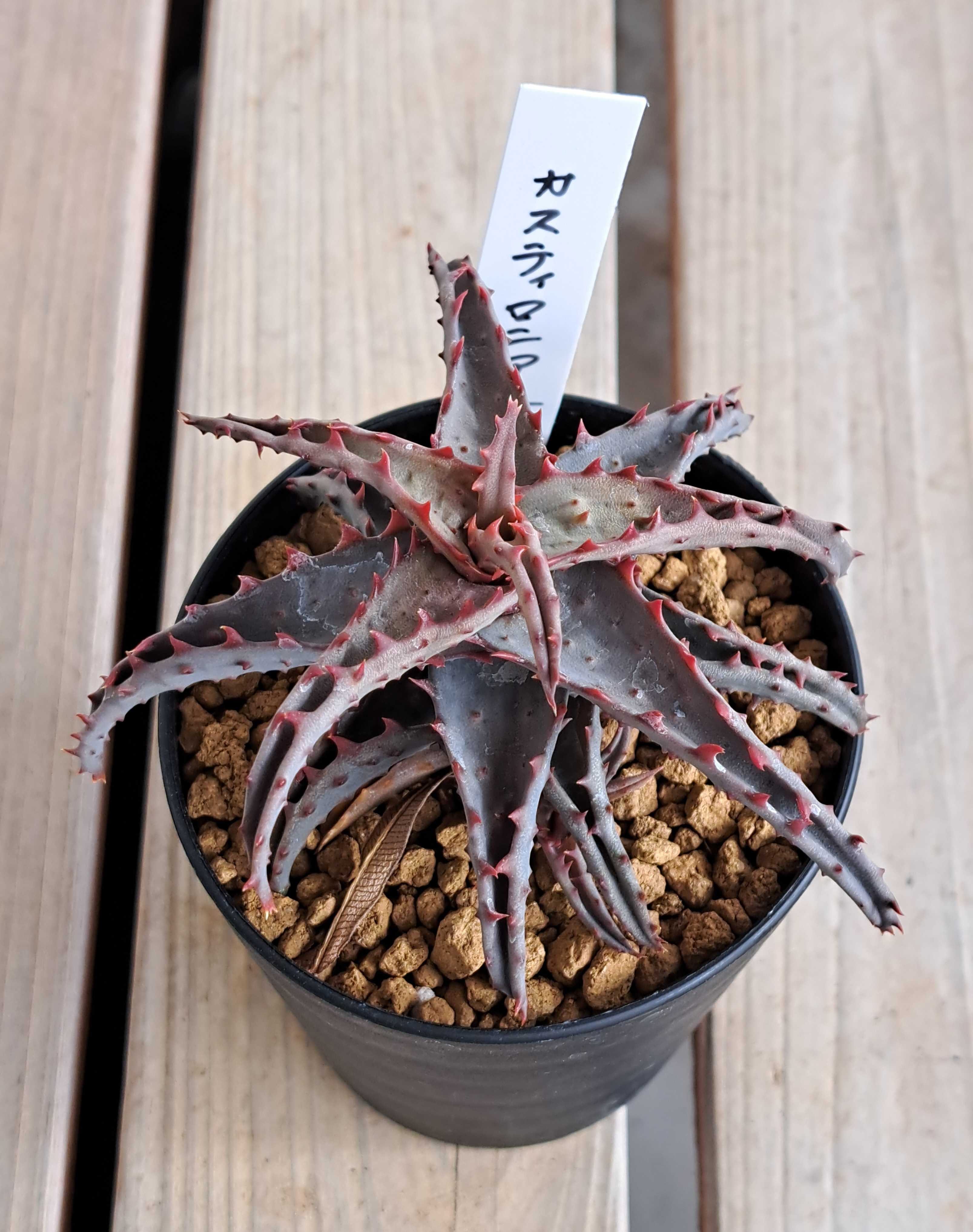 冬は赤かったアロエ・カスティロニアエ。今はすっかりミドリ。よく成長している。新しい葉がどんどん出て上に積み重なっていく。横から見るとこんな具合。だいぶ背が高くなったのではないだろうか。ちょっと確認してみよう。これは昨年10月21日の購入時。いや、だいぶ違うね。背がかなり高くなっている。1.5倍ぐらいか。成長早いな。直近の成長具合も見ておこう。上からの比較で。6月12日。現在。ふむ。まあまあか。中心部左上と下の葉が伸び右上に向かって新葉が出ている。でも全体に葉が内巻きだね。水が切れているのか?前回の水やりから2週間弱。2週に1回では足りないのかもしれない。よく成長しているし週イチやってみるか。置き場は引き続きベランダ最前部でいいだろう。しっかり日に当て風に当てて育てる。葉が積み上がることで迫力が増している。ミドリの肌と赤いトゲのコントラストも素晴らしい。カスティロニアエ。良いアロエだ。\怪獣/ 多肉植物 スターアロエ カスティロニアエ 1鉢4号 ピンクのプラ鉢入り【お届け中】Aloe castilloniae 多肉 多肉苗 観葉植物 多年草 常緑性 寄せ植え 鉢植え カラーリーフ ガーデン ガーデニングアロエ・カスティロニアエ 9cm鉢 カクタス長田 多肉植物 ススキノキ科 珍奇植物 サキュレントプランツ ロゼット ノギ マダガスカル原産観葉植物/[ザ・ファームセレクト]アロエ:カスティロニアエ 3.5号ロング(多肉植物)アロエ カスティロニアエ 3号(1ポット)