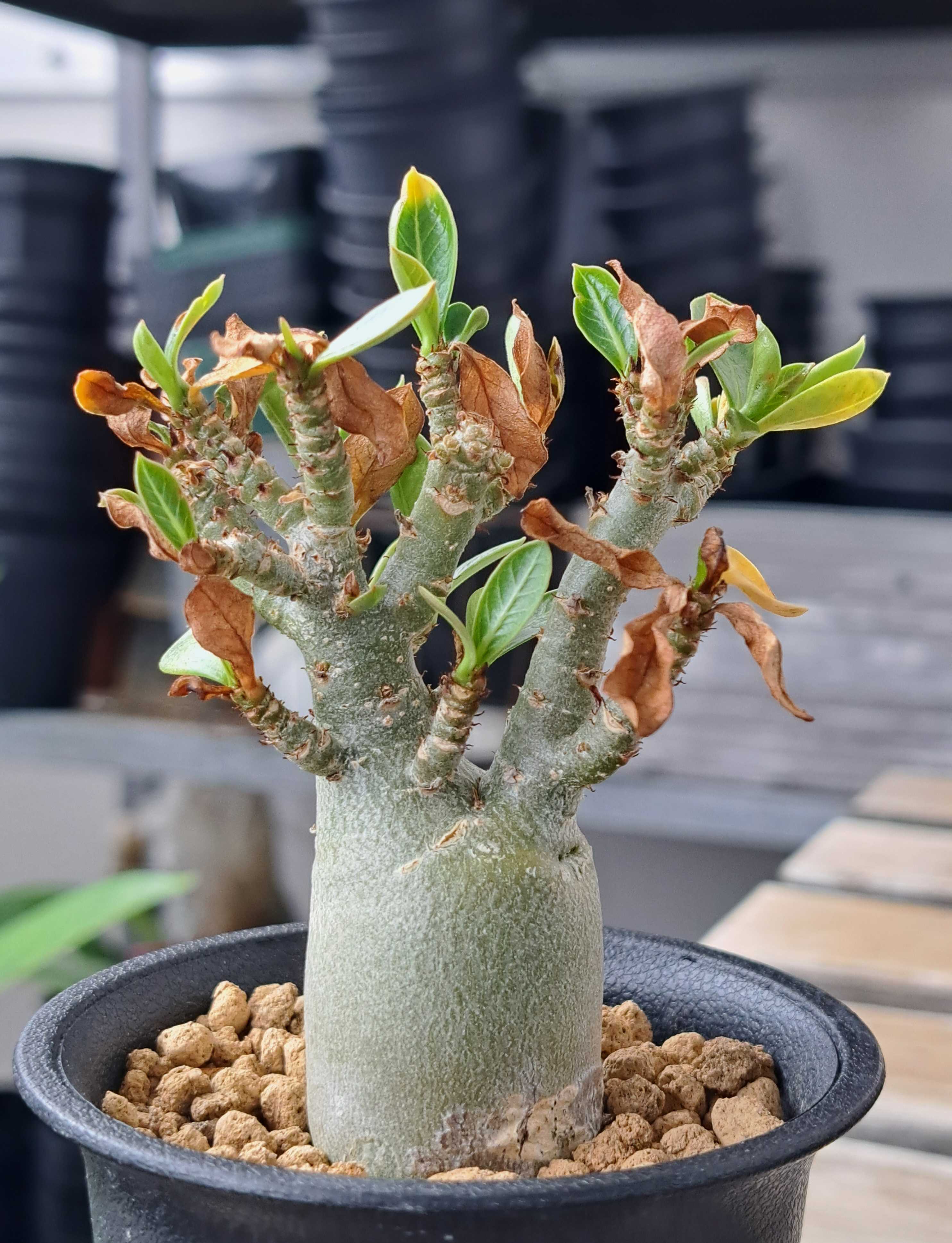 アデニウム・アラビカムの葉が枯れてきた。おいおい。何だよ今ごろ?成長期真っ只中じゃねえのかよ?でも、たまにあるんだよな、こういうの。寒くもないのに葉を枯らす。原因はよく分からないが、暑すぎるとか直射日光が強く耐えられないとか、そういうことなのかね?ただ、あまり心配はいらない。新葉は次々出てくる…はず…多分。このアラビカムも葉が赤い。直射日光をガンガン当てているからだろうか、ちょっと焼けているように見える。いやムシかな?アラビカムの葉にはムシ、おそらく葉ダニがつくことがある。まめに葉を洗ってときどき薬剤を散布しよう。多分それで大丈夫だ。コイツはほぼ大丈夫。ただ、右端の葉が枯れつつある。ひょっとしてコイツもこれからワーッと枯れるのか?多少枯れてもいいけどね。塊茎や根が腐らなければ復活するだろうから。なんともないヤツもいる。他のアラビカム同様ベランダ最前部で直射日光をガンガン浴びている。これが普通だと思うのだが、何で枯れるヤツが出てくるのか?パキポディウムも同じように直射ガンガンだが葉が枯れるヤツはひとりもいないし過去にも例がない。だが、アデニウムは今の時期に限らず葉が枯れることがある。生え変わるのか?古い葉は落ち新葉が出る?よく分からんが塊茎まで枯れたことはない。特に心配する必要はないだろう。この塊茎。素晴らしい。パキポも良いけどアデニウムも良いね。観葉植物/アデニウム:アラビカム 2.5号鉢植えアデニウム・アラビカム 4号 丸鉢【観葉植物 多肉植物 インテリア グリーン 4寸 おしゃれ ギフト プレゼント かわいい コーデックス 塊根植物 アラビクム 熱帯植物 ベランダ ガーデニング 屋外】送料無料(北海道・沖縄・離島除く)観葉植物/アデニウム:アラビカム 4号鉢アデニウム アラビカム 3.5号プラ鉢 塊根植物 観葉植物 鉢植え 寄せ植え 室内装飾 飾り 雑貨 インテリア 玄関 リビング 暮らし プレゼント お祝い かわいい おしゃれ 誕生日 お花 ギフト 結婚祝い 開店祝い お中元 お歳暮【送料無料】アデニウムアラビカムドワーフ 4号 塊根植物 アデニウム アラビカム ドワーフ 鉢付き キョウチクトウ コーデックスアデニウム タイソコトラナム 選抜品種 観葉植物 希少 塊根植物 BHMS バムズ インテリア植物 希少観葉植物