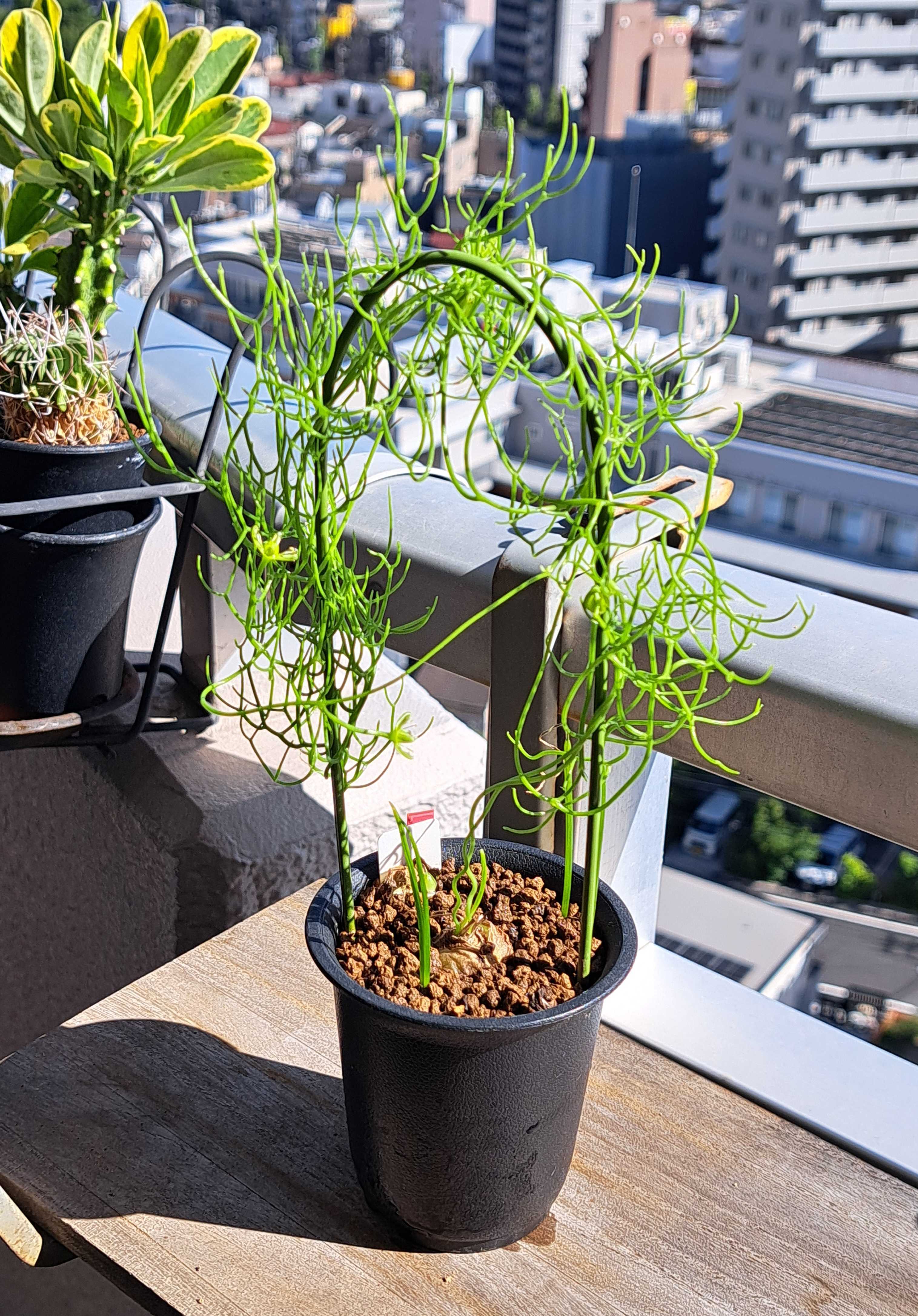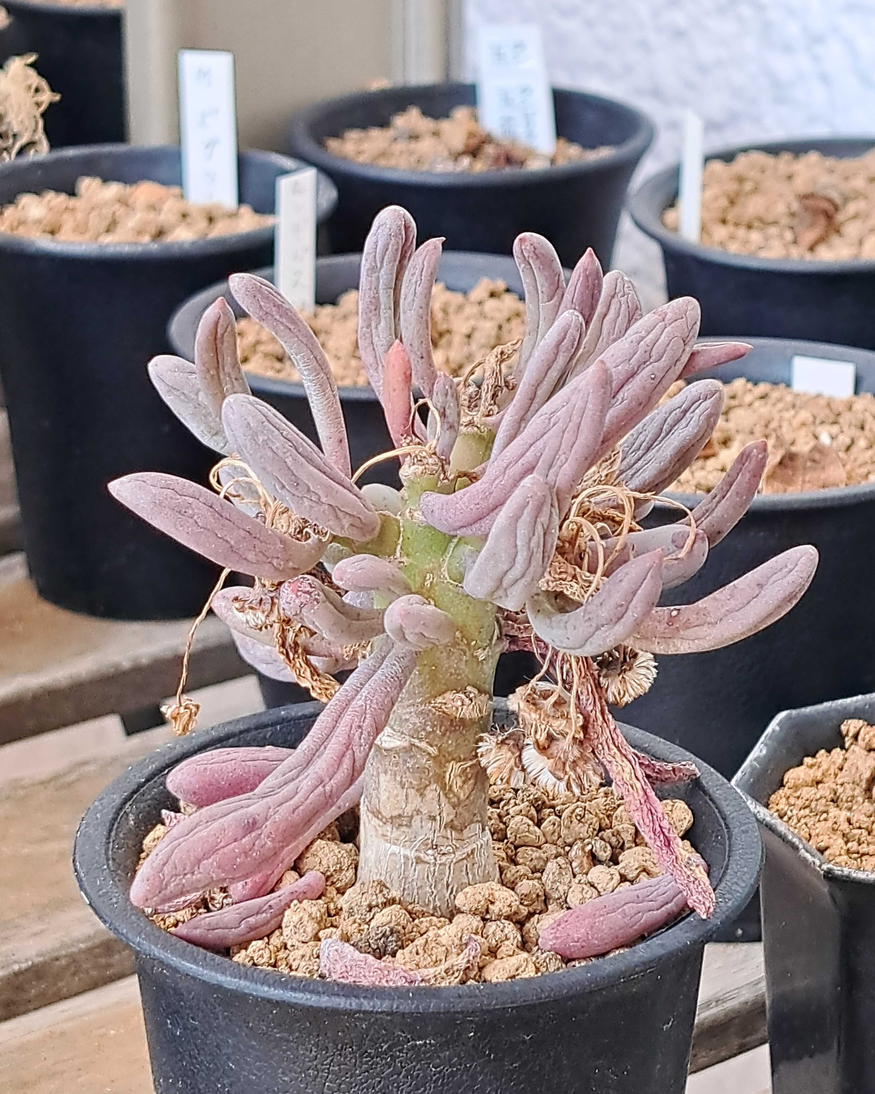 枯れたのはコイツの足。ユーフォルビア・フラナガニー。ひょろひょろの足が一斉に枯れた。少し前までどうもなかったのだが、ここ数日であっという間に枯れた。枯れたのは下葉、いや葉ではないな…下枝というべきか、下の方の古い枝。去年もうひとつのフラナガニーもこんな感じで古枝を枯らしたから自然現象なのだろう。ひょろひょろ枝は徒長していてみっともなかった。これで締まった良形になるから、かえって良かった。新しく太い枝だけが残った。塊茎もよく見えるようになったし、まさに激変と言えよう。もうひとつのフラナガニー。コイツが去年夏に足をいっぱい枯らしたヤツ。その後締まった足を出してきてこのようなカタチになった。今年は足を枯らさないのかな?いや、枯らしている。横から見るとこの通り。下葉ならぬ下足が枯れ乾燥してベビースターみたいになっている。ある程度下足を枯らしながら成長する性質なのだろう。上の方からは新たな足が生えてくる。こうやって成長していくわけだな。なるほど。タコものついでにイネルミスも見ておこう。足は4本と少ない。実はコイツ春頃新しい足を出しつつあったのだが、なぜか枯れた。枯れ枝が4本残っている。手前の2本は生き残った。理由が分からん。ただ、全体に影響はなさそうで新たな芽も出てきている様子。もうひとつタコものついでにゴルゴニス。コイツもイネルミス同様足の数が少ない。ちょっとひょろひょろ気味…すなわち徒長気味か?一部の足が黄色くなりつつある。枯れるのかな?まあでも新しい足も生えてきていることだし問題ないだろう。タコものユーフォルビア。まだまだ分からない点が多い。ユーフォルビア・フラナガニー 4号【孔雀丸 観葉植物 かわいい 卓上 デスク おしゃれ インテリア グリーン ビザールプランツ 棚上 卓上 テーブル ガーデニング レア品種 希少 珍しい】送料無料(北海道・沖縄・離島除く)多肉植物:ユーフォルビア フラナガニー 孔雀丸 ダブルヘッド*全幅18cm(多肉植物)ユーフォルビア イネルミス 九頭竜 3号(1鉢)ユーフォルビア イネルミス 3.5号 プラ鉢 九頭竜 種類 コーデックス 塊根植物 販売 土 鉢 種 観葉植物 多肉植物 タコアシ 珍奇 ビザール プランツ 屋外 室内 花 販売 多肉 観葉 植物 ギフト 開店 新築 結婚記念日 贈り物 プレゼント 記念日 誕生日 お祝い 鉢物(多肉植物)ユーフォルビア ゴルゴニス 3号(1鉢)【Euphorbia ユーホルビア ゴルゴニス(実)】管理方法付き3号鉢 サボテン 多肉植物 希少 珍奇植物 レア 珍品 珍しい インテリア 観葉植物 グリーン 人気 おうち時間 プレゼント ギフト おしゃれ 新生活 引っ越し 新築祝