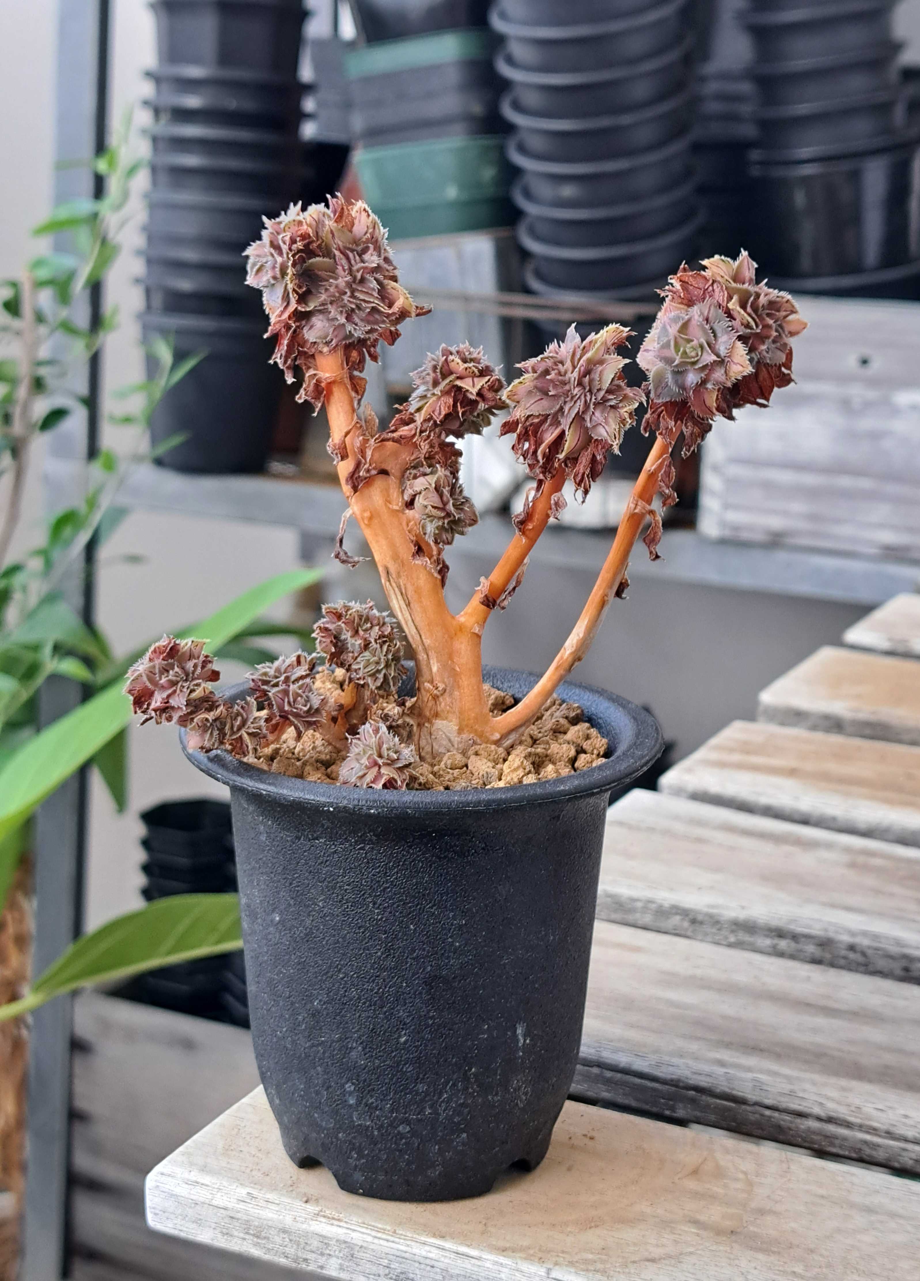 昨日に続き今日もプレクトランサス。去年エルンスティを枯らしたあと店で発見したテヌイフローラスだ。購入時はこんな感じだった。昨年10月24日。塊根からツルが伸び葉を茂らせる。なかなか良いじゃないか。と思っていたら3月16日。ツルが結構伸びちゃうのね。ちょっとジャマ。この際切ってスッキリさせよう。ということでカット。おお~。塊根もよく見えるようになっていいじゃん。ツルはまた伸びるはず。伸び過ぎたらまた切ろう。と思っていたら現在。ヤベっ。枯れて来てる。下から枯れ進み葉は少ししか残っていない。これは…去年枯れたエルンスティを思い起こす。コレだ。エルンスティ昨年7月31日。葉がポロポロ落ち残りわずかになった姿。奇しくも時期はちょうど今ごろ。この後復活することなくエルンスティはお亡くなりになったのだった。テヌイフローラスもやべえぞ!室内に入れよう。これしかない。夜温が下がらない外はマズイ。室内のエアコンで涼しい時間帯を作ってやらねば。今日からオマエは室内組だ。さて、もう一個のテヌイフローラスはどうだろう?今年3月16日。コイツもツルをカットしスッキリさせた。そして現在。アレ?こいつは元気そうじゃん。下葉はある程度枯れているが葉はかなり残っている。ツルも少し伸びてるね。まあでも室内かな。外は危険だ。室内で涼しく過ごせる時間を作ってやるのだ。入れる前にもう一回よく見ておこう。1号。やっぱヤベエわコイツ。まさかすでに死んでたりしないだろうな。涼しく過ごさせ様子を見る。2号コイツは大丈夫だろう。ポツポツ緑色の芽が出てるし。でも念のため室内で涼しく過ごさせる。プレクトランサスって夏型だよね?なんか冬型っぽいな。ま、○○型ってのも当てにならんけどね…。姫紅小松(トリコディアデマ・ブルボスム) メセン ビザールプランツ 多肉植物 サボテン アガベ 塊根植物 ユーフォルビア 寄せ植え インテリア 観葉植物 おしゃれ 雑貨(観葉植物)モナデニウム ルベルム 4号(1鉢)コーデックスコーデックス:ブルセラ ファガロイデス*葉幅16cm ☆I氏実生 現品!一品限り