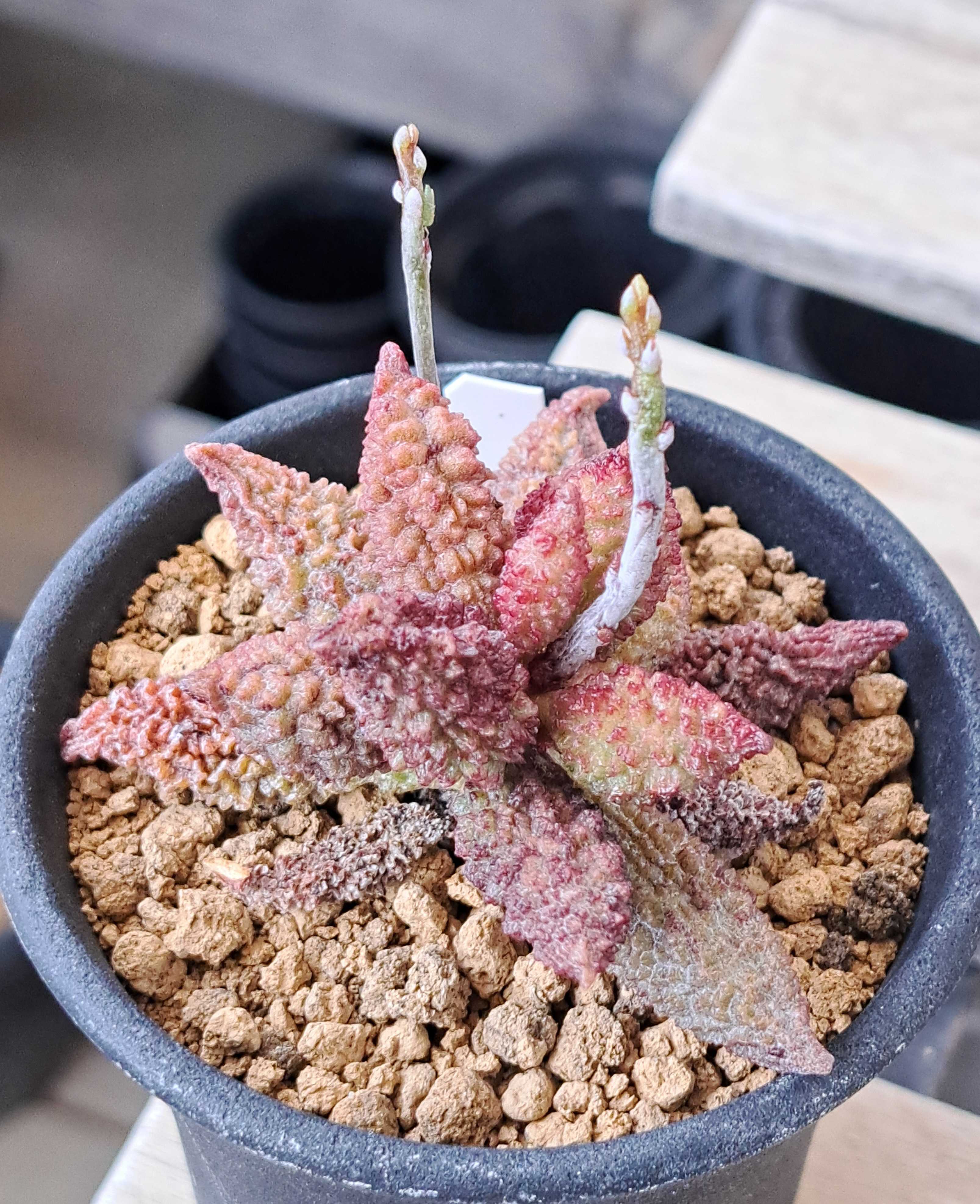 プセウドリトス・ミギウルティヌス。花の上にハエがいる。この花強烈なニオイがする。このニオイに寄ってくるのだろう。そして受粉の手伝いをする。うまくできているものだ。花はもう一ヶ所別のところからも出ている。前回登場時はこんな具合。それが現在は満開に。ダークな色合い、ヒトデっぽい形、先端にはフリンジ。そしてウ◯コのニオイ。期待を裏切らないガガイモらしい花だ。全体はこんな感じ。去年は花を見ることはできなかったが、巨大な種サヤができたのは見た。今年もアレが見られるのか?実生ミギウルティヌスも確認しておこう。。変化はあったのか?6月23日。現在。大きくは変わらないが、それだけちょっとデカくなっているようだ。ブツブツが増殖し親株の特徴が出始めた。こうやって全身ブツブツになっていくのだな。コイツらはまだ4分裂ぐらい。このあと上のヤツみたいになるのだろう。植え替え後日陰、半日陰に置いているので緑色になった。そろそろひなたに戻してやるかな。プセウドリトス・ミギウルティヌス 7.5cm鉢 カクタス長田 ガガイモ科 多肉植物 コーデックス 塊根植物 サボテン 珍奇植物 サキュレントプランツ多肉植物 caプセウドリトス ミギウルティヌス 2.5号鉢 多肉植物 コーデックスペトペンチア・ナタレンシス (良型個体) 9cm鉢 カクタス長田 ガガイモ科 多肉植物 コーデックス 塊根植物 サボテン 珍奇植物 サキュレントプランツフォッケア・エデュリス 火星人 9cm鉢 カクタス長田 ガガイモ科 多肉植物 コーデックス 塊根植物 サボテン 珍奇植物 サキュレントプランツ