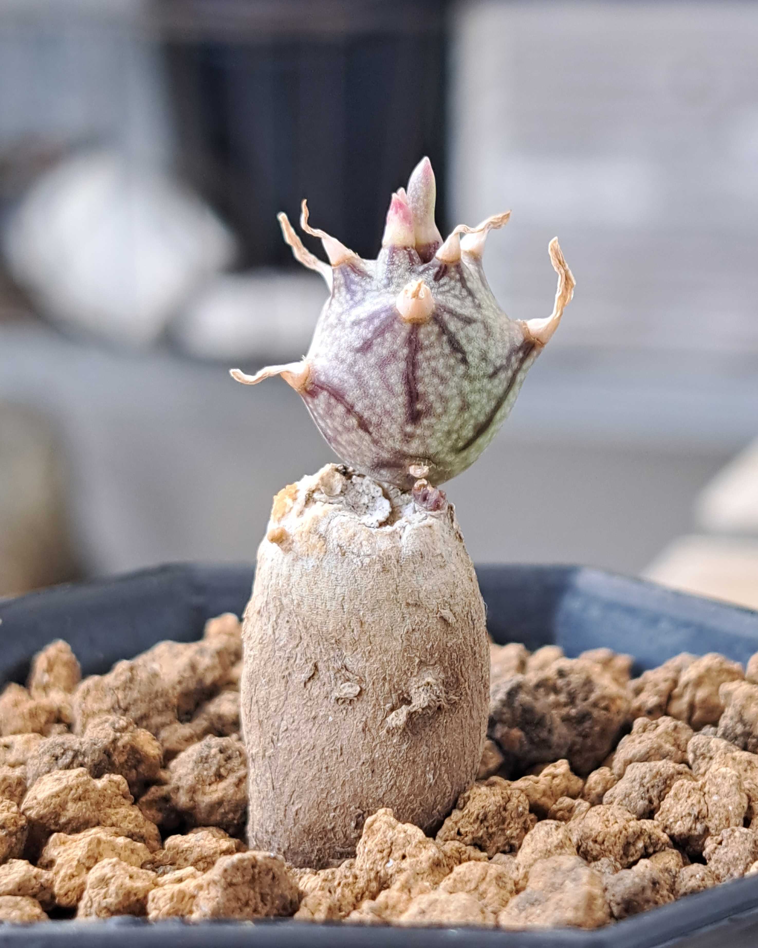 プセウドリトス・ミギウルティヌス。右側の花芽がデカくなり…開花したぞ!うわ~。さすがガガイモ。これまたキモチワルイ花だね~。星形でフリンジ付き、色は毒々しい濃紫。拡大してみよう。おお~。細部まで緻密に作り込まれているね。何か飾りもののようにも見える。これがどんどん咲いていくんだろうな。素晴らしい。そういやコイツの花って悪臭がするらしいが…ちょっと嗅いでみよう。臭っ!!!!!!これもう完全にウ◯コだ!この匂いでハエを呼ぶのか。いや大したもんだ。花芽は実はもう1ヵ所からも出てきている。前回登場時ひょっとしてココもか?と書いていたところだ。コイツらもいずれ咲くはず。花に戻る。この角度から見ると分かるのだが、花はつぼみの先端がパカッと開いたもののようだ…当たり前だが…。こぼれ種野郎はひとつ減りふたつ減りこれだけに。オレンジ色のヤツはもうダメだろう。つまり最後の一個。コイツだけはなんとか育ってもらいたい。実生の方は、日陰で一週間ほど過ごし現在は半日陰置き。一日2、3時間ほど日に当たる。変化はない。これからだ。多肉植物 caプセウドリトス ミギウルティヌス 2.5号鉢 多肉植物 コーデックスプセウドリトス・ミギウルティヌス 7.5cm鉢 カクタス長田 ガガイモ科 多肉植物 コーデックス 塊根植物 サボテン 珍奇植物 サキュレントプランツペトペンチア・ナタレンシス (良型個体) 9cm鉢 カクタス長田 ガガイモ科 多肉植物 コーデックス 塊根植物 サボテン 珍奇植物 サキュレントプランツマテレア・シクロフィラ 9cm鉢 カクタス長田 ガガイモ科 龜甲蘿藦 多肉植物 コーデックス 塊根植物 珍奇植物 コルク質肌