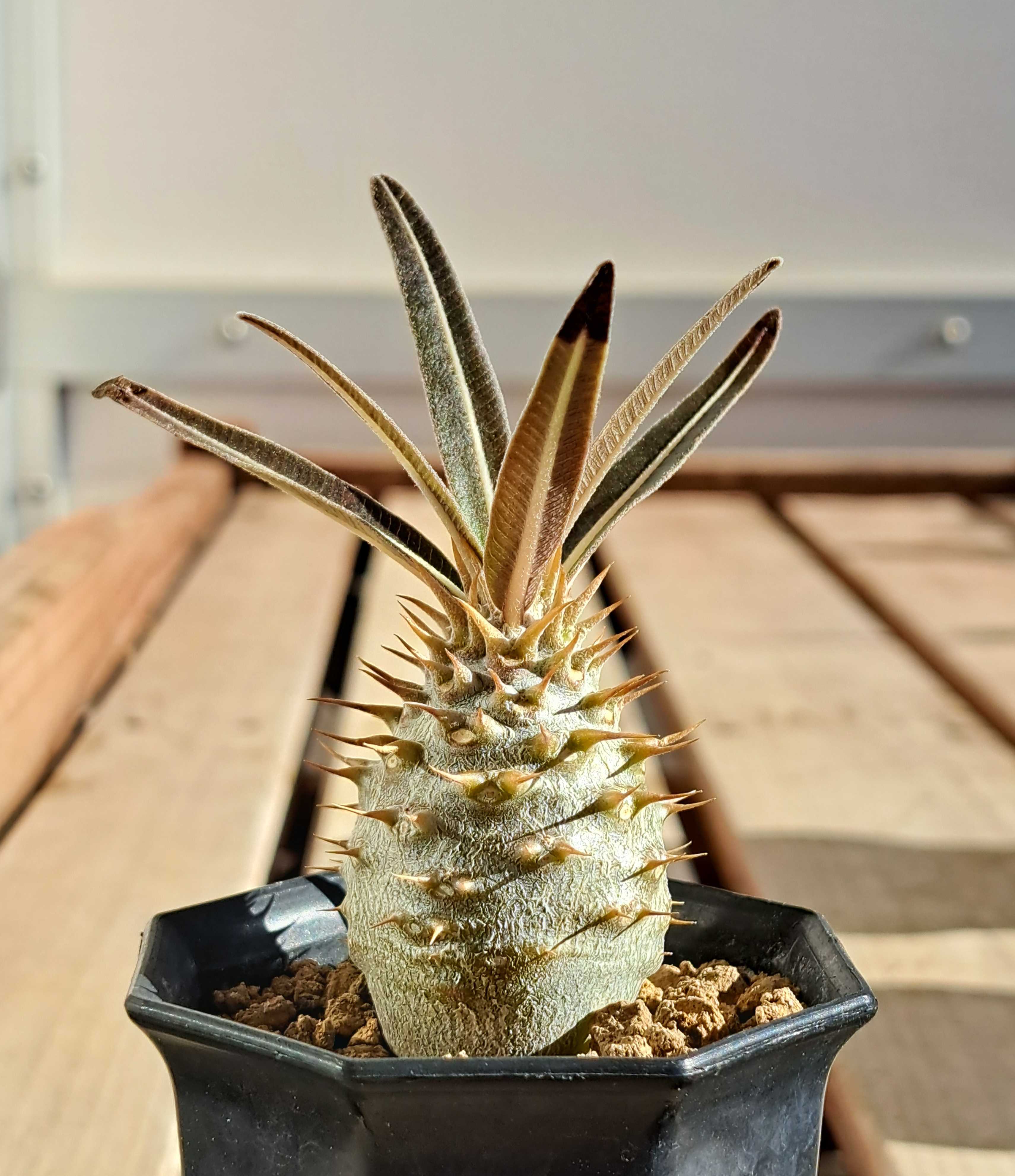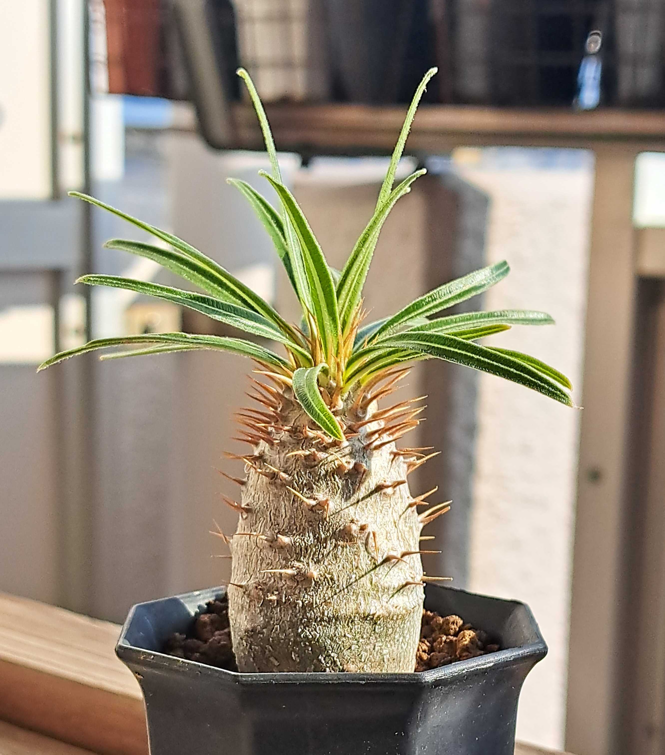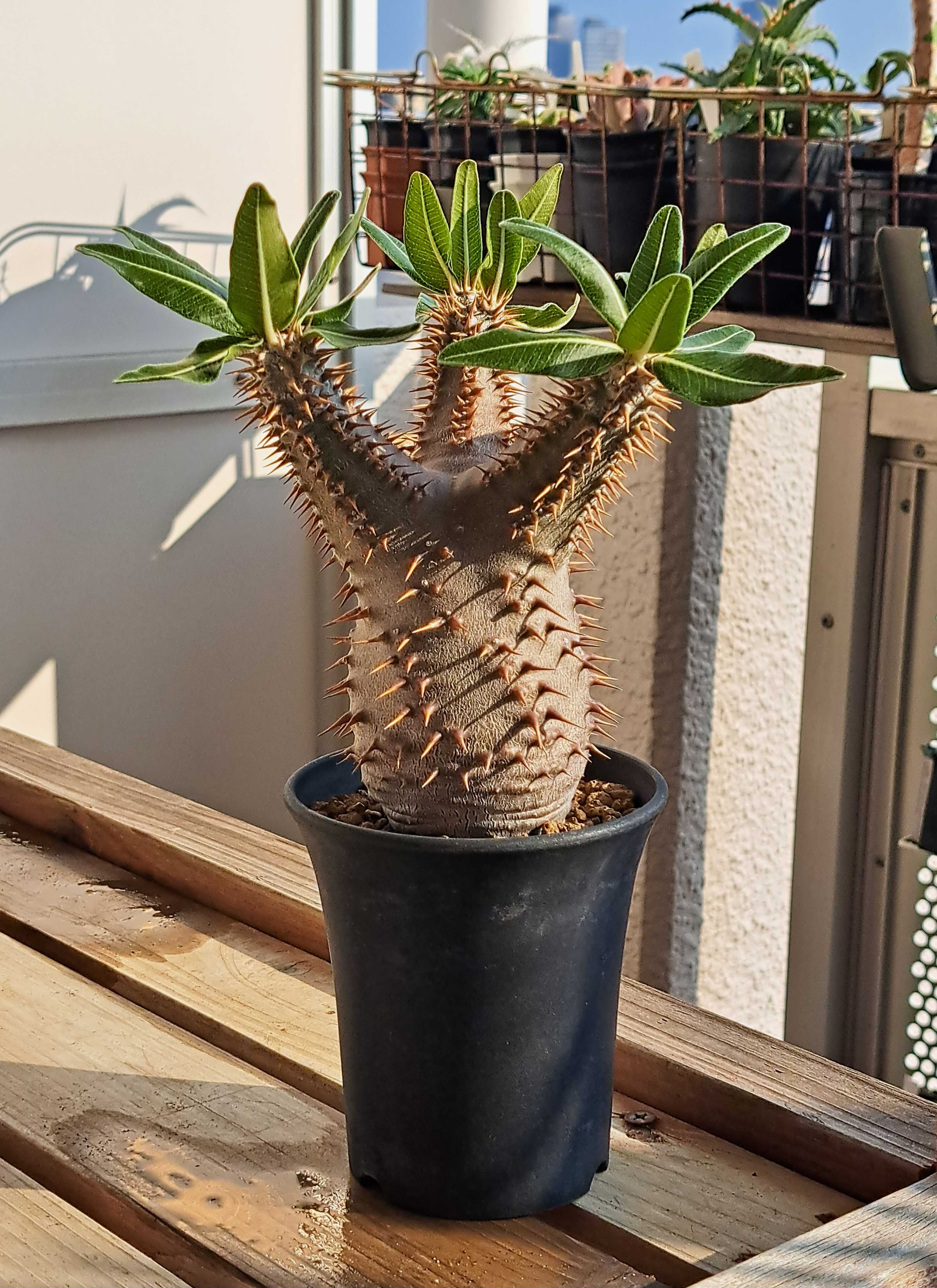久しぶりに小っちゃいグラキリスの様子を見てみよう。今日はグラキリスの小っちゃいヤツら。去年の春6個買ったのだが昨夏1個腐り現在は5個。夏のくそ暑いピークは過ぎたと思われるが夏越しはうまくいっているのか?早速見てみる。1号単頭。ふむ。コイツは順調そうだ。ミドリの葉が茂り塊茎も多分太っているのではないだろうか。7月25日の画像と比べてみよう。いや...あんまり変わらんか…あんまりというか全く変わってないんじゃ…コレ…成長してねえじゃん!塊茎が太ってないどころか葉も出てねえ。この1ヶ月半、ずっと成長ストップしてたんだ。ショック…。直射日光にたっぷり当て表土が乾いたら即水やり。表土はすぐ乾くのでほぼ毎日水やりしていた。かなりメンドクサイ。なのに…成長していなかったとは…。2号はどうだろう?7月25日。現在。やはり…。変わっていない。7月末から8月、9月アタマにかけて全く成長していない。暑ければ暑いほど成長するのかと思っていたが大間違いだったようだ。くそ暑い日本の夏には成長をストップする。塊茎が太らないだけじゃない。葉もショボくなるのだ。ショックを引きずりながら3号。7月25日。現在。どうだろう?若干葉が出ているように見えるが…。でも塊茎は全く変化なし。パキポって真夏は成長しないのか?多分そうなんじゃない?気付いていないだけでデカいデンシフローラムやグラキリス、恵比寿笑いなども動いていないんじゃないか?そんな気がしてきた。4号。7月25日。現在。明らかに成長していない。それどころか傷んでいる。葉は焼け、枯れ落ち、塊茎も焼け、カサカサにひび割れている。これはもはや日陰置きの方が良いのではないだろうか。5号。7月25日。現在。結論が出た。小っちゃいパキポ、とりあえずグラキリスの小っちゃいヤツは真夏は成長しない。毎日せっせと水やりしても1ミリも動かない。個体によっては長時間直射日光に当てるのも良くない。焼けるヤツは半日陰に移し夏越しさせる。そんなところだろうか。4号は半日陰に移そう。表皮がめくれ上がりダメージが強い。下手したら腐ってしまう。ここ数年で日本の夏は変わった。確実に暑くなっている。以前と同じ管理ではマズイのだ。40℃時代の管理に変えていかなければならない。コーデックス:パキポディウム グラキリス 発根済*塊根幅22cm 現品!一品限りパキポディウム グラキリス 8号 プラ鉢 塊根植物 土 種 鉢 コーデックス 象牙宮 プレゼント 種類 珍奇 ビザール プランツ 屋外 通販 送料無料 鉢物 観葉 多肉 ギフト 花 開店 誕生日 新築 結婚 記念日 贈答 お祝い 開業 植物 室内 オシャレ 販売 ガーデニング グリーン[ パキポディウム グラキリス 象牙宮 XLサイズ @80000] 塊根植物 多肉植物 盆栽 観葉植物(多肉植物)一点物 パキポディウム グラキリス 現地株 発根済み 7号(1鉢)(352524)コーデックス