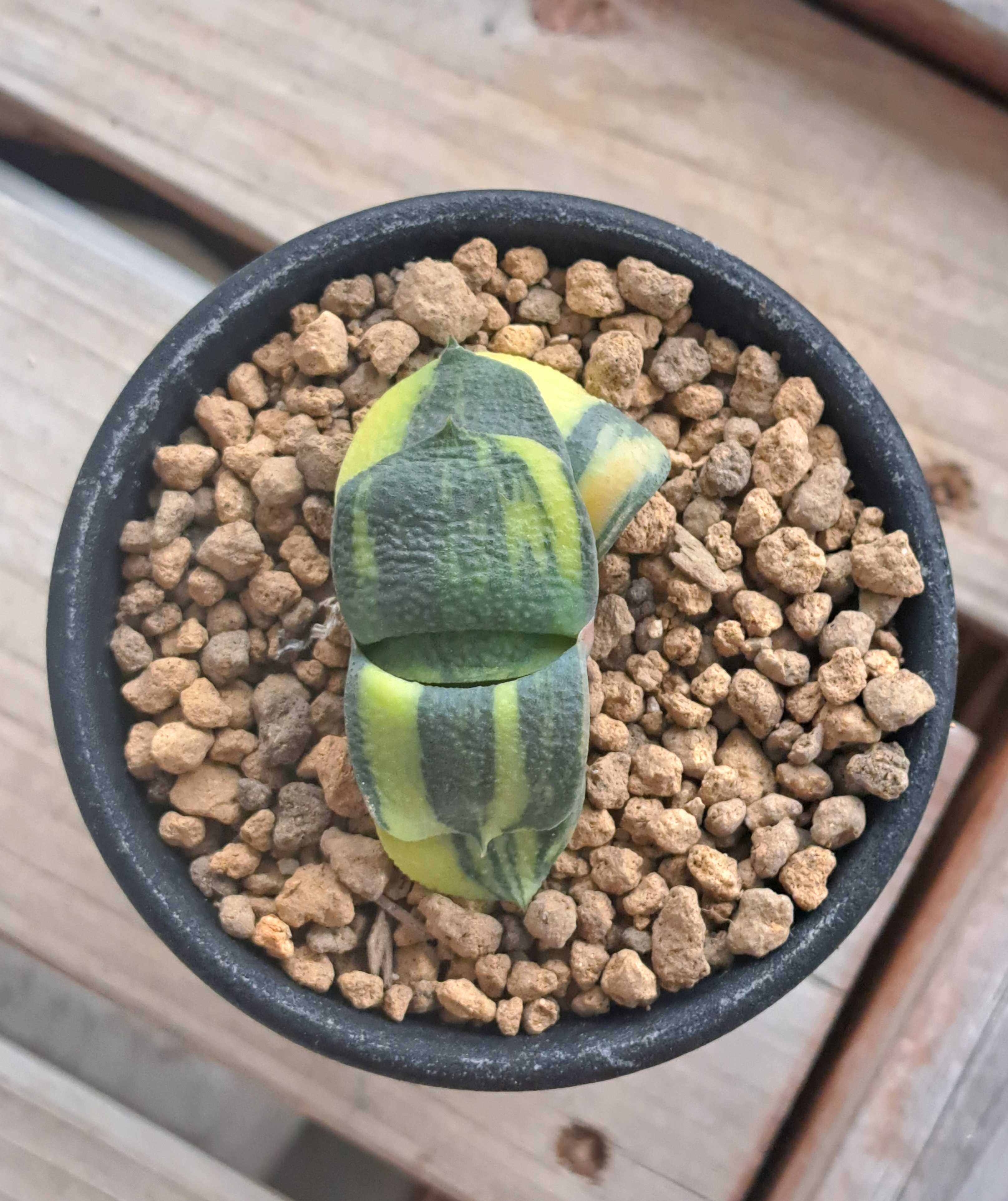 少し前に植え替えた臥牛錦。いつの間にか小さくなってしまったコイツ。何年も植え替えていなかったため根詰まりになったことが原因ではないかとコメントをいただいた。いや、確かに...。そういえば全然植え替えていなかったわ。全く気にしていなかった。植え替えて土を更新し2個植えから単独植えに。根を伸ばす余地を与えた。これで様子を見る。再び成長してくれるといいが。考えてみると他の臥牛もずいぶん植え替えていない。ここらで土を更新しリフレッシュさせてやるのがいいだろう。ハイッ、植え替え終了。根はどれもよく張っていて元気そうだったので撮らなかった。軍配臥牛。幅広短葉の臥牛が好きだ。コイツも素晴らしいカタチ。しかも軍配型で申し分ない。これも久しぶりに植え替えた。というか初めて?何年ほったらかしにしていたのだろう?スマン。幅広短葉でふちが盛り上がりエクボもあるお気に入り。デカくなり特徴がさらにはっきり出れば面白いものになりそうだ。デカい臥牛も植え替えた。全長15cmぐらいのデカいヤツだが、葉を出す方向が途中で変わっている。しかも小っちゃくなってるし…。これも根詰まりとかそういうことが原因だったのだろうか?やっぱ年イチか最低でも2年に1回は植え替えてやらんといかんな。実生臥牛。調べてみると播種は2020年8月だからもうまる5年か~。長くペラペラビヨーン状態が続いたがようやくそれらしくなってきた。昨年6月植え替え時と比較してみる。厚みが出て葉が短くなりざらざら感も強くなった。いやあいいぞ。その調子。もうこの鉢では手狭になってきたな。コイツらも植え替え時だ。鉢が増えるが仕方ない。広いところで思い切り育ってもらいたいもんね。多肉植物:ガステリア 臥牛 吉積B*幅6cm多肉植物:ガステリア 西村臥牛*S 幅4cm多肉植物:ガステリア 西村臥牛*M 幅5cm多肉植物:ガステリア 臥牛*幅5cm多肉植物:ガステリア 臥牛 昇竜錦*幅9cm 現品!一品限り
