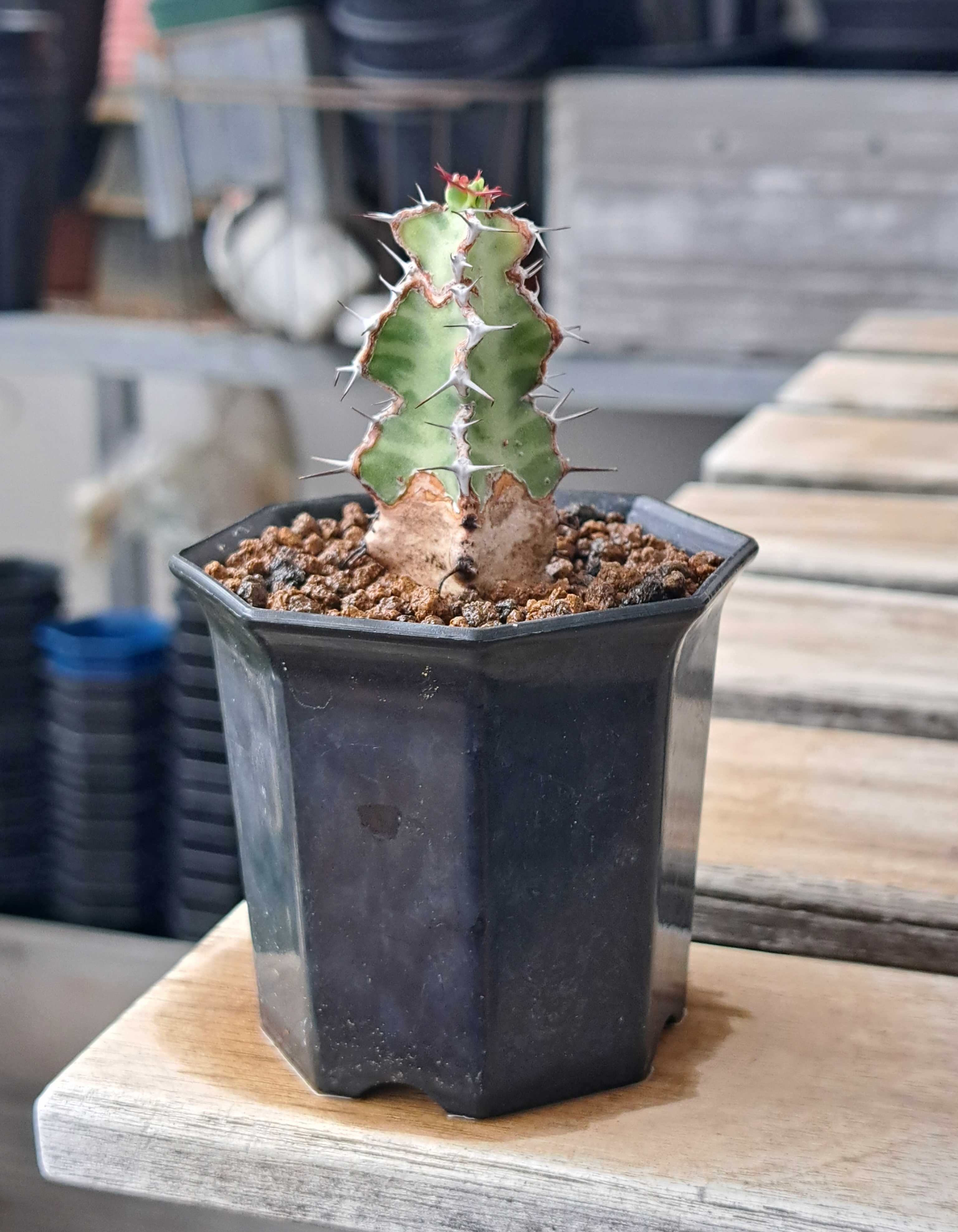 ユーフォルビア・ノベリー。9月になってようやく動き出してきた。てっぺんからきれいなミドリの葉と赤いトゲが出てきている。遅かったな~。今年は6月から真夏の暑さ。それが6、7、8と3ヶ月も続いたのに動かず今になって動き出すとは。でも、それでもまだ良い方だ。コイツ去年は全く動かなかったのだ。去年と今年、何が違うのか?それは寄せ植えを単独植えに変えたこと。去年は他の小っちゃいヤツと一緒に寄せ植えにしていたのを今年植え替え単独にしたのだ。これが良かったのではないか?なぜなら寄せ植えから単独植えに変更したら動き出したヤツがもう一個いるからだ。紅彩閣。コイツもノベリーと同じ鉢で過ごし去年は結局動きなしだったヤツだ。それが今年は動き出した。てっぺんが活性化し葉が出ている。やはりつい最近のことだ。寄せ植えでは動かず単独植えだと動く。フツー逆じゃないの?うちにあるサボテンの本には小っちゃいヤツは寄せ植えにしろと書いてある。寄せ植えの方がよく育つとずっと思っていたのだが。一方、寄せ植え鉢はというと…左上蘇鉄キリン、右上スザンナエ、真ん中にグロボーサ、その右側がテフロカクタス武蔵野、その右が稚児キリン、左下翠冠玉、右下マーベリック。蘇鉄キリンのようにフツーに動いているものもあるが武蔵野、稚児キリンは完全に止まっている。コイツら去年ノベリー、紅彩閣と同居していたヤツらだ。そして去年も全く動かなかった。2年連続ゼロ成長。動く気配全くなし。コイツらも単独植えにすれば動き出すのだろうか?エノプラ テッカ ユーフォルビア 多肉植物 ビザールプランツ サボテン アガベ 塊根植物 ユーフォルビア 寄せ植え インテリア 観葉植物 おしゃれ 雑貨ユーフォルビア・紅彩閣錦 9cm鉢 カクタス長田 エノプラ錦トウダイグサ科 多肉植物 斑入り 塊根植物 サボテンもどき 珍奇植物観葉植物/ユーフォルビア:稚児キリン3号鉢植え*ユーフォルビア パイナップルコーン 3.5号サイズ 鉢植え 別名で蘇鉄キリン 【ユーフォルビア】ユーフォルビア サボテン同様で水も控えめ明るい室内で簡単に育つ ユーフォルビア
