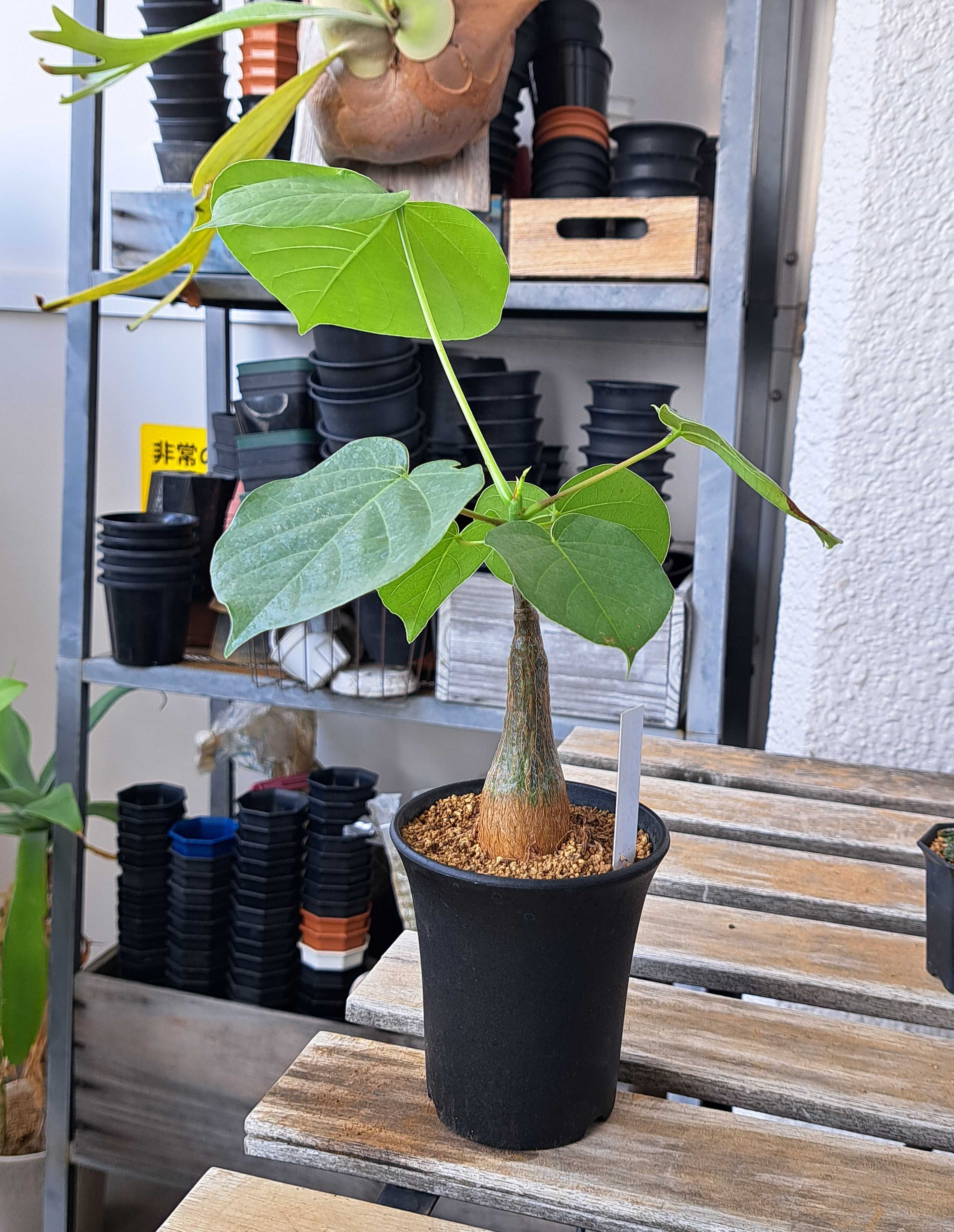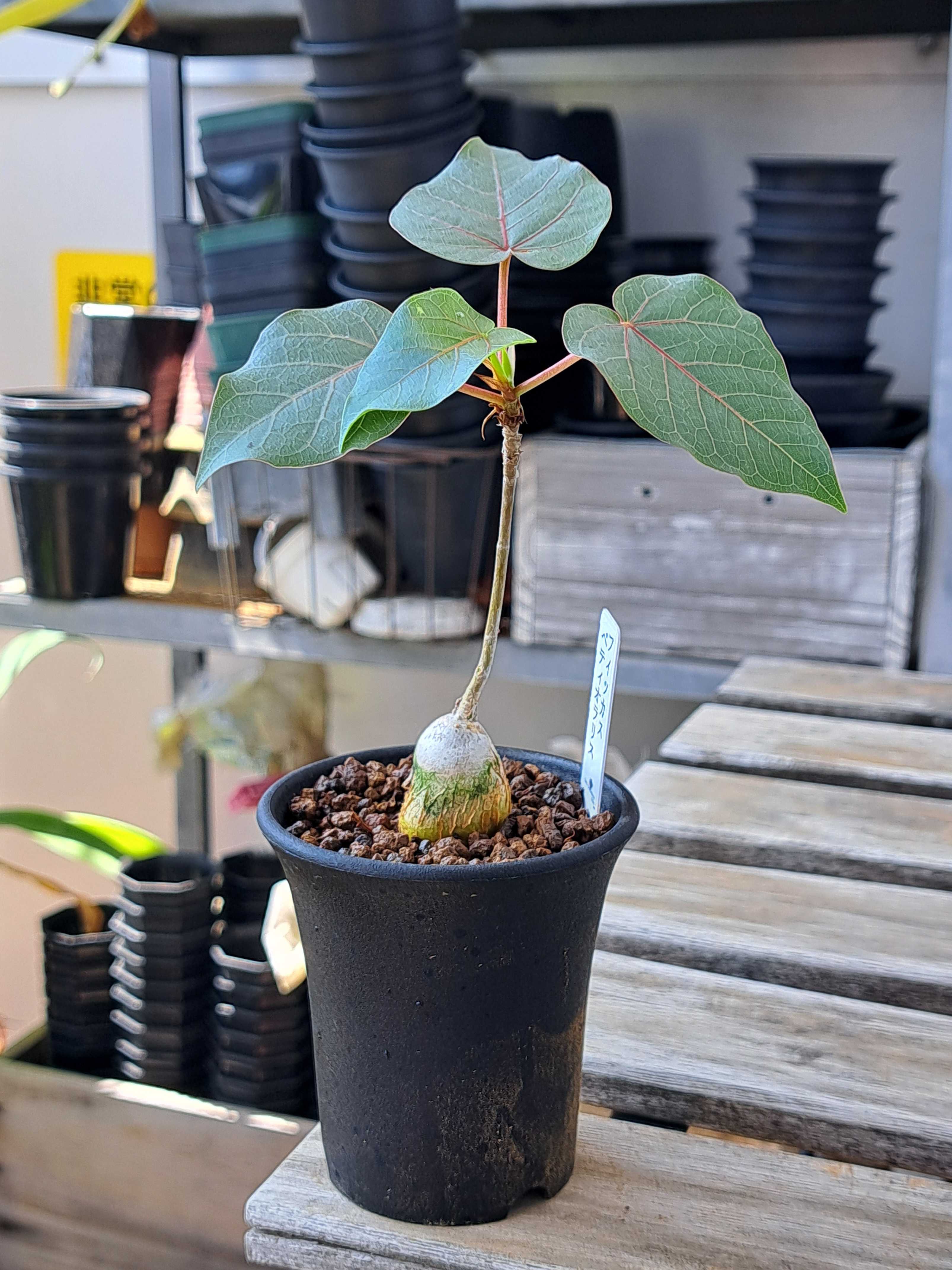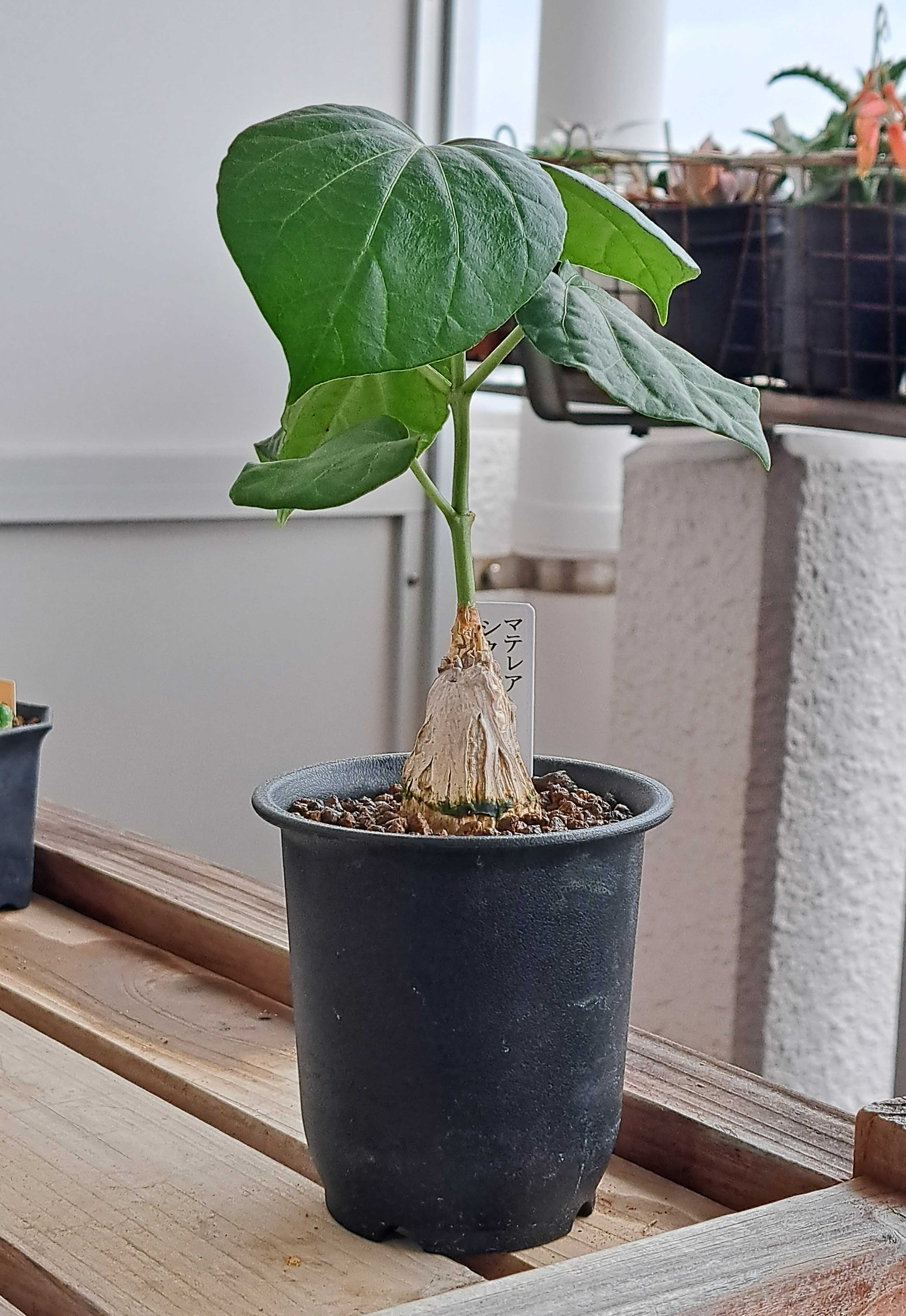 8月末に買ったコーデックス5種。9月のアタマに植え替えたがその後どんな具合か。様子を見てみよう。マテレア・シクロフィラ。植え替えた時ちょうど出始めていた新葉が大きくなっている。順調に生育しているようだ。明るい灰褐色の塊根から出る葉は結構デカい。まるで強烈な日差しから塊根を守る傘のよう。なかなか良い草姿だ。ベランダ奥の半日陰的場所に置き水は表土が乾いたらたっぷり。ゲラルダンサス・マクロリザス。支柱が短すぎて全く役に立っていなかったのでワイヤーで長い支柱を作りツルを巻き付けた。最近ツルの途中一番高いところで分岐が発生。上に向かって葉が2枚出てきた。順調と言える。直射日光には当てない方が良いと書いてあったので室内窓際置き。水は表土が乾いたらたっぷりやっている。フィカス・ペティオラリス。コイツはあまりよろしくない。植え替え時はこのような姿だったが、現在はというと、葉が減った!4枚あったのに2枚になっとる!何やコレ?原因は不明。環境の変化によるものか?直射ガンガンではなくベランダ奥の半日陰的場所に置いていたのだが…。赤い葉脈の魅力的な葉。減ってしまってサミシイぞ。水は表土が乾いたらたっぷり。しばらくは今の半日陰的場所で様子を見る。フォッケア・マルチフローラ。美しい楕円形の葉を持つフォッケアのコーデックス。成長はしてなさそうだ。芽は出ているのだが大きくならない。植え替え時にはすでにこの状態だった。今年はもうこれで終わりにするつもりだろうか?葉っぱ2枚しかないからもう少し出してほしいんだけど…。ボンバックス。3鉢持っているのにまた買ったのはコイツが2枚葉を持っているからだが、最近出てきた新葉は3枚葉のようだ。スゲー!念願の3枚葉!2枚葉が出たあとすぐ3枚葉出ちゃうんだ。下の方の葉は全て一枚でしかも小さい。ということはある日突然デカい2枚葉が出て続いて3枚葉が出る…そういうこともあるっつーことだ。それなら元々うちにいる3鉢も来年あたり2枚葉3枚葉が出てきても不思議じゃないかも。右の2枚葉は巨大だがそれを除くと大して葉はデカくない。やはり突然デカい葉が出るのか?3枚葉はどれぐらい大きくなるのか?楽しみだ。(多肉植物)マテレア シクロフィラ 2.5号(1鉢)ガガイモ 塊根マテレア・シクロフィラ 9cm鉢 カクタス長田 ガガイモ科 龜甲蘿藦 多肉植物 コーデックス 塊根植物 珍奇植物 コルク質肌"Gerrardanthus Lobatus" ゲラルダンサス ロバツス 管理2381 観葉植物 室内 贈り物 プレゼント インテリア おしゃれ コーデックス coudex 多肉植物 塊根植物観葉植物 フィカス ペティオラリスフィカス・ペティオラリス 9cm鉢 カクタス長田 クワ科 多肉植物 コーデックス 塊根植物 サボテン 珍奇植物 サキュレントプランツ★【現品・現物】Fockea multiflora(フォッケア・ムルチフローラ)(フォッケア・マルチフローラ)8号 おA番多肉植物 osプセウドボンバックス エリプチカム ボンバックス実生 おもしろ多肉植物 7.5cm〜9cmポットプセウドボンバックス・エリプチクム (剪定・作り込み株) 9cm鉢 カクタス長田 強剪定 キワタ科 多肉植物 コーデックス 塊根植物 珍奇植物観葉植物/プセウドボンバックス:エリプチクム(実生4年株) 3号スクエア鉢