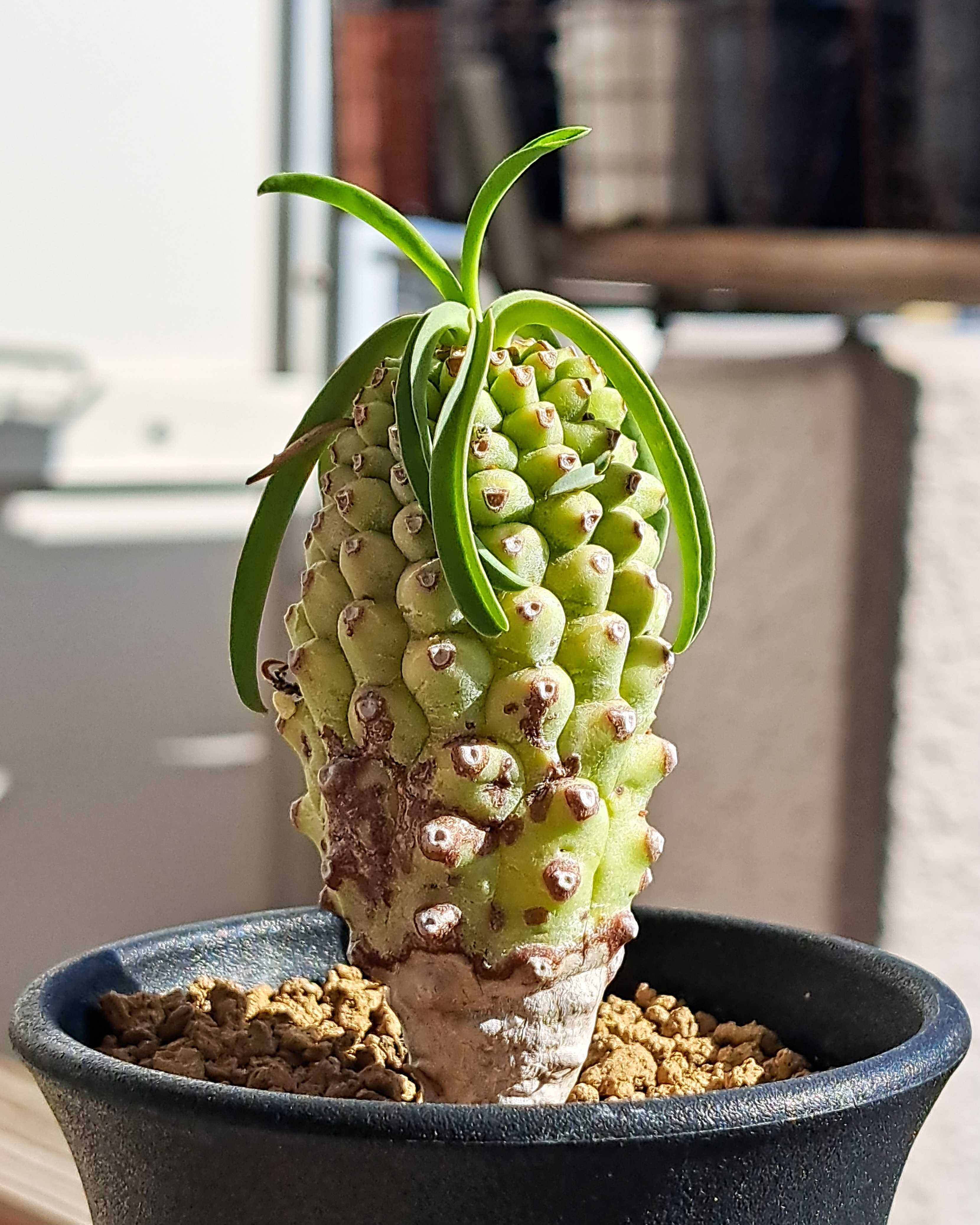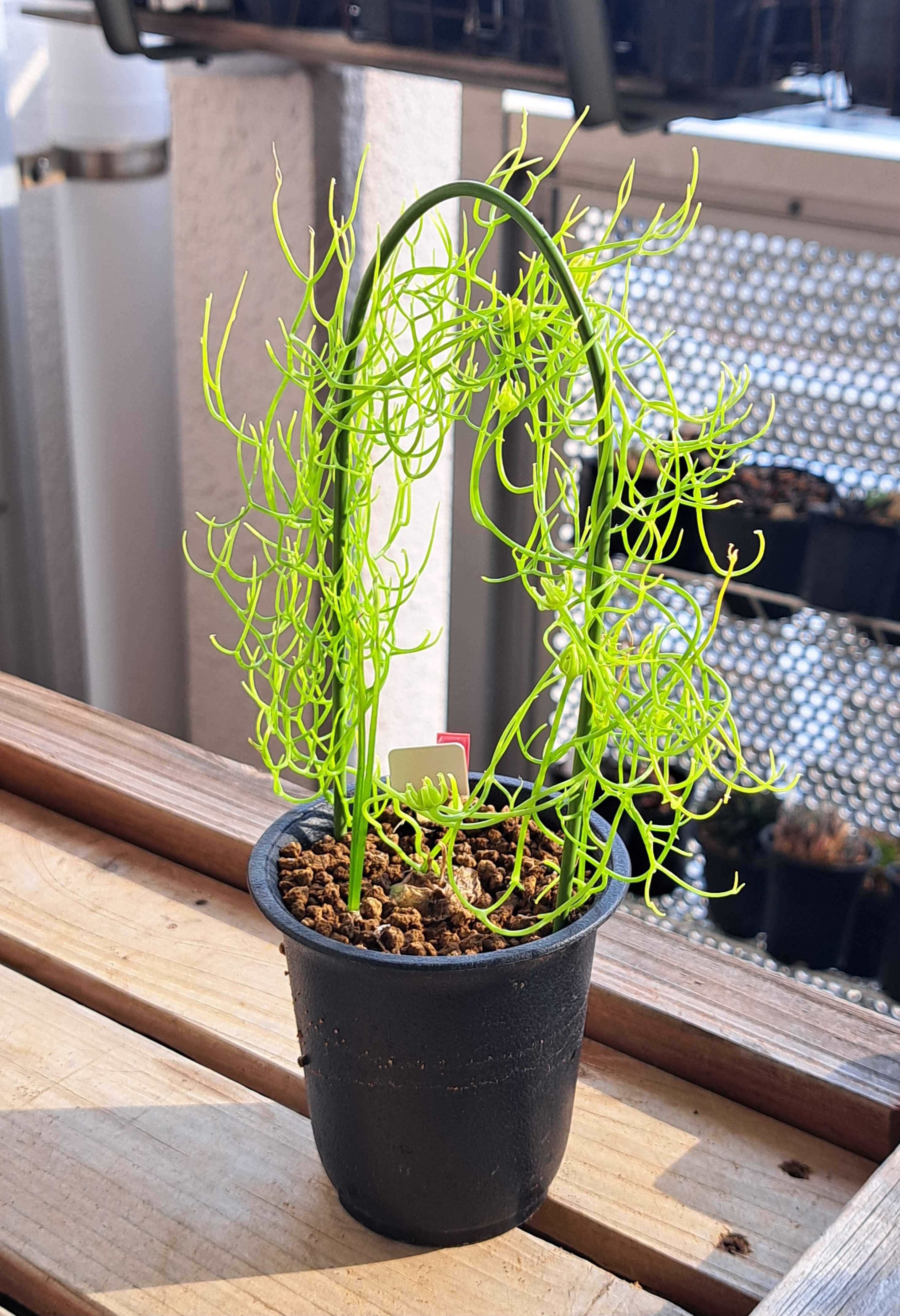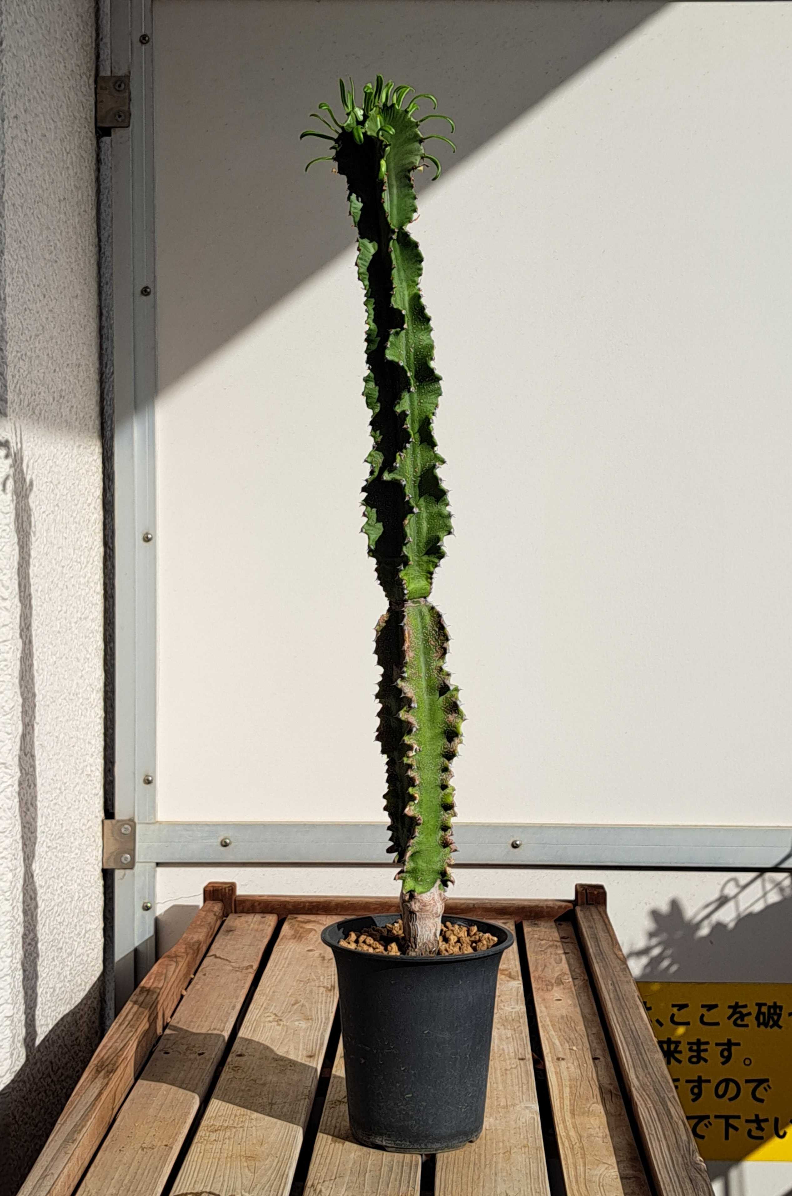 くそ暑い日が続く。朝、駅までの10分、濡れタオルで氷3個を包み手のひらの血管を冷やしながら汗を抑え通勤する。以前の9月とは違う。そんな暑い中元気に成長するのはタコもの。今日はタコものユーフォの様子を見る。まずは飛竜。タコものとは言わないか?でも似てるからいいよね?寒さに当ててしまいダメージを受けた飛竜だが問題なく育っている。中心部から出てくる新茎。3本出ている。鮮やかなミドリでトゲは赤。この赤トゲが良いのだ。古い枝。寒さでシミができてしまったが先端は活性化している。結構長い枝だがまだ伸びるらしい。暑さをものともせず成長する。本来ユーフォルビアってこんなイメージなんだよね。奇怪ヶ島。これまたタコものとは言わないかもしれないが似ているのでご勘弁。上の飛竜と違い下の方の長い枝は枯れてしまった。短い枝だけになってしまった現在の姿は…結構いいじゃないか。白っぽい塊根に筋肉質な枝。枝は太く短いので締まった姿を作り出す。コイツも今まさに枝を伸ばしているところ。2、3本新枝が出て伸びつつある。暑いのが好きなのだ。イネルミス。正真正銘のタコもの。基部から枝が出て枯れ、また今出てきている。一気に5、6本出そう。元気一杯な様子だが枝がちゃんと育つかどうか?伸びる前に枯れた茶色い枝が今も残骸として残る。フラナガニー。下の方の枝は順次枯れていくが上から新枝が出てくるので数は減らない。下の方が枯れるにつれ基部があらわになるから悪くない。茶色い基部とミドリの枝の対比は素晴らしい。どんどん出る新枝。暑いのは好きなよう。もう一個フラナガニー。購入時は徒長していて枝が鉢から大きく飛び出していたがうちで日に当てて育てたら締まった姿になった。ゴルゴニス。コイツも徒長していているのか枝が妙に細長い。左上の枝は枯れてきた。上のフラナガニー同様生え変わるのだろう。上から新枝がモリモリ出てきている。日に当てているのでコイツもいずれ締まった姿になるはず。枝はやはり太く短くが良い。もう一個ゴルゴニス。細く長い枝と太く短い枝が入り交じる。元々の枝が細長いの、うちで出た枝が太く短いものだ。新枝もモリモリ。花が咲いたりして分かりずらいが上部から5、6本新しい枝が出ている。さらに…こぼれ種発芽野郎まで…。小っちゃい、これぐらいの時は何だか分からん。この時期のユーフォは全部同じだ。ゴルゴニスなのかそれとも他の鉢から飛んできたのか?ある程度大きくならないと判別できないが多分オベサかバリダじゃないかな~。観葉植物/[ザ・ファームセレクト]ユーフォルビア:ステラータ(飛竜) 3号鉢植えユーフォルビア・ステラータ 飛竜 9cm鉢 カクタス長田 トウダイグサ科 多肉植物 コーデックス 塊根植物 サボテン 珍奇植物 タコものユーフォルビア・スクアローサ 奇怪ヶ島 9cm鉢 カクタス長田 トウダイグサ科 多肉植物 コーデックス 塊根植物 サボテンもどき 珍奇植物 タコもの(多肉植物)ユーフォルビア イネルミス 九頭竜 3号(1鉢)(現品) ユーフォルビア フラナガニー 孔雀丸 (No.61676) (観葉植物 おしゃれ インテリア ミニ 吊り下げ 壁掛け 小型 多肉植物 Euphorbia flanaganii)多肉植物:ユーフォルビア フラナガニー 孔雀丸 ダブルヘッド*全幅18cm(多肉植物)ユーフォルビア ゴルゴニス 3号(1鉢)【Euphorbia ユーホルビア ゴルゴニス(実)】管理方法付き3号鉢 サボテン 多肉植物 希少 珍奇植物 レア 珍品 珍しい インテリア 観葉植物 グリーン 人気 おうち時間 プレゼント ギフト おしゃれ 新生活 引っ越し 新築祝