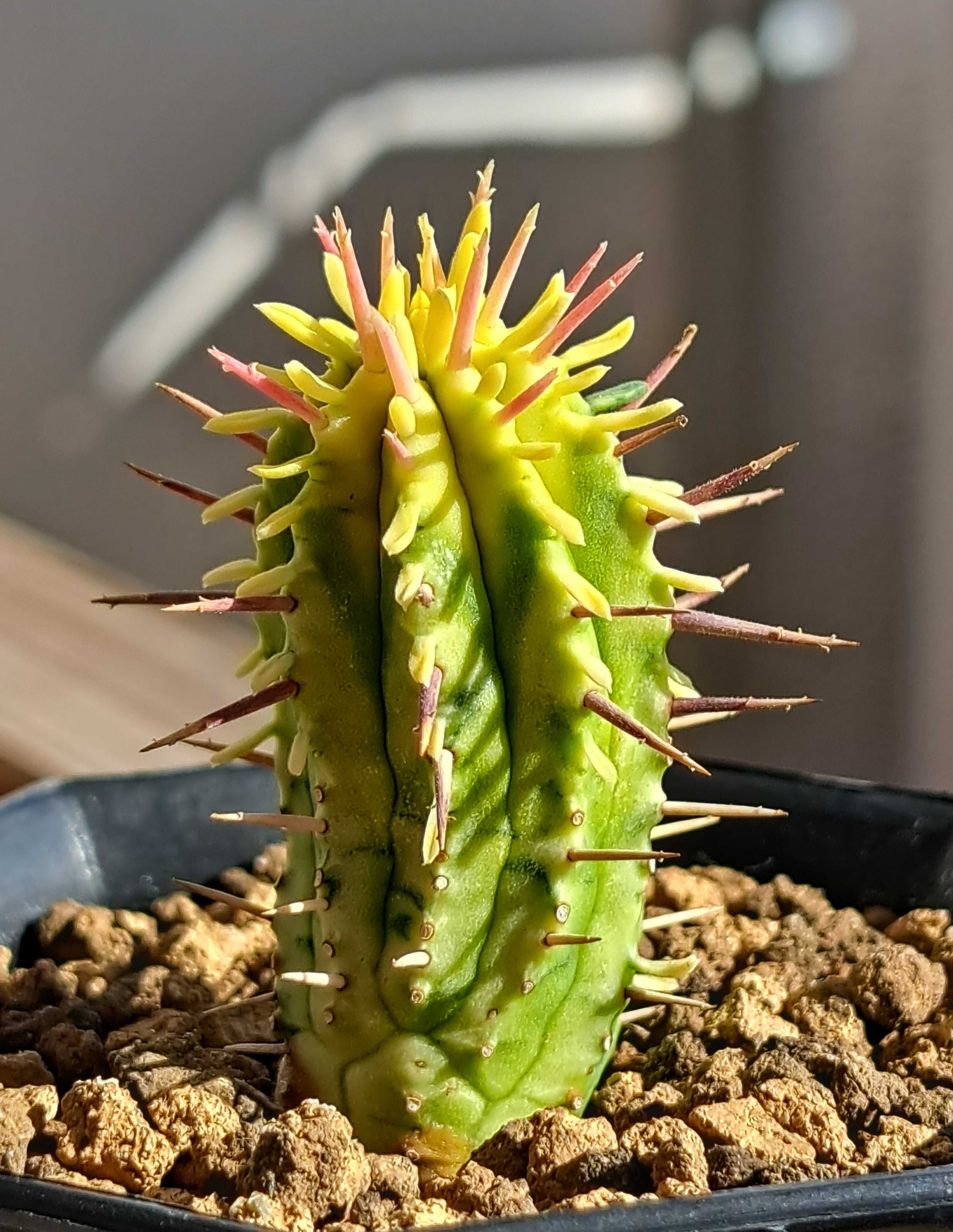 ユーフォルビアを点検するぞ。いや、毎日点検しているわけだが、変化が出てきたものなどがあるので記事にしようというわけだ。ユーフォルビア・ブバリナ。最近になっててっぺんから葉を出してきた。それまでかなり長い間停滞していたのに急にだ。朝晩の気温が若干下がり過ごしやすくなったからだろうか。これからガンガン葉を出すのかね?不明だ。枝が出かかっている箇所。ここは相変わらず停滞したままだ。これまでも何度かこういうのが出たことあるがいずれも枯れている。コイツも枯れてしまうのか?なんとか育ってほしいが…。ラクテア・モンストこれは…成長してないんじゃないのか?小っちゃい枝がちょっと出たとは思うがそれだけに見える。確認してみよう。2月27日。うわー。全然成長してねえ。小っちゃい枝も出てなかった。錯覚だった。ずっとベランダ最前部に置いて日に当てていたのだが全く効果なし。う~ん。同じ柱状種でもコイツは成長している。クアドラングラリス。8月6日の画像と比較してみる。1cmぐらいか?先端が伸びている。しかしそれでもわずか1cm。ラクテア同様日に当てているが大して伸びないね。鉄甲丸。葉が少ない…。下葉が落ちているのだ。夏はあまり得意ではない気がする。寒さには強く冬でも動いたりするが暑さは苦手なのかもしれないな。これは去年のものだが春の姿。2024年5月18日。ワサワサ。過去の画像を見てみると春と秋がこんな感じで葉を茂らせている。春秋成長型ということなのだろう。今日はここまで。明日もユーフォルビアの様子を見る。ユーフォルビア ラクテア マヤカクタス 5号|観葉04-PA多肉植物:ユーフォルビア 鉄甲丸*S 塊根幅2cm ☆赤松実生多肉植物 caユーフォルビア 鉄甲丸 9cmポット 多肉植物 ユーフォルビア【送料無料】多肉植物 ユーフォルビア ほほえみパイン多肉植物 ユーフォルビア ブブレウリフォリア(鉄甲丸) 3.5号鉢(個体おまかせ1鉢) インテリアグリーン おしゃれ 可愛い かわいい 室内園芸