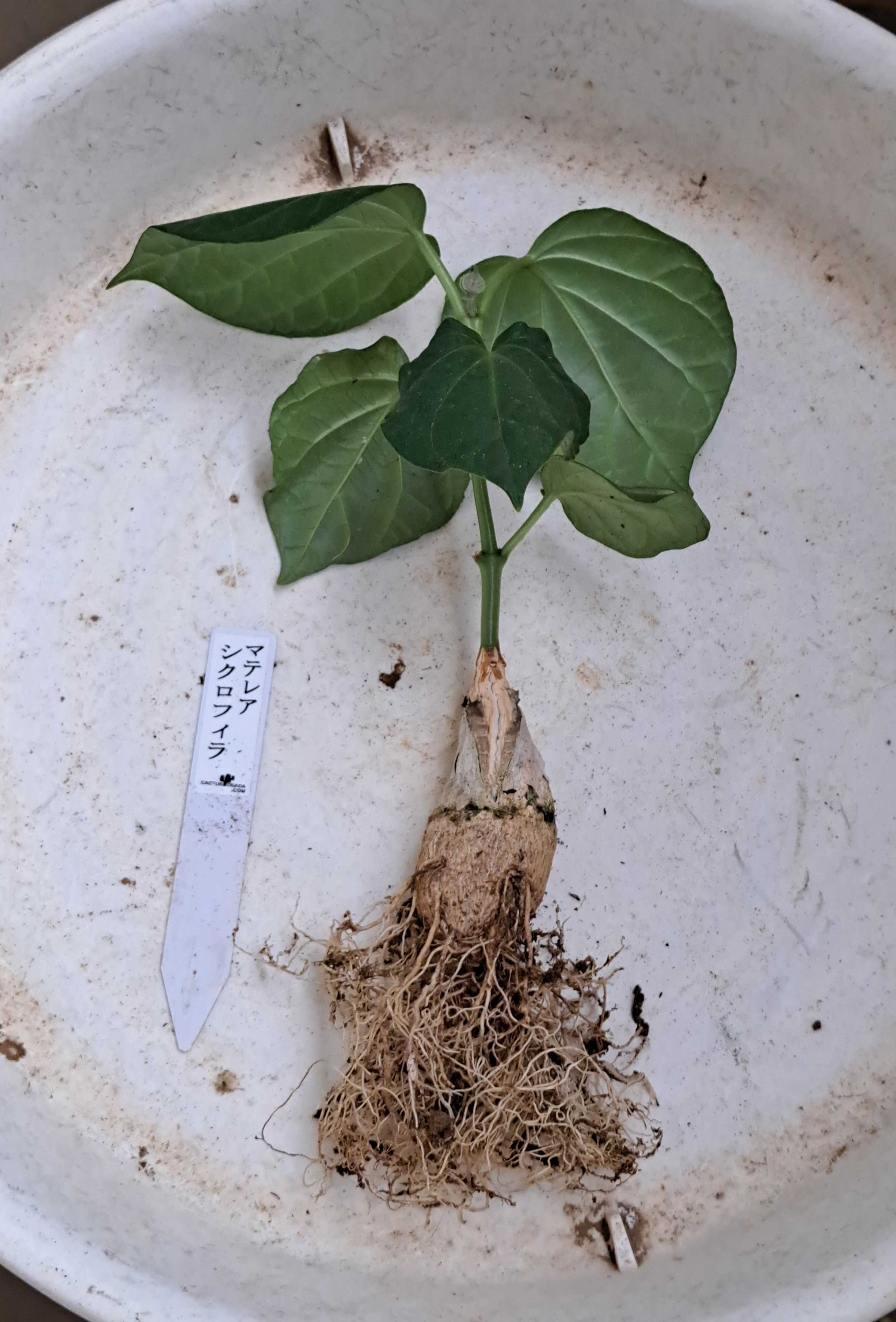 最近買ったコーデックス5個を植え替えるぞ。今日は抜いて塊根や根の様子を見よう。マテレア・シクロフィラ。涙型の塊根。下の方から細根がワシャワシャ。白い根が多く健康そう。表土が乾くころには葉がしおれるので水やり多めがいいかもしれない。そして日陰置きでいいかな、とりあえず。ゲラルダンサス・マクロリザス。コイツも水滴のようなカタチの縦長塊根。検索すると扁球状のイモを持つものが出たりするのでデカくなるとカタチが変わるのかもしれない。支柱は長いものに変えたがもっと長くても良かったかも。ツルがとにかく長いのだ。植え替え後は当面明るい日陰置きの予定。フィカス・ペティオラリス。楕円形の塊根はめちゃ良いカタチ。そこから細い枝が伸びて傘のように葉が付く様はまさに好み。植え替え後しばらくは半日陰、その後日に慣らした上で直射を浴びせる予定。フォッケア・マルチフローラ。円筒形というか注射器の先みたいな塊根。そこから出る根も割りと太目。フィカス同様日に慣らしたあと直射を浴びせるつもり。ボンバックス。コイツが一番デカく3号鉢に植えられていた。2.5では足りないだろう。3号鉢に植えるつもり。植え替え後は室内窓際置きとする。5個とも根はよく張っていて元気そう。さすがカクタス長田産。明日は植え込んだ姿を記事にする。どう植えるかも大事だよね。プセウドボンバックス・エリプチクム (剪定・作り込み株) 9cm鉢 カクタス長田 強剪定 キワタ科 多肉植物 コーデックス 塊根植物 珍奇植物ステファニア・スベローサ 9cm鉢 カクタス長田 ハスノハカズラ属 ツヅラフジ科 多肉植物 コーデックス 塊根植物 珍奇植物 蔓性フォッケア・エデュリス 火星人 9cm鉢 カクタス長田 ガガイモ科 多肉植物 コーデックス 塊根植物 サボテン 珍奇植物 サキュレントプランツ観葉植物/マテレア:シクロフィラ 3号鉢植えペトペンチア・ナタレンシス (良型個体) 9cm鉢 カクタス長田 ガガイモ科 多肉植物 コーデックス 塊根植物 サボテン 珍奇植物 サキュレントプランツ
