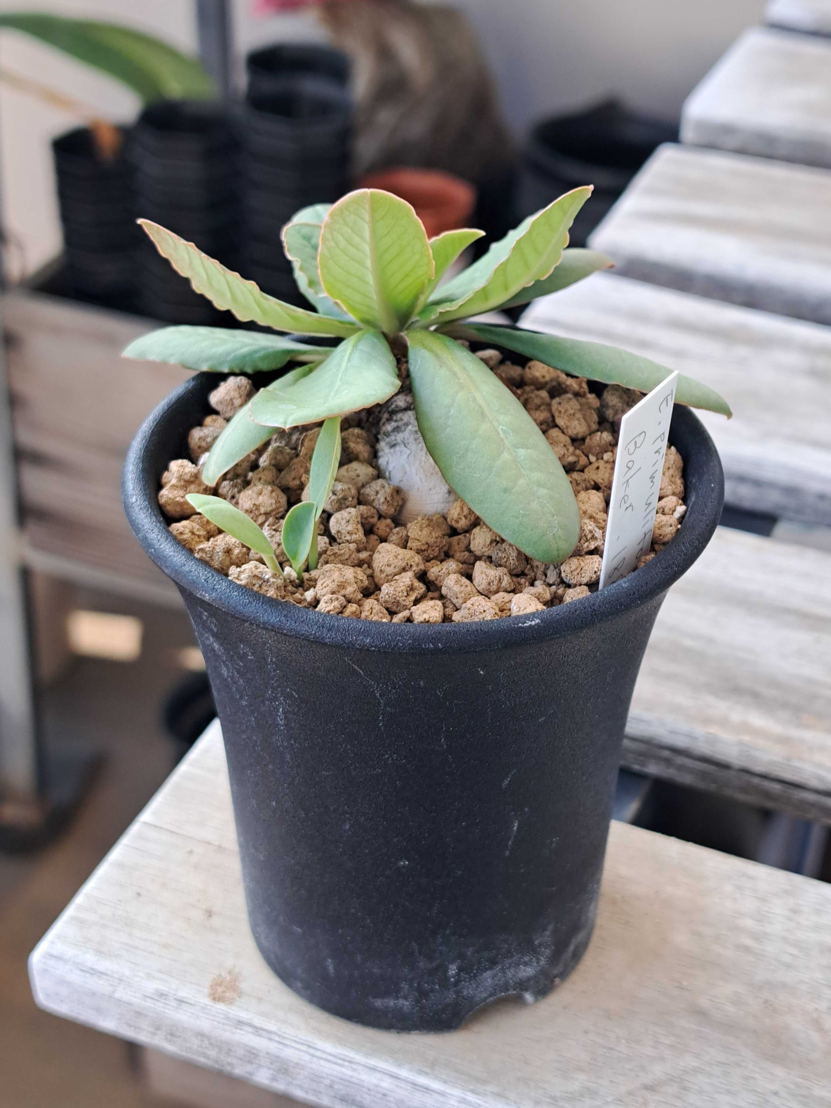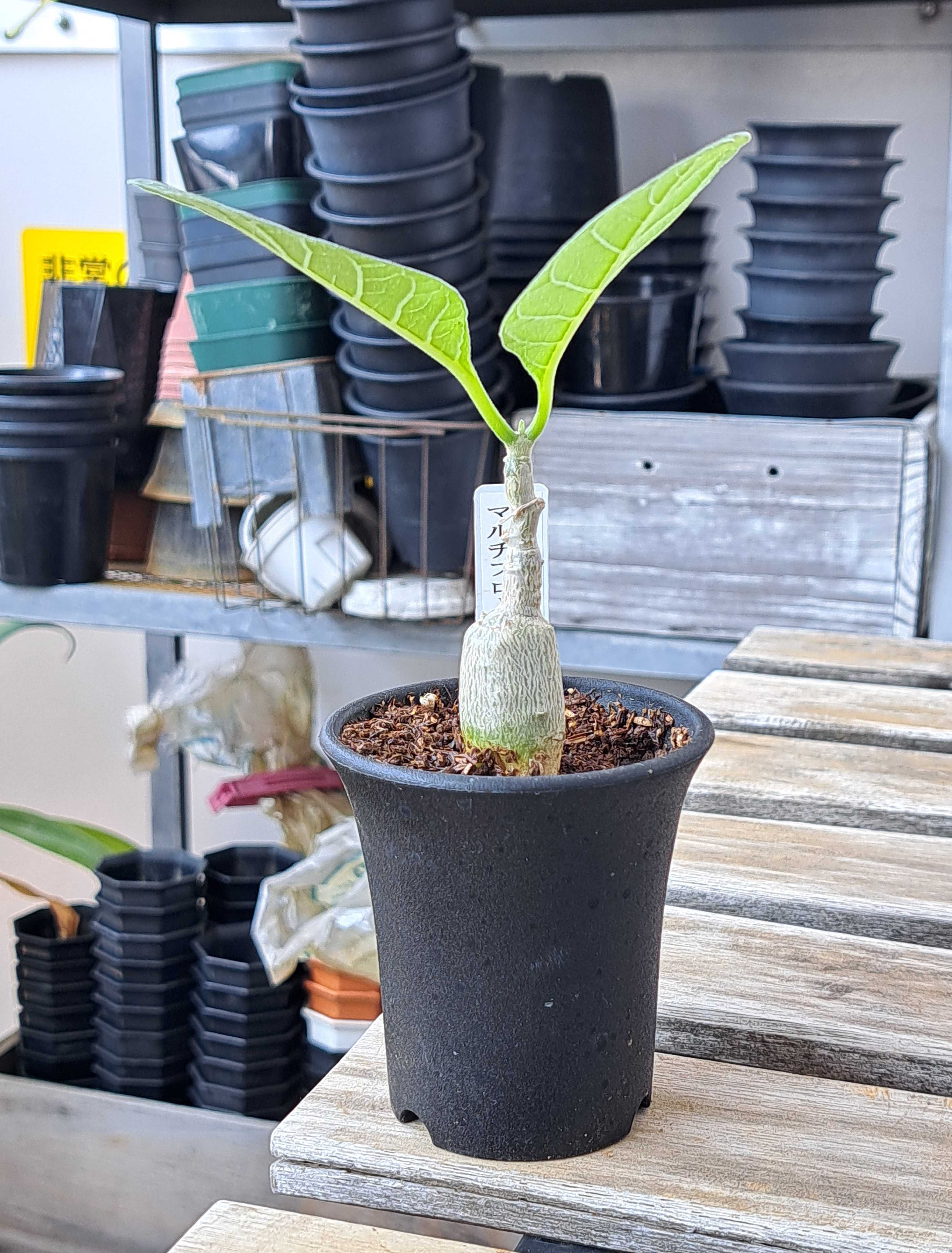 モモルディカ・ロストラータ?何やソレ?全く聞いたことないぞ。モモルディカって何や?モモルディカ属ってことだよね?そんな属あるんかい?でも信頼のブランド、カクタスオサダ産だから間違いない。モモルディカという属があるのだ。では見てみよう。2.5号ミニラン鉢に植わっている。コーデックスだ。塊根があってツルを伸ばす。幾度となく見てきた典型的な姿。ツルは長い。支柱がないので伸び放題。こりゃ厄介だ。早めに支柱を立ててやろう。では最大のポイント、イモを観察。ふむふむ。ツボ型の塊根なのね。まん丸塊根も好きだがツボ型っつーのもいいのよ。ちょっとタテ長で柔らかい曲線のシルエット。なかなかのものだ。ミドリと茶色が入り交じる。元々ミドリだったのが木質化していく過程でこうなっているのか?上部から出る枝は数が多い。フツー2.5号鉢の小っちゃい塊根植物なら茎は1本だがコイツの場合すでに何本も出ている。しかしコレ、枝数は多いがツルは2本だね。切れているが左右に2本。あとは葉だ。なんかよく分からん。ツルの様子。あれっ?コレあいつのツルに似てるね。少し前に買ったゲラルダンサス・マクロリザス。近い植物なのかな?よし、調べてみよう。謎の植物モモ…なんだっけ?あ、モモルディカ。ええと…ええと…。なるほど。ゲラルダンサスと同じウリ科の植物なのか。ウリ科モモルディカ属…やっぱモモルディカ属ってあるんだ。ふむふむ、強光で育てる感じではないね。ベランダ奥で一日2、3時間直射に当たる感じでいいかな。水は乾いたらたっぷりでいいだろう。よし。当面はこれで育てよう。寒くなったら室内で。これでいいんじゃないでしょうか。多肉植物 sdアデニア グラウカ 実生 多肉植物 塊根植物 コーデックス 9cmポット多肉植物 sdユーフォルビア ポイゾニー錦 9cmポット 多肉植物 ユーフォルビア コーデックスコーデックス:マテレア シクロフィラ 実生*M 塊根幅4.5cmフィカス・ペティオラリス 9cm鉢 カクタス長田 クワ科 多肉植物 コーデックス 塊根植物 サボテン 珍奇植物 サキュレントプランツブルセラ・ファガロイデス (実生) 7.5cm鉢 カクタス長田 カンラン科 乳香の木 灌木 多肉植物 コーデックス 塊根植物 幼苗
