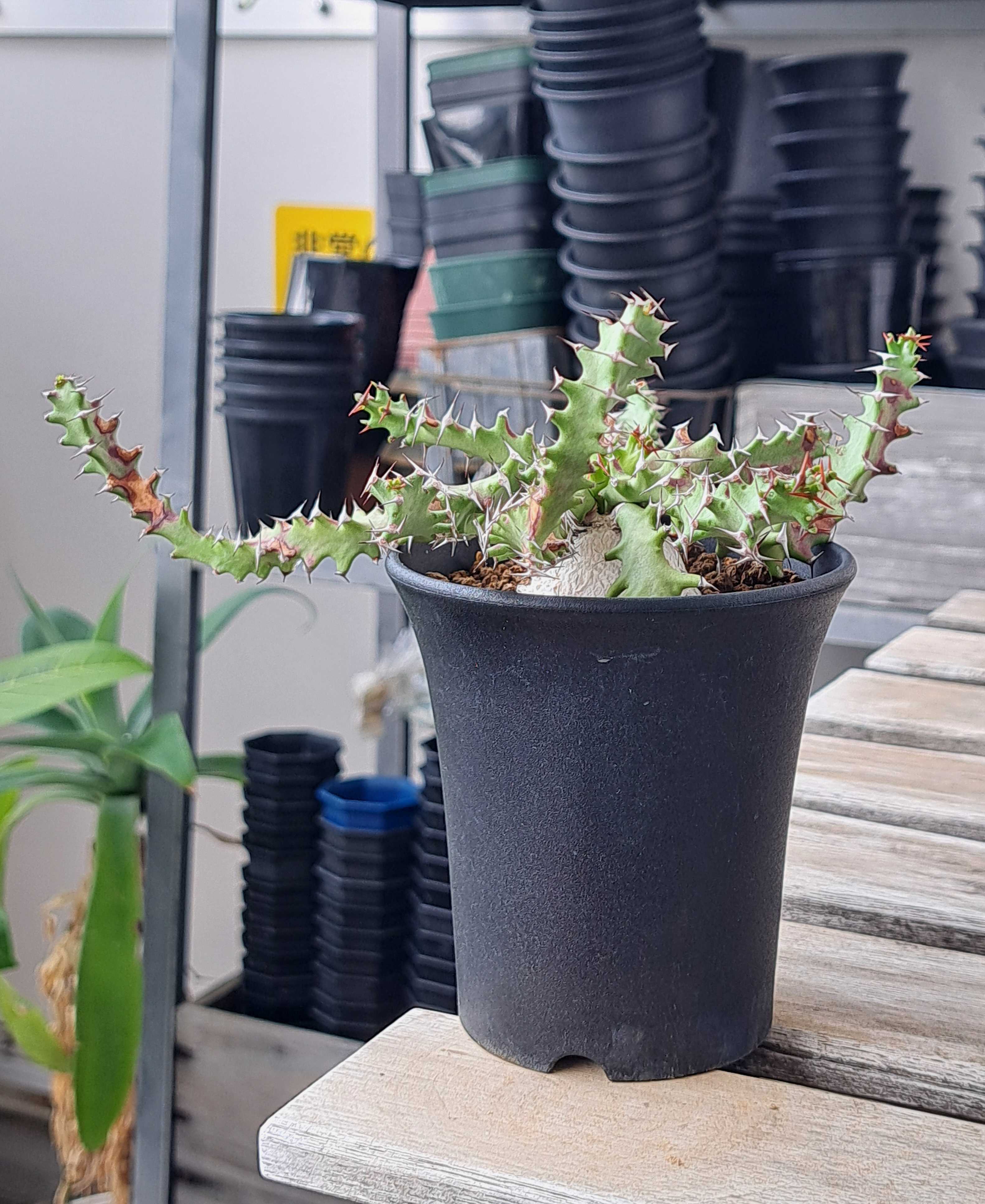 昨日に続いてユーフォルビアを点検するぞ。まずは紅彩閣錦。鮮やかな色合いが目を引く。黄色にピンク。蛍光色のような発色で美しい。カキコなのだが根付いて成長している様子。斑入りなので速度は遅いがゆっくりじっくり育ってほしい。少し前に植え替えたプリムリフォリア。しばらくは半日陰で過ごしてもらい、その後ひなたへ。調子は良さそう。仔株の方も4枚目の葉を出しつつある。いいね。地中でもがんばって塊根作ってね。魔紅キリン。この夏である程度背が高くなった。5月26日の画像と比べてみよう。1cmぐらいかな。まあ、こんなもんか。それはそうとコイツかなり茶幕が上がっているな。直射に当てない方がいいのかな?バリダやオベサでも茶幕が上がるヤツは結構いるがどうも直射に当てすぎるとこうなる気がする。例えばこのオベサ。てっぺんまで茶幕が上がっている。これは焼けただれているのではないか?なんかそんな気がする。半日陰に移そうか?一方このオベサはすでに半日陰置き。直射ガンガンにしていたら焼けたのだ。それで半日陰移動。う~ん。以前はユーフォルビアが直射で焼けることなんてなかったのだが…。地球温暖化の影響だろうか?ユーフォルビア・紅彩閣錦 9cm鉢 カクタス長田 エノプラ錦トウダイグサ科 多肉植物 斑入り 塊根植物 サボテンもどき 珍奇植物(多肉植物)ユーフォルビア 紅彩閣錦(コウサイカクニシキ) 2.5号(1ポット)観葉植物/ユーフォルビア:プリムリフォリア 2.5号 23-01魔紅キリン ユーフォルビア 多肉植物 ビザールプランツ サボテン アガベ 塊根植物 ユーフォルビア 寄せ植え インテリア 観葉植物 おしゃれ 雑貨☆特価☆多肉植物:ユーフォルビア オベサ*S 幅2.5cm ☆赤松実生☆特価☆多肉植物:ユーフォルビア オベサ M*幅3.5cmユーフォルビア オベサ 4号 セメント鉢 種類 苗 多肉植物 鉢 土 希少 珍しい ビザール プランツ 珍奇 販売 通販 多肉 観葉 植物 ギフト 室内 屋外 開店 新築 結婚記念日 贈り物 プレゼント 記念日 誕生日 お祝い 鉢 花 トウダイグサ インテリア レア