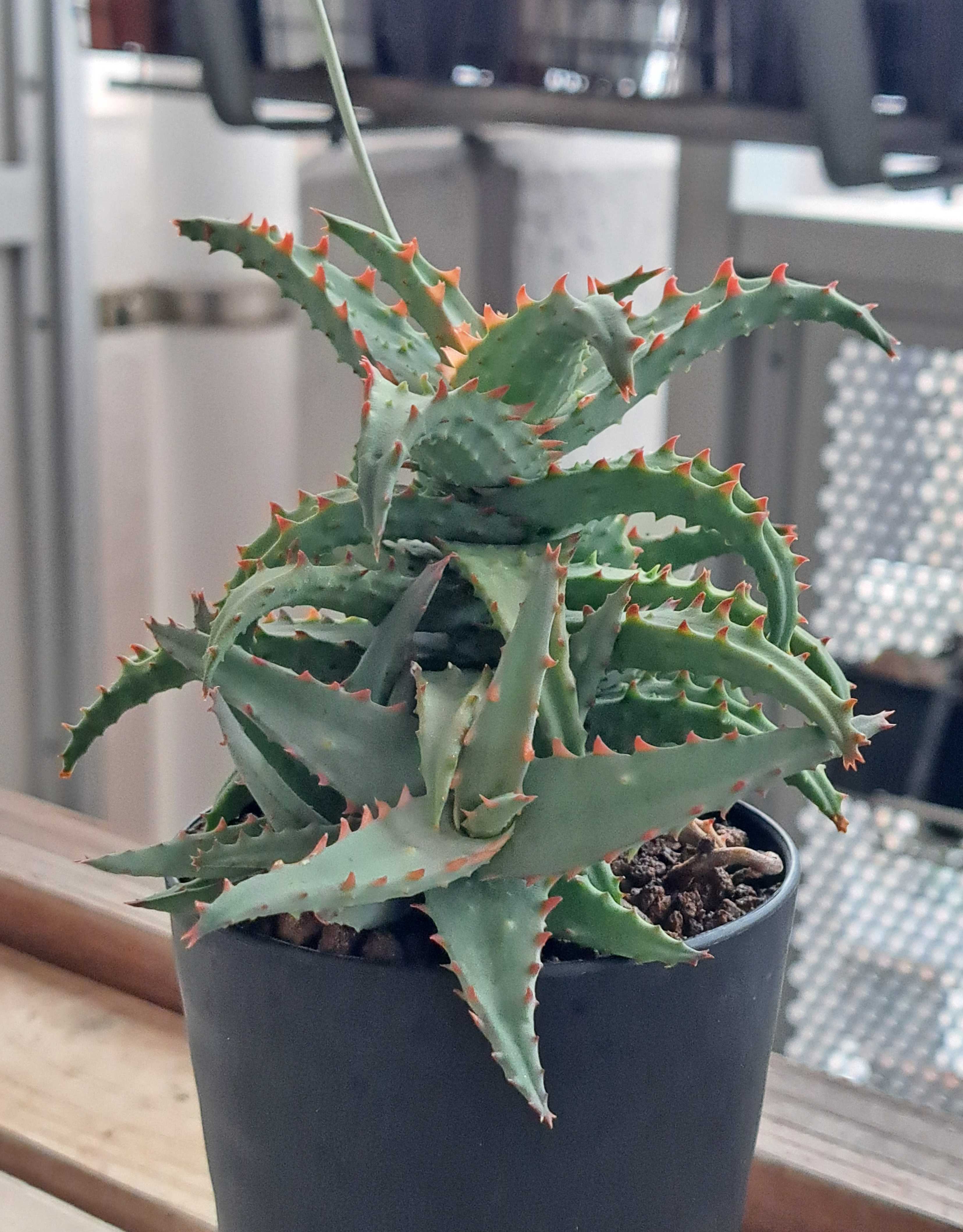 今年5月19日。アロエ・エリナケア。成長は遅いが7年も経つとさすがにデカくなる。葉は上に積み上がりだいぶ背も高くなった。しかし、それだけ。仔を吹いたり枝ができたり、そういう変化には極端に乏しい。つまり、面白くない。少し前から考えていたのだが、コイツ切っちゃうか?胴切りして強制仔吹きさせるのだ。小っちゃいエリナケアがポコポコ出てきたら面白そうじゃないか。ということで切断。うわあ、切っちゃった。もうあとには戻れない。切り口に殺菌剤を塗布、あとは放置。芽や根が出るまでにはかなり時間がかかるはずだ。上部はカラ鉢に乗っけてベランダ奥で放置、下部はこれまで通り室内置きにし2週に1回たっぷり水やり。思った通り根はなかなか出なかった。1ヶ月経っても2ヶ月経っても3ヶ月経っても。そして3ヶ月と2週間が経過。ついに出た!切り口から割りと太い根が出ている。拡大。割りと…どころじゃないな。かなりぶっといぞ。こんな太いのが出るのだね。植え込んで水をやる。だいぶ痩せてしまったが根が出たからには水を吸いいずれふくらむはず。一方切断下部の方はというと、全くダメ。芽が出ない。これからなのかもしれないが今のところ気配すらない。ま、気長に待ってみるか。(多肉植物)アロエ エリナケア 2.5〜3号(1鉢)アロエ エリナケア 3号|観葉04-PAアロエ(エリナケア) 2.5号 ポット苗 1鉢 アロエエリナケア Aloe erinacea【Aloe アロエ エリナケア】管理方法付き3号鉢 サボテン 多肉植物 希少 珍奇植物 レア 珍品 珍しい インテリア 観葉植物 グリーン 人気 おうち時間 プレゼント ギフト おしゃれ 新生活 引っ越し 新築祝