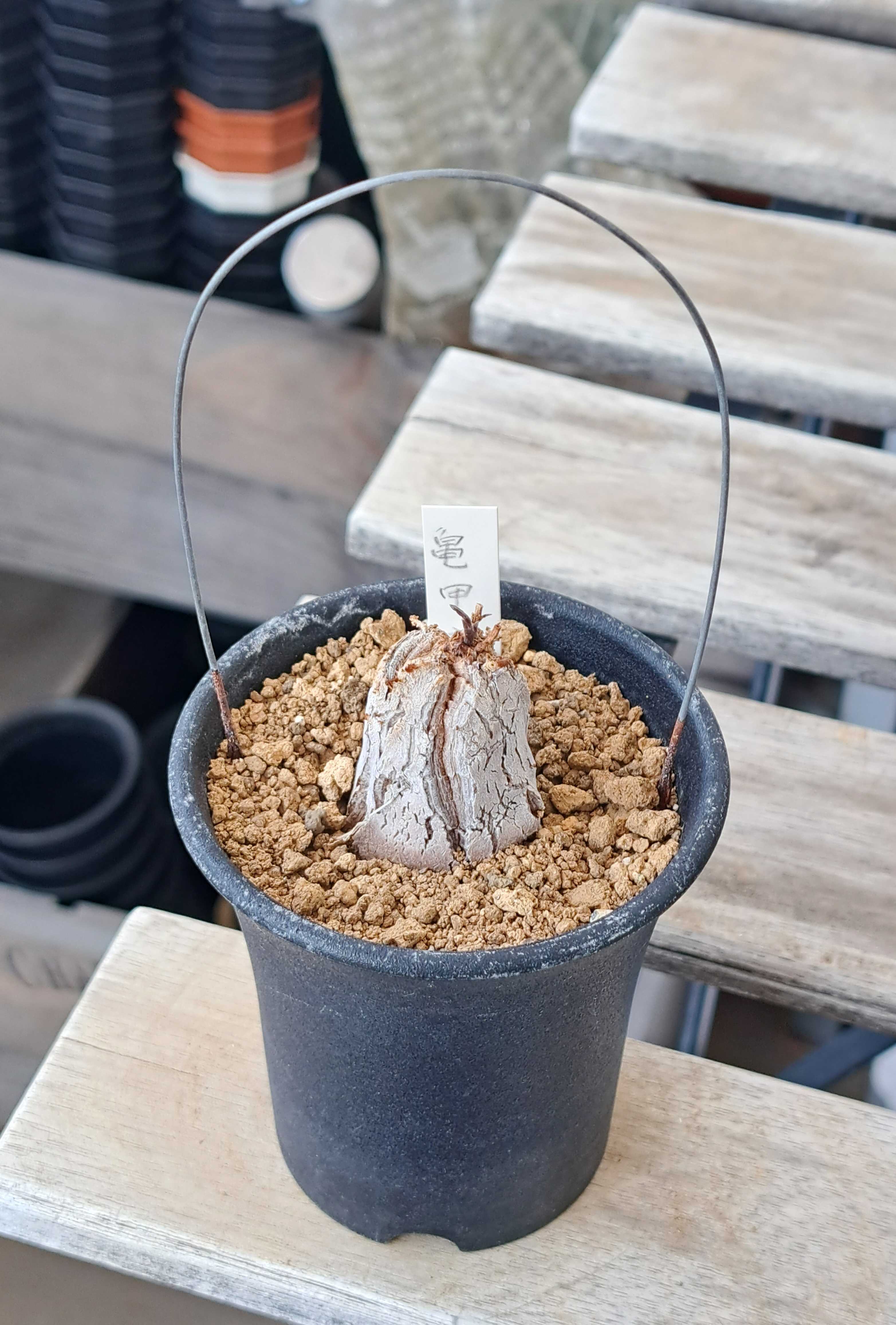ディオスコレア・エレファンティペス和名アフリカ亀甲竜。初夏ごろに葉を枯らし夏は塊根のみになって過ごす。ベランダの奥日陰置き。直射日光は当たらないが風は吹く。水は2週に1回じょうろでチョロリとひと回し。これで毎年夏を越す。そして8月末になると新ツルを出し成長を開始する。一見塊根だけのように見えるコイツだが、実はてっぺんやや右から新ツルを出している。黒いので分かりずらいがヒジキのようなものがそれだ。拡大。鳥の足にも見える。ちょっと不気味な新ツル。今年も8月末ごろ出てきたのだが初動はかなりゆっくりだ。もう少しデカくなると速度が上がり途中からはするする伸びていく。元々イモを完全に埋めていた亀甲竜。植え替えてまる2年。徐々にイモが見えてきて今ではこの通り。デカくなったことで埋まりきらなくなり地上に出てきたのだろう。2年前埋めたときはすべすべだったが少しずつひび割れが生じ現在はこの状態。数ヶ所割れている。これが増え亀甲状になっていくわけだ。コイツにも新ツルが。左は切った枯れツル。右のヒジキが新ツルだ。バキバキ亀甲竜。深く割れた立派な亀甲状塊根を持つコイツ。去年は上2つの亀甲竜より少し遅れて成長開始した。今年はどうだろうか?新ツル出てるかな?出てないね。今年は暑いから遅れてるのかな。最後にもうひとつ。一昨年買った亀甲竜。コイツ去年は結局ツルを出さなかった。枯死しているのか?去年出なかったけど今年は出ている…なんてことはないかね?おっ?出てるか?いや違う。枯れツルだ。やっぱダメなのかな~。塊根植物 アフリカ亀甲竜 2.5号硬質ポット(個体おまかせ1鉢)※現在落葉中 コーデックス ビザールプランツ インテリアグリーン 室内園芸 おしゃれ 可愛い かわいい【最大1000円OFFクーポン★楽天スーパーSALE】亀甲竜 ミニ ディオスコレア エレファンティペス 2.5号 塊根植物 観葉植物 小さい 卓上 希少 種 コーデックス 多肉植物 冬型 おしゃれ 鉢 移転祝い ガーデニング 贈り物 プレゼント 亀甲龍夏ギフト お中元多肉植物 os亀甲竜 キッコウリュウ おもしろ 多肉植物 塊根植物 亀甲竜 コーデックス 9cmポット【送料無料】多肉植物 塊根植物 亀甲竜 A【送料無料】亀甲竜 ( きっこうりゅう ) 多肉植物 5号 1個売り ディオスコレア エレファンティペス アフリカ亀甲竜 蔓亀草 ツルカメソウ 象の足 ゾウノアシ 送料無料 即納