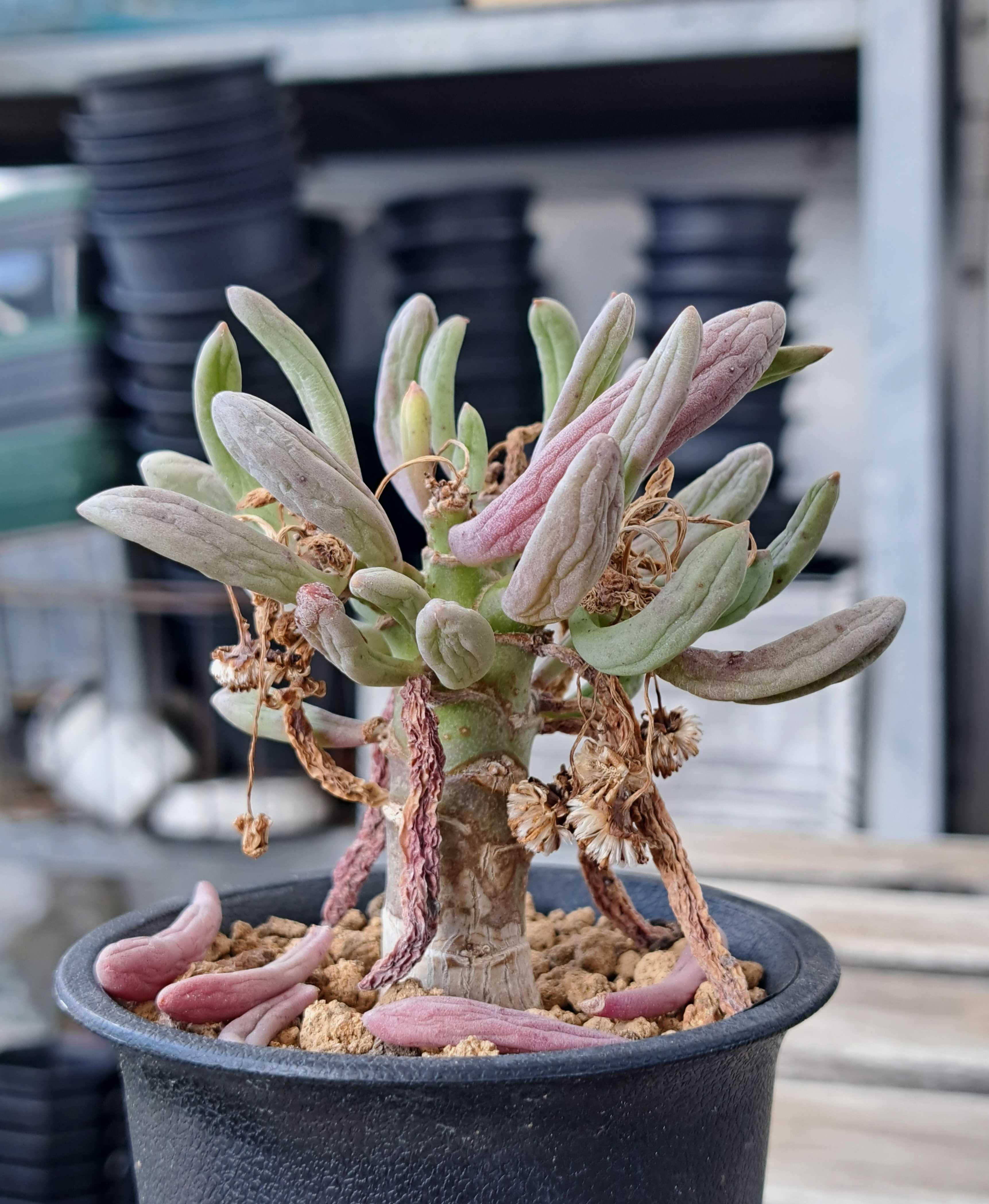 オトンナ・クラビフォリア3鉢の様子を見てみよう。1号。日陰置き。水をやると葉はふくらむ。夏でも根は機能しているようだがたっぷりはやらない。成長していないときに大量の水はやらない方がいいと思うのだ。反対側を見る。画像中央あたりに新しく出たような枝。葉が4枚ついている。前回の記事で新葉か?と書いたがその後全く成長していない。やはり暑い時期は動かないのだ。2号。ひなた置き。直射が当たるのは日に2時間ほどだが一応ひなたに置きどうなるか見ている。葉はかなり枯れている。上の方は全滅状態だ。だが下の方の葉はなぜかプクプク。水は2週に1回じょうろでひと回ししかやっていないのにコレだ。あ!思い出した。そういえば先週大雨が風でベランダに降り込んだのだった。それでプクプクなんだわ。失礼しました。やはりひなた置きの方が傷みが激しい様子。来年から全員日陰置きにするかな。3号。日陰置き。日陰でも枯れ枯れだな~。ひなた置きの2号と変わんねーじゃん。日陰に置いたから傷みが少ないとも言えねえな。大変失礼しました。画像中央の新葉。前回記事にしたときすでにあったヤツで現在も変わっていない。1ミリも成長していないのだ。ま、夏なので当たり前か。枯れ枯れ状態は茎にまで及んでいる。茎上部は黒コゲ。まるで燃えたみたいだ。一年目なので今後どうなるのかよく分からん。いつ動き出すのか?亀甲竜やフィロボルスはすでに始動しているがコイツはどうなんだろう?10月ぐらいかな?観葉植物/オトンナ:ヘレー(蛮鬼塔)2.5号鉢(多肉植物)オトンナ ユーフォルビオイデス 3号(1鉢) 落葉中オトンナ カカリオイデス 国内 実生株 冬型 コーデックス 小型 塊根植物 多肉植物 Othonna cacalioidesコーデックス:オトンナ ユーフォルビオイデス 実生*L 葉幅10cmコーデックス:オトンナ オブツシロバ*葉幅15cm 現品!一品限り