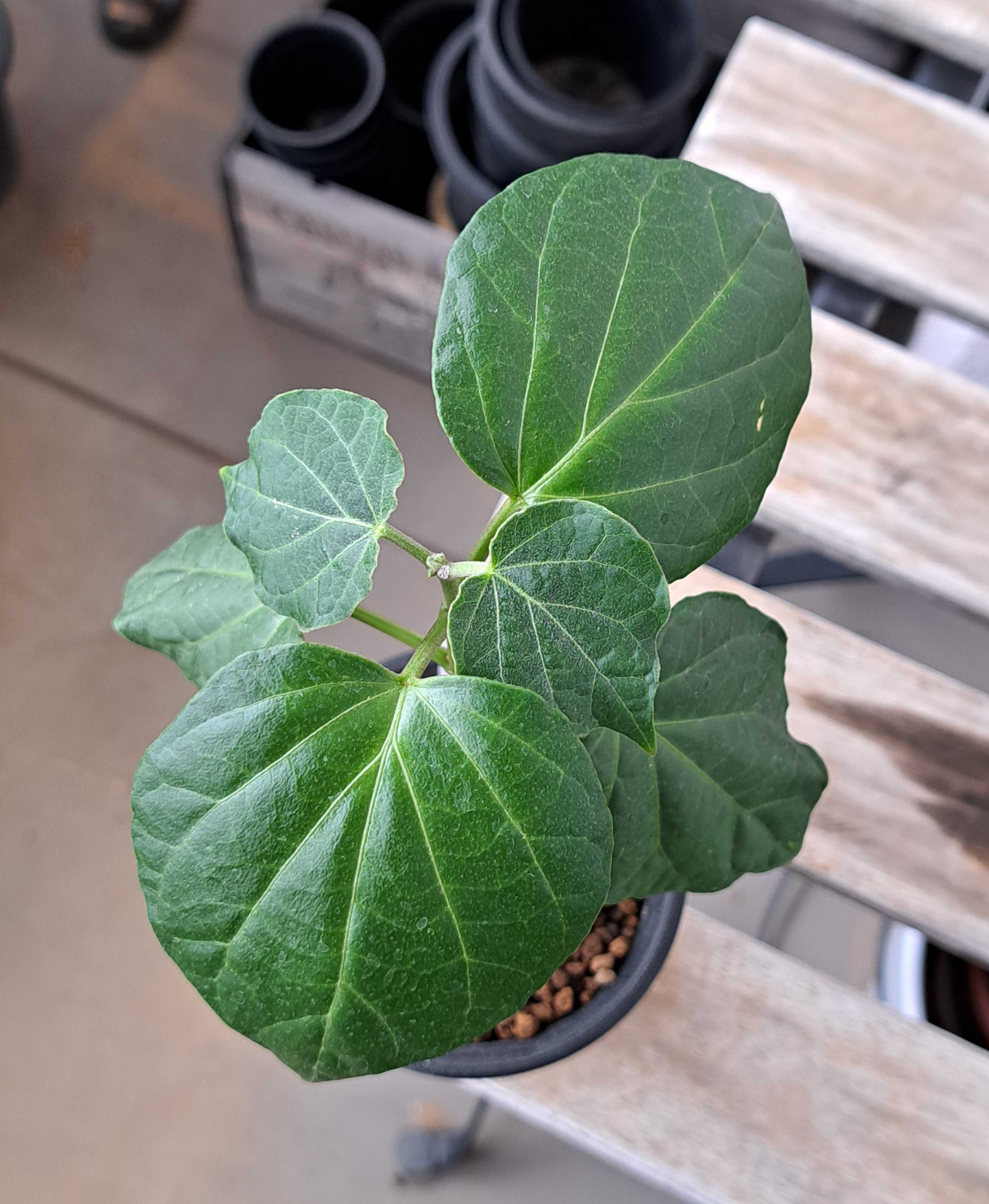 これまた信頼のブランドカクタス長田産。フィカス・ペティオラリスだ。丸い塊根から細い茎がすーっと伸び葉を付ける。やはりこのカタチは魅力的だ。葉は結構デカい。ハート型で葉脈が赤い。観葉植物としても通用しそうなものだ。検索するともっと葉脈が赤く葉柄も赤いものがヒットする。室内置きで売られていたので日に当てたりするともっと鮮やかな色が出る可能性もあるかもしれない。育て方を見ると直射日光によく当てることとある。植え替えて慣らしたあとはたっぷり日に当ててやろう。塊根を見る。すべすべ肌で白っぽく、丸みを帯びた塊根。かなり良いではないか。理想に近い。マテレア・シクロフィラもそうだったが苔が生えている。カクタス長田さんでは水やりかなり多めだったのだろうか?真夏は毎日水やりするぐらいだったのかもしれない。反対側。真ん中ちょい下から根が出て地中に達している。緑色の根。まだ新しいものだろう。数多あるコーデックスの中でも観賞価値は結構上の方ではないだろうか。塊根も葉も秀逸。これはいいわ。大事に育てよう。珍しい フィカス ペティオラリス 4号 赤い葉脈が美しい ゴムの木 ウンベラータ 塊根植物 コーデックス 観葉植物観葉植物 フィカス ペティオラリス【お試し】 フィカス(ペティオラリス)4号 黒色 プラスチック鉢(バークチップ) 赤ウンべ 赤ウンベラータ フィカスペティオラリス プラ鉢 苗 苗木 黒 ブラック 丸 4寸 12cm 観葉植物 植物フィカス・ペティオラリス 9cm鉢 カクタス長田 クワ科 多肉植物 コーデックス 塊根植物 サボテン 珍奇植物 サキュレントプランツ観葉植物:フィカス ペティオラリス 鉢植え*受皿付 飾り石