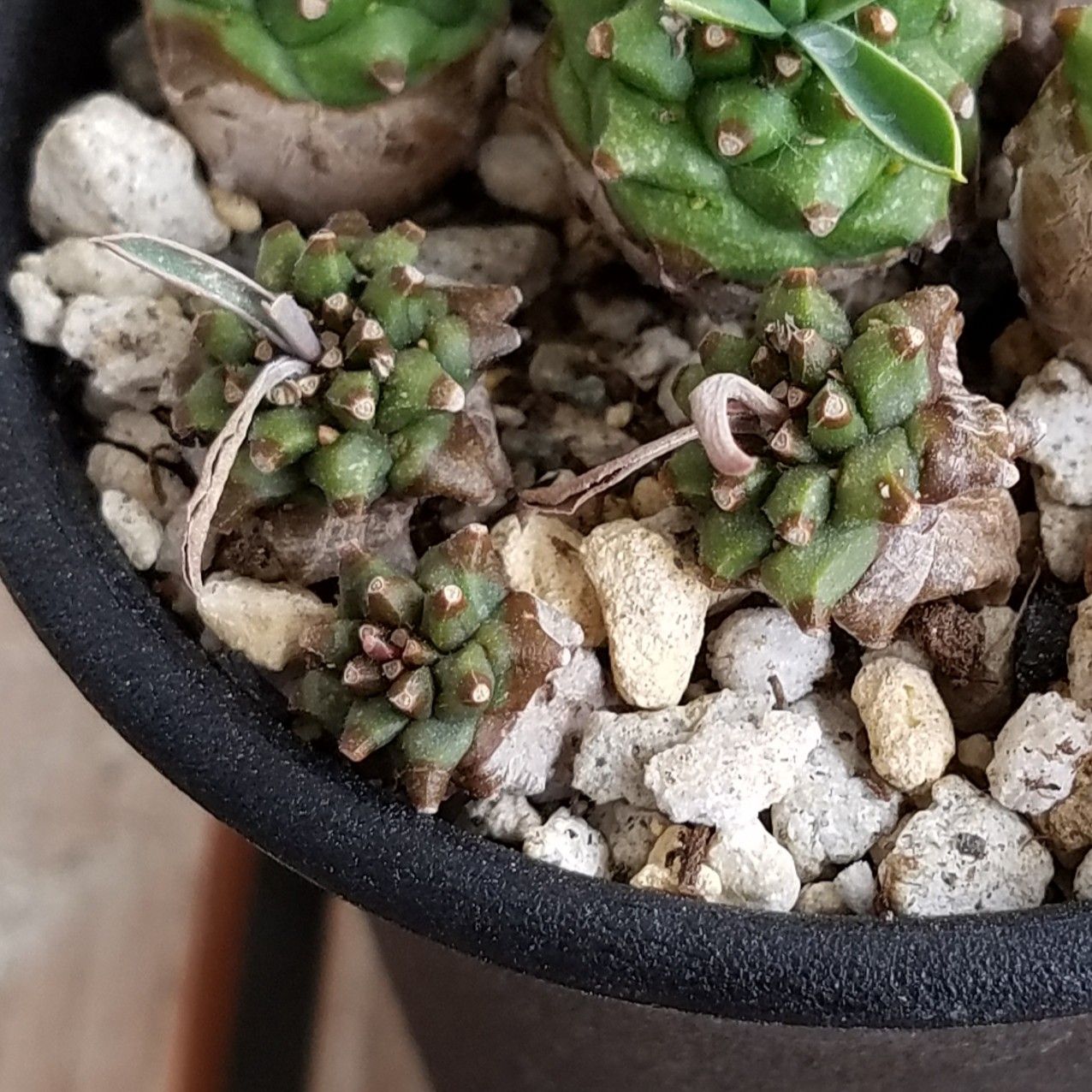 去年の植え替え時に仔を取ってひと鉢に詰め込んだものだ。