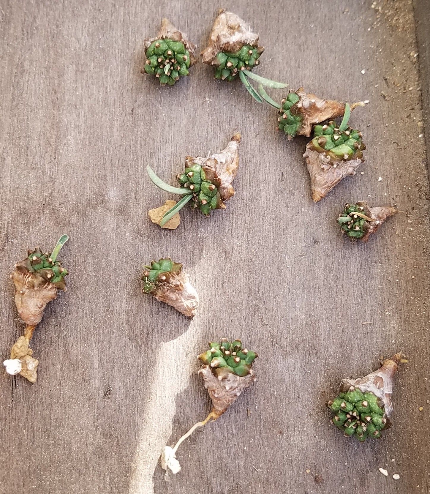 上の5個は根も張り青い葉を出しているが下の6個は葉を落とし縮こまっている。