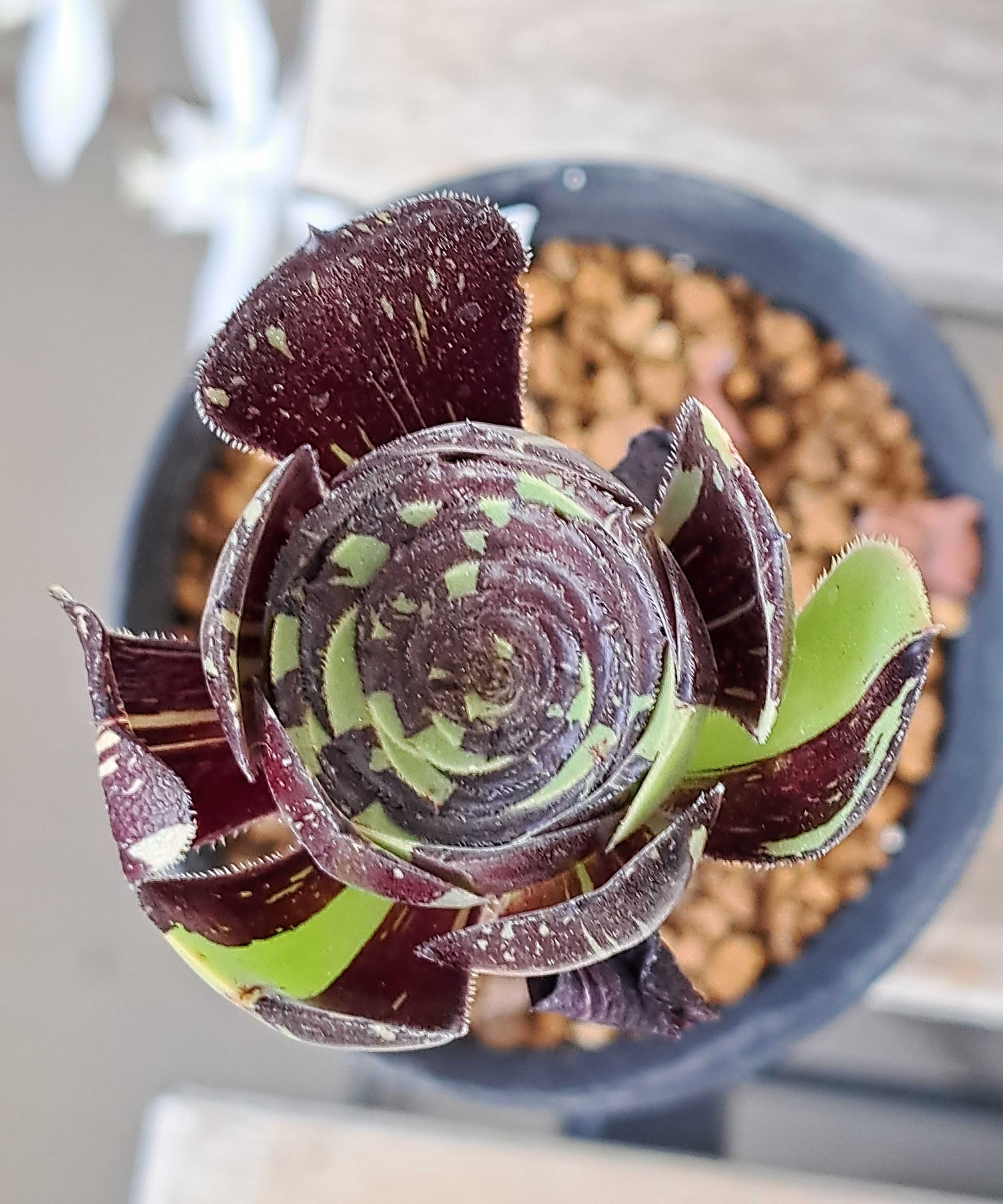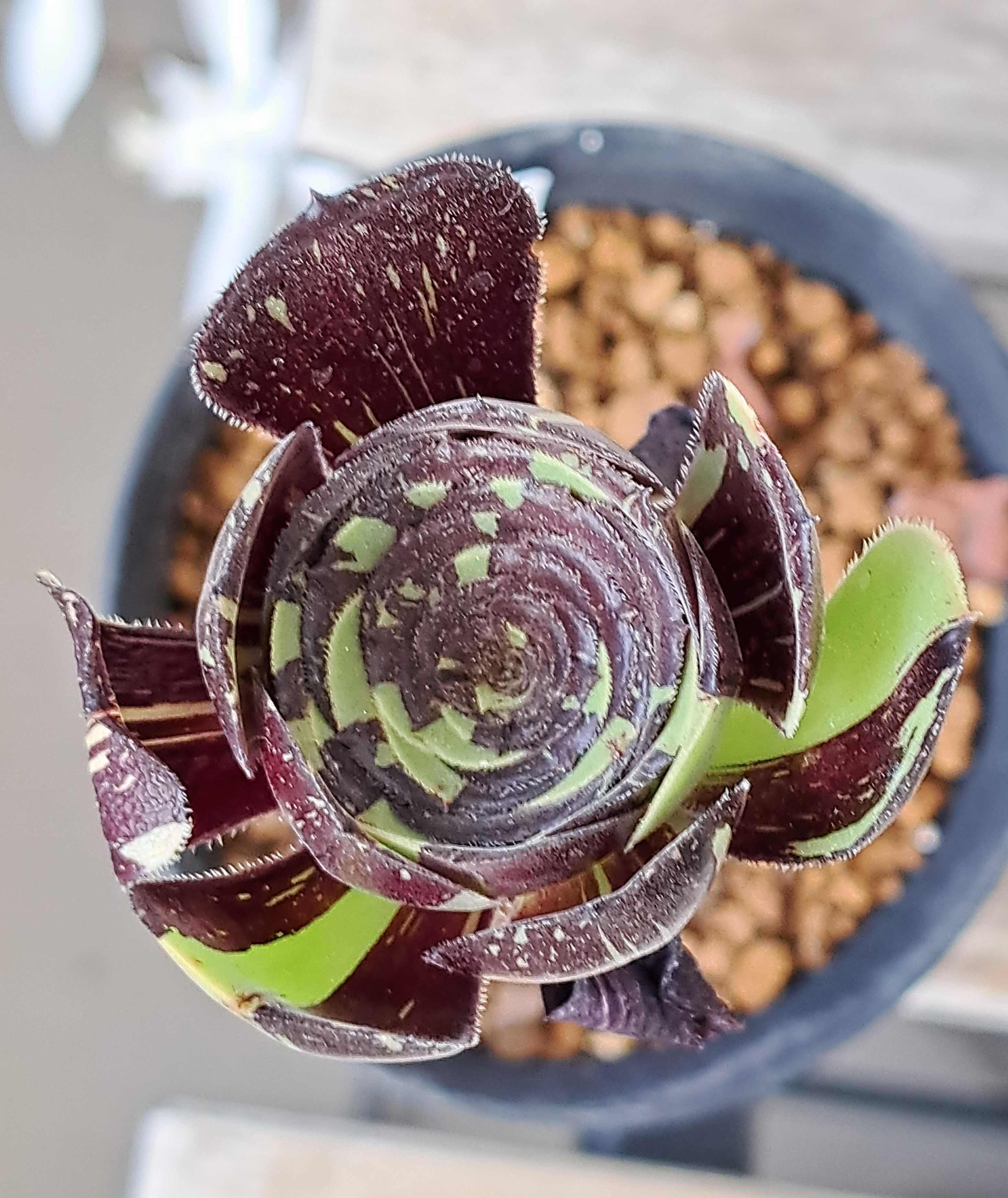 アエオニウムは夏から秋にかけてその表情を大きく変える。まるで別物?とも思えるぐらいその変化は激しい。ビッグバンの変化具合を見てみよう。猛暑真っ只中の8月19日。焼肉屋で出てくるタマネギの輪切りみたいな、真ん中にぎゅーっと詰まった姿。夏のアエオはこうなる。暑さも和らいだ10月14日。成長が始まっている。ぎゅーっと詰まった葉が外側から開いてきている。ただ葉焼けもある。それまで日陰だったところが太陽位置の変化により日が当たり出したことでできたものだと思われる。10月21日。詰まった部分はなくなり全て開いた。まだ葉は短いが寒くなるにつれて伸びてくる。それよりコレ斑が抜けてきてないか?やけにミドリなんですけど。日の当たり方が足りないのかもしれない。黒法師も日照時間が少ないとミドリになるもんな。コレとか…コレなんかも…こうやってミドリになってしまうヤツもいる。やはりもっと日に当てないといかん。ということでベランダ最前部に移動したっぷり日を浴びせた結果ビッグバンは現在こうなっている。おお!見事に復活。抜けかけていた斑が戻った。来年はもう少し早めに日に当てよう。斑がなくなったらイヤだもんね。このビッグバンは斑の入り方がきれいで気に入っているのだ。何かが爆発して破片が飛び散る、そんな風に見えるこの模様。めちゃ面白い。引き続きよく日に当て水は2週に1回たっぷり。これできれいに育つはずだ。ビッグバン現物 アエオニウム属 マイバッハ錦(群)特大 R910 厳選 極上株 多肉専門VERVE農園直売 多肉植物 寄せ植え アエオニウム属 ガーネット白斑錦(群)特大 超美苗 観葉植物 インテリア 多肉専門VERVE【マラソン★クーポン配布中】アエオニウム 甜 ( てん ) 茶錦 多肉植物 3.5号ポット 多肉植物 寄せ植え ガーデニング リビング オフィス 事務所 インテリア? 送料無料 即納観葉植物/アエオニウム:小人祭錦 2号ポット