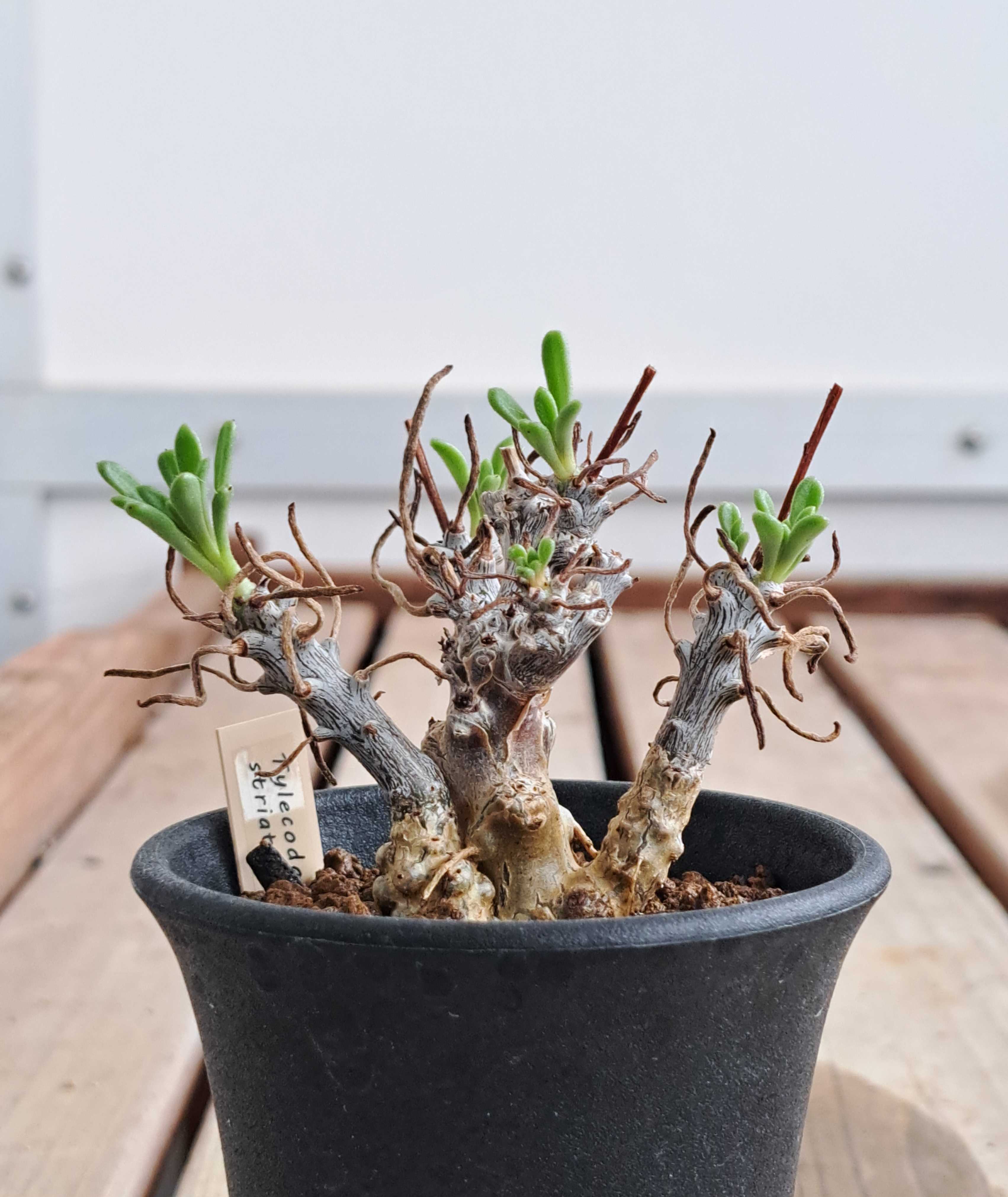 チレコドン・パニクラータスが目覚めた。先端左側から葉が出始めている。2枚出てきているのか?いや、もっとだ。4枚ぐらいは一気に出そうだね。チレコドンもそろそろ動き出す時期か。そういえば毎年このぐらいだった気がする。ということはコイツも起きたかな?群卵。う~ん。コレはまだだな……いや違う……出てる。きれいなミドリの新葉。あちこちから出てきている。成長開始だ。おめでとうございます。ブッコルジアヌス。コイツはもう2、3年葉を出していないので動き出したかどうかは分かりずらい。動くのは下の方、地べたに近いところ。どうかな?活性化すると枝先が赤く光るのだが…。まだかね?ストリアツス。これはもう全く動いてないね。休眠まっただ中って感じだ。どんな葉だったかも思い出せん。確認してみよう。ああ。こんなだったね。こうなるのはだいぶ先のことだろう。でもとりあえずそろそろ起きてほしいものだね。ワリチー チレコドン 多肉植物 ビザールプランツ サボテン アガベ 塊根植物 ユーフォルビア 寄せ植え インテリア 観葉植物 おしゃれ 雑貨コーデックス:チレコドン スルフレウス*葉幅6.5cm 現品!一品限りコーデックス:チレコドン ノルティ*葉幅4.5cm 現品!一品限りコーデックス:チレコドン オペリー*葉幅1cm 現品!一品限りコーデックス:チレコドン オペリー*葉幅1.5cm 現品!一品限り