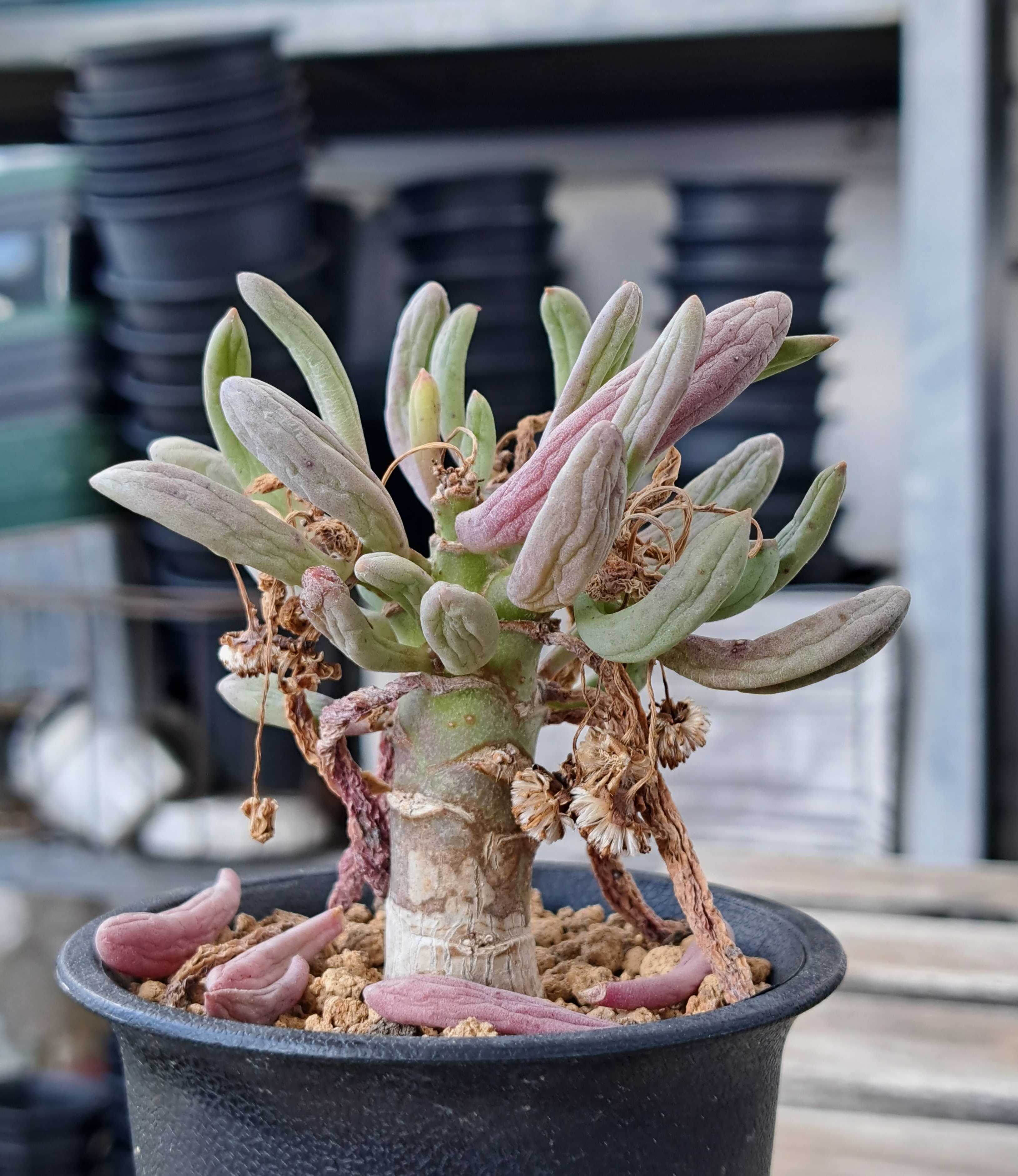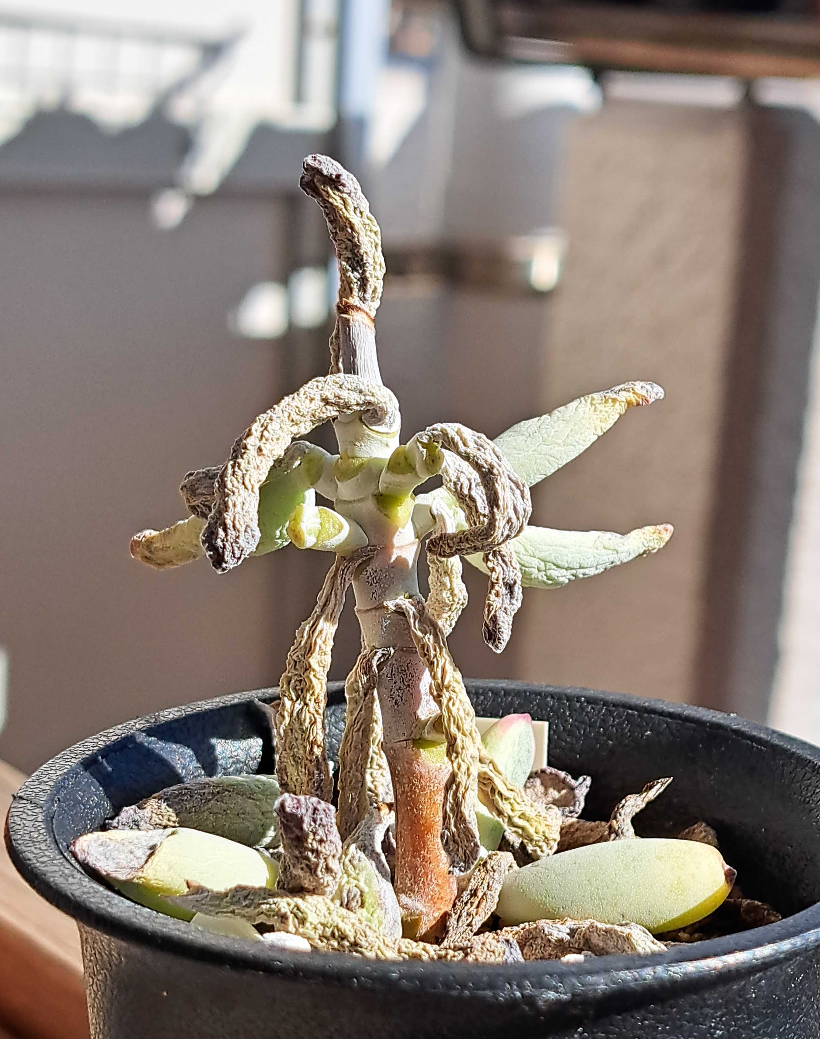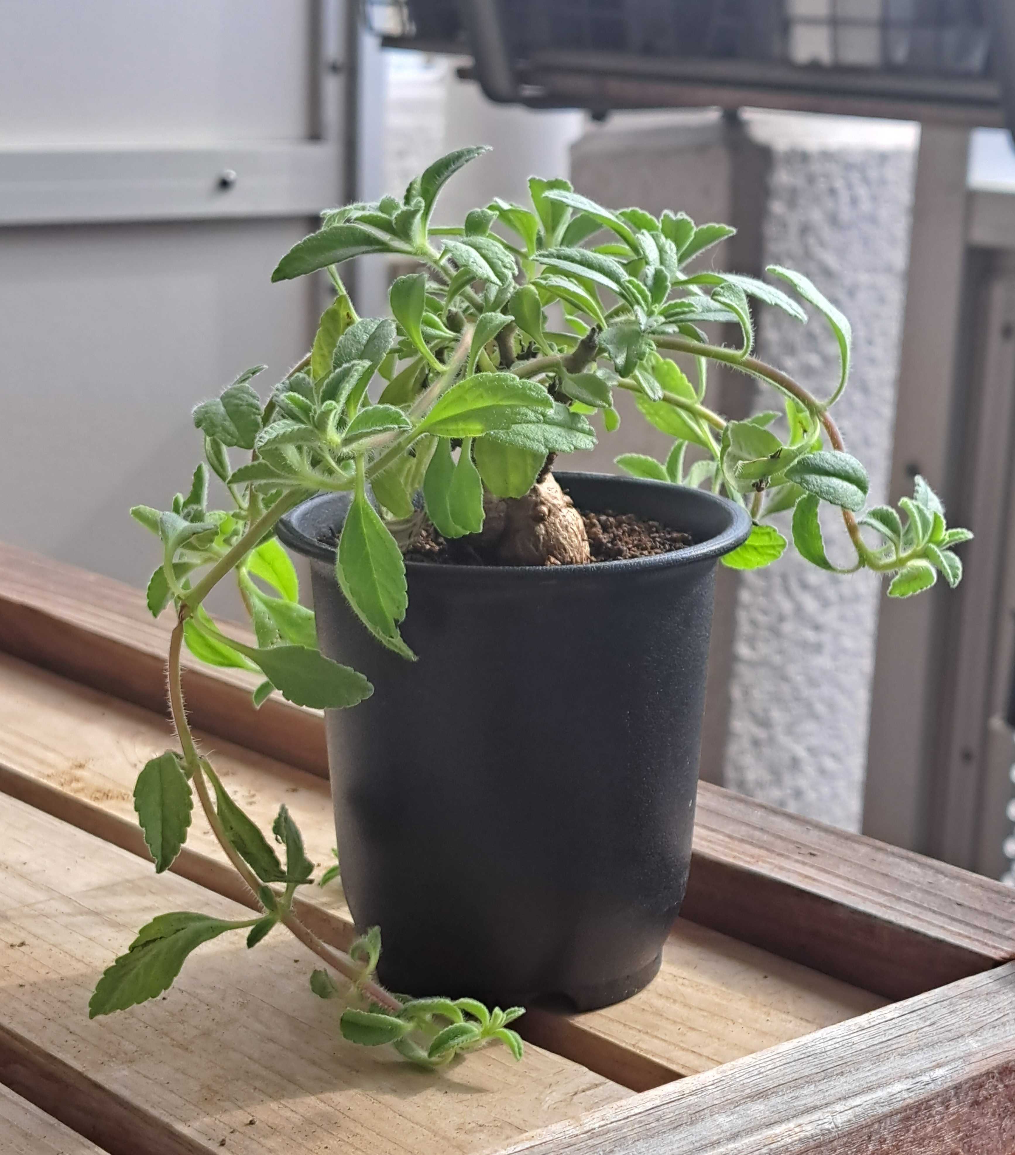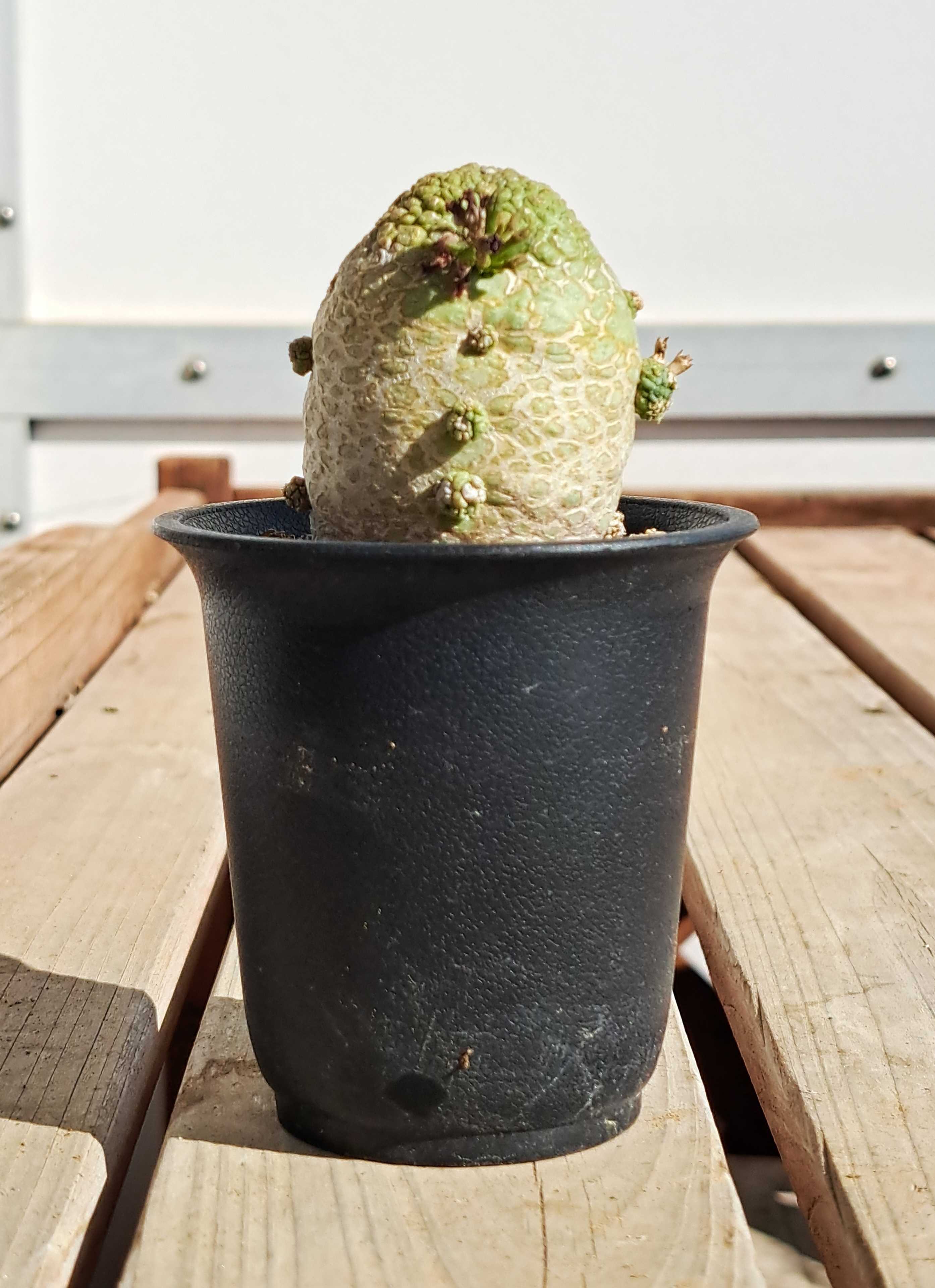 プレクトランサス・テヌイフローラスを買ったのは去年の10月24日。その時の姿がコレ。そして一年後の現在がコレ。だいぶ小さくなってしまったがこれは春にツルを切ったため。冬の間も成長していたのかツルはあちこちで地面に達し邪魔だったのだ。せっかくの塊根も見えないし…ということでカットした。その時の姿がコレ。3月16日。ある程度葉を残している。新芽もあちこちにありまたすぐにワサワサになるだろうとおもっていたがそうはならず7月28日。逆にヤバい状態になってしまった。さらに、9月29日。うわあ。もう葉がほぼなくなっている。このまま枯れてしまうのか?と思いきや、現在は、ちょっと復活している。どうやら暑いのは苦手みたいだ。エルンスティーも夏に枯れた。コイツも夏に葉を枯らす。ツルが伸びたのも秋から春。冬型の動き方だ。でもネットで見ると夏型って書いてあるんだよね。まあいいや。うちでは冬型とさせてもらう。もう一個のテヌイフローラスも見ておこう。う~ん。いまいち。葉はツルの先端に付くのみ。新しい芽はごくわずか。大丈夫かな?ちょっと不安だ。挿し木の方はどうかな?ダメっぽいね。もう少し様子見て成長しなければ廃棄しよう。リベンジで7月に買ったエルンスティーも見ておこう。コイツは元気そうだ。くそ暑い時期に買ったので室内に置き、その後もずっと室内だが、それがいいのかもしれない。テヌイフローラスもひょっとしたら年中室内が良い可能性はある。2個あるから1個通年室内にするかな。マンジェリコン(ボルド) (プレクトランサス:バルバーツス) 3.5号 ポット苗 1鉢 ボルトジンユ Plectranthus barbatusペラルゴニウム・トリステ (実生) 7.5cm鉢 カクタス長田 フクロソウ科 テンジクアオイ属 多肉植物 冬型コーデックス 塊根植物 サボテン 珍奇植物チレコドン・xブレッキアエ 7.5cm鉢 カクタス長田 ベンケイソウ科 多肉植物 ハイブリッド サキュレントプランツ 珍奇植物 冬型 コーデックス観葉植物/マテレア:シクロフィラ 3号鉢植えチレコドン・パニキュラツス 阿房宮 9cm鉢 カクタス長田 ベンケイソウ科 多肉植物 冬型 コーデックス 塊根植物 珍奇植物