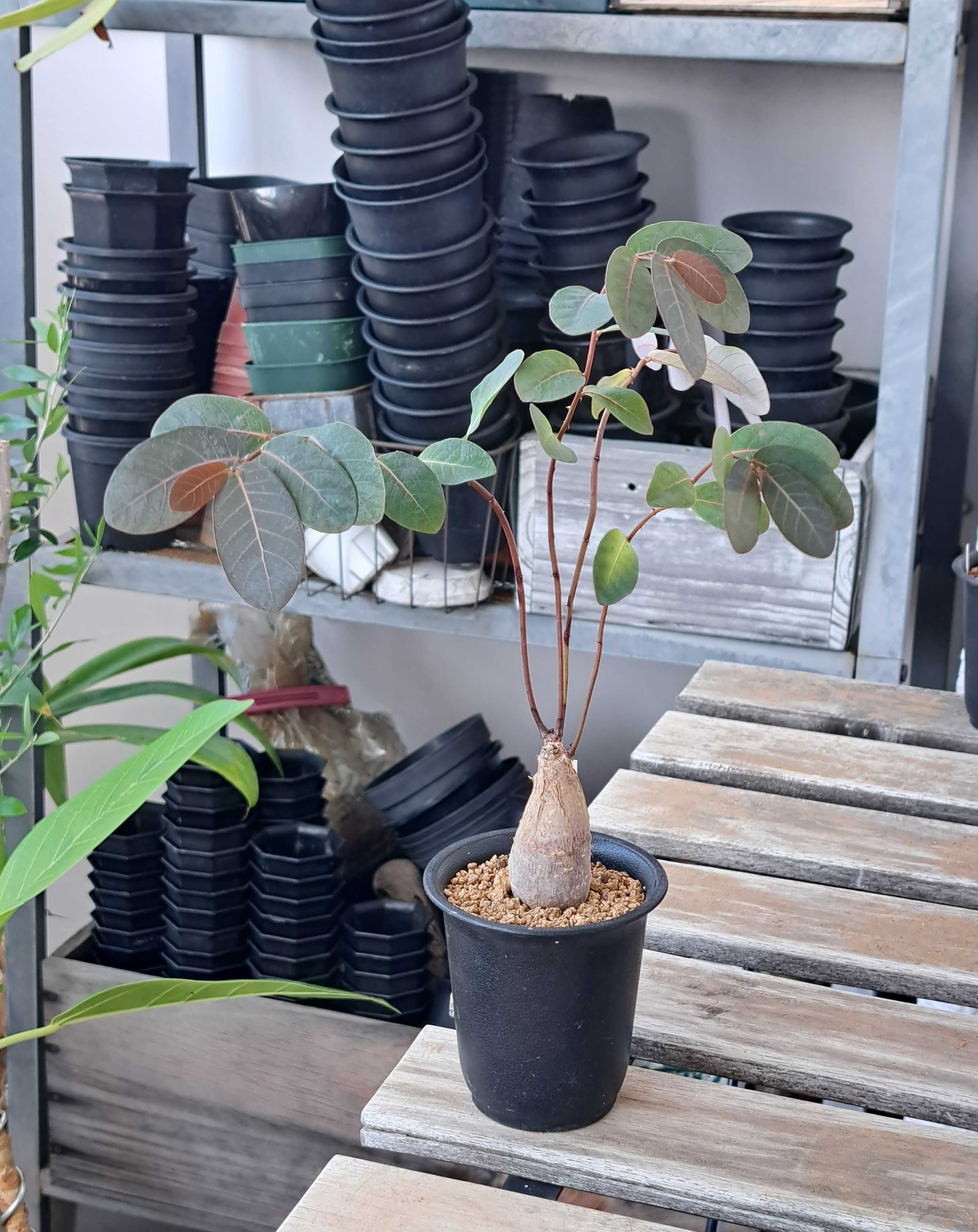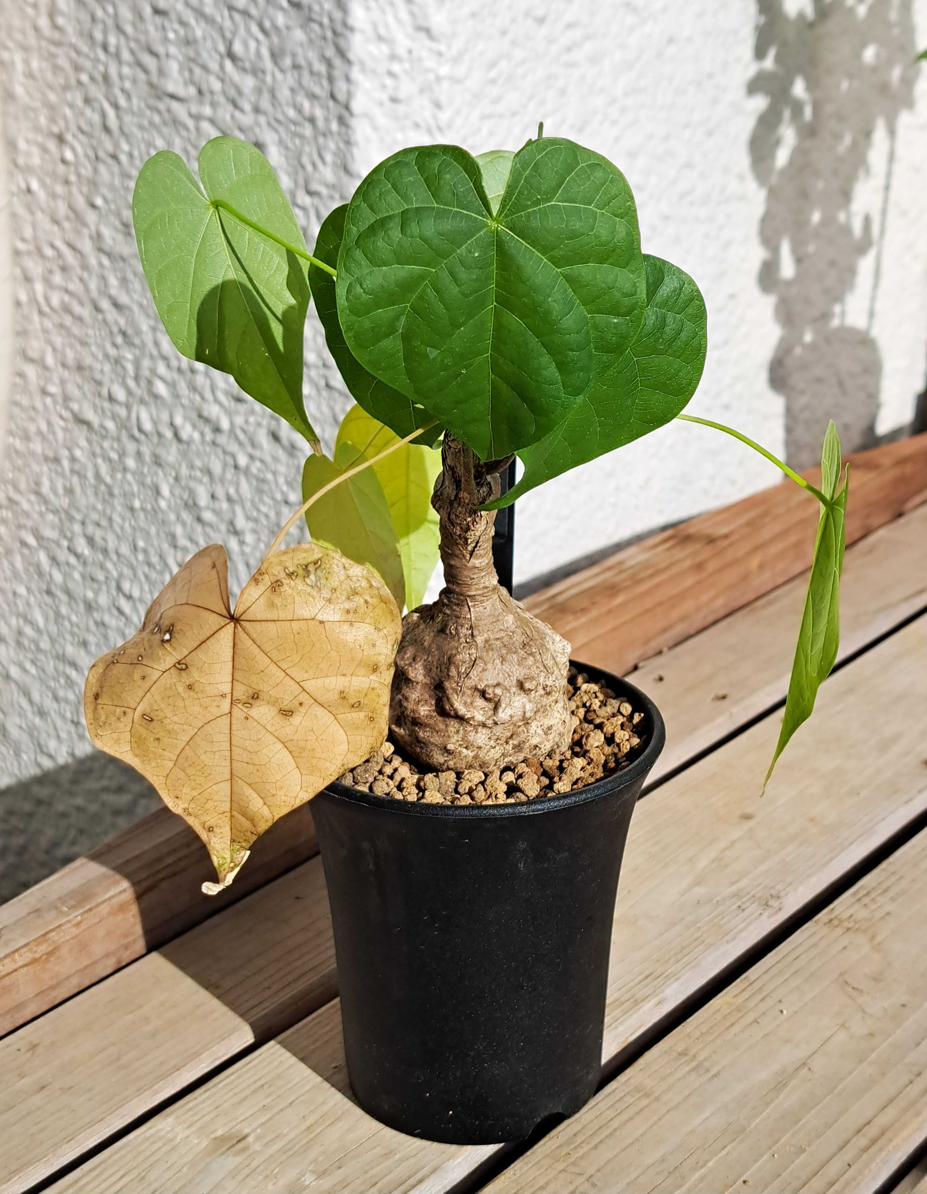 2022年8月22日。ウンカリーナ・ルーズリアナは絶好調。葉はデカく茂り花まで咲かせている。だが、葉がデカかったのはここまで。翌2023年7月26日。花は咲いたものの葉はデカくならない。前年とはエライ違いだ。さらにこの直後鉢を落下させたか何かで枝が折れる。そして2024年7月29日。小っちゃ…。あのデカい葉はもう出ないのだろうか。2025年8月16日。寄せ植えにしてみたが今年も小っちゃい葉しか出ない。花も結局初年度に咲いたっきりだ。現在この鉢はこうなっている。相変わらずデカい葉は出ない。次々葉は出すが同じペースで下葉が枯れる。夏場からずっとこうだ。他のヤツも同じような感じで、コイツも葉はこんなもん。あの初年度のデカい葉を出させたいのだが全然出ないじゃないか。と思ったら一個だけ、いたぞ!デカい葉野郎!さっきのヤツと比べると一目瞭然だ。数倍の面積。巨大葉。コレだよコレ。コレを求めていたんだ。巨大葉とっても茎は細~いのよ。ヒョロヒョロ茎に巨大葉。なぜコイツだけ巨大なのか?他のヤツと違うところは…塊根を埋めているのだ。それしかない。塊根を埋めて育てると早く太ると言うが、葉もデカくなるのではないか?もしくは鉢が他よりデカいから。2.5号鉢植えだが他は2号。2.5と2はだいぶ違う。鉢がデカく土がたくさん入るため水切れが遅い。2号だと夏なんか1日で乾いてしまう。水切れが頻繁に起こらないためよく成長する。こっちの方が納得するかな?う~ん。よく分からん。ペトペンチア・ナタレンシス (良型個体) 9cm鉢 カクタス長田 ガガイモ科 多肉植物 コーデックス 塊根植物 サボテン 珍奇植物 サキュレントプランツフォッケア・エデュリス 火星人 9cm鉢 カクタス長田 ガガイモ科 多肉植物 コーデックス 塊根植物 サボテン 珍奇植物 サキュレントプランツオトンナ・クレムノフィラ 9cm鉢 カクタス長田 キク科 多肉植物 冬型コーデックス 塊根植物 サボテン 珍奇植物 南アフリカ原産ディオスコレア・エレファンティペス 亀甲竜 9cm鉢 カクタス長田 ヤマノイモ科 多肉植物 コーデックス 塊根植物 サボテン 珍奇植物 南アフリカ原産マテレア・シクロフィラ 9cm鉢 カクタス長田 ガガイモ科 龜甲蘿藦 多肉植物 コーデックス 塊根植物 珍奇植物 コルク質肌