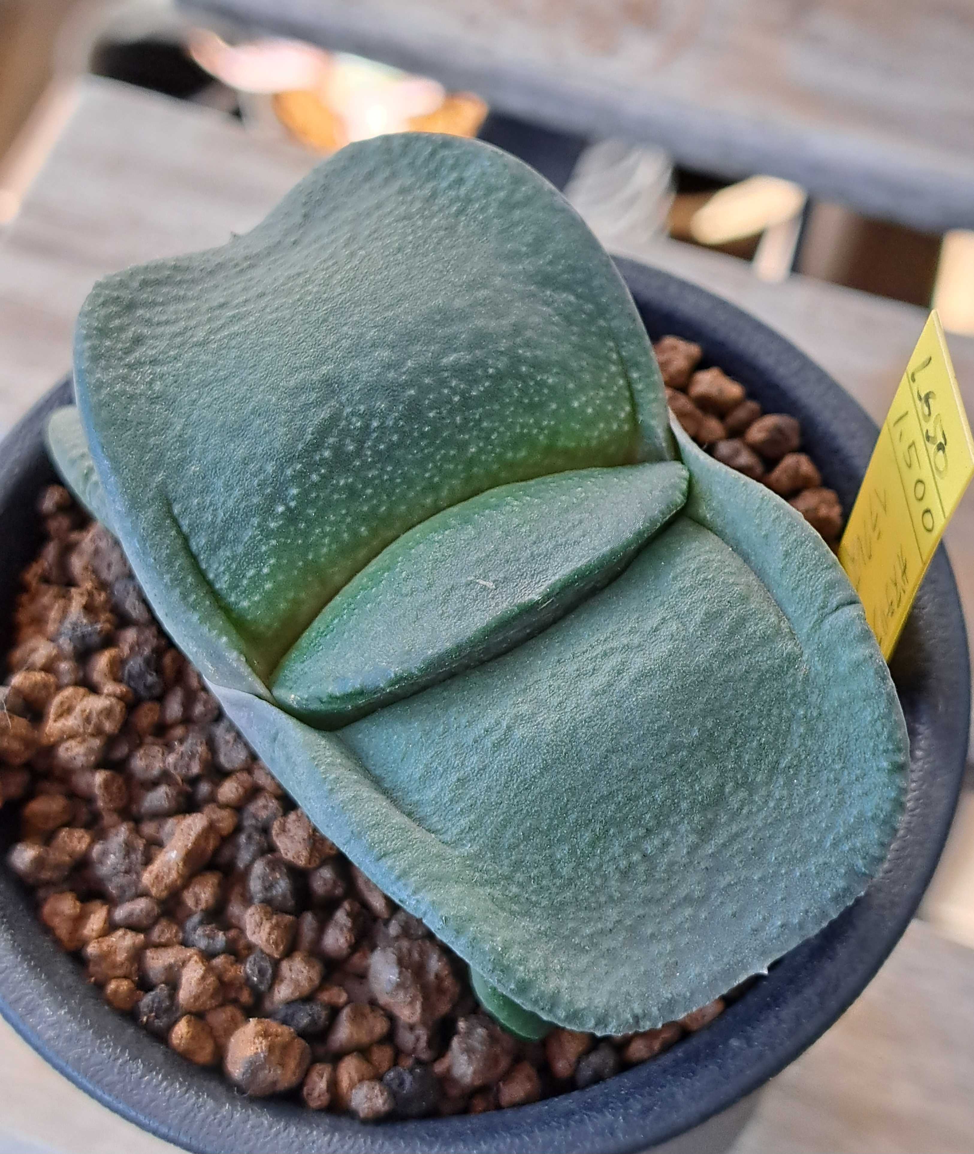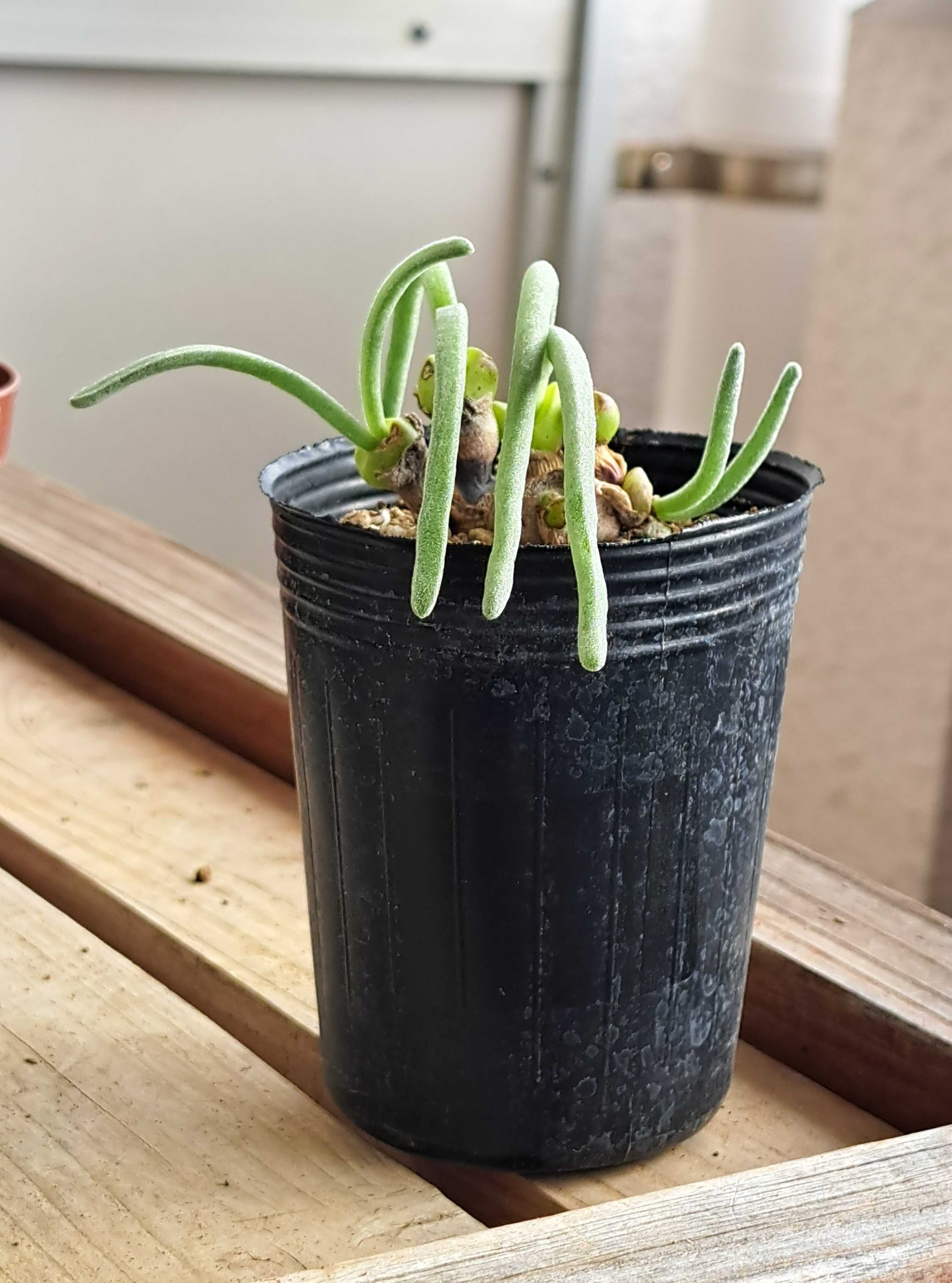 最近ちょくちょく記事にしているモニラリア・モニリフォルメ。購入したのは去年の10月22日でコイツも丸一年が経過した。購入時の姿はコレ。これが一年でどう変化したか?現在はコレだ。おい。全然違うじゃねえかよ。購入時には長く伸びた葉がいくつもあるが現在はごく短い葉がチョロっと出てるだけ。いやこれでも順調に生育してるのよ。1ヶ月前の9月29日時点ではコレだ。暑い時期には葉を枯らし基部だけになるらしい。しかも葉が枯れるのは早く4月22日時点でこの姿。早っ!マッソニア並みに早ええじゃん。4月に枯れて秋までこのままかい?長げえなおい。しかし...いつも思うことだがこの苗を育てて店に卸しているナーセリーではどうやって夏越しさせているのだろう。購入時コレだよ。コレ葉をつけたまま夏越ししたんじゃないの?夏にいったん葉を枯らしたものの再び葉を出し10月22日の時点でここまで伸びたとは考えずらい。オトンナ・クラビフォリアもそうだしウンビリクス・ルペストリスもそうだし、いったいどういう風に管理したらこうなるんだ?全く分からん。まあいい。2号と3号の様子も見ておこう。2号。3号。葉がぐんぐん伸びているね。あ…。ということは去年の購入時にはすでに新しい葉が出て伸びていたということか。この成長速度なら考えられるな。夏には枯れたが管理が良いため始動が早く、よって10月22日時点ではすでに葉が伸びていた。そういうことかもね。モニラリア・モニリフォルメ。よく日に当て葉が伸びすぎないようにする。水は表土が乾いて2、3日後にたっぷり。さてどこまで成長するか?観察を続ける。【希少】モニラリア 6cmポット チョキのようなかわいいフォルム(多肉植物)モニラリア モニリフォルミス 2.5号(1ポット)多肉植物 caモニラリア クリソレウカ 多肉植物 コーデックス 6cmポットモニラリア・モニリフォルミス 7.5cm鉢 カクタス長田 ハマミズナ科 冬型メセン うさぎ耳 南アフリカ原産 多肉植物 モニリフォルメ 塊根性スクタータ