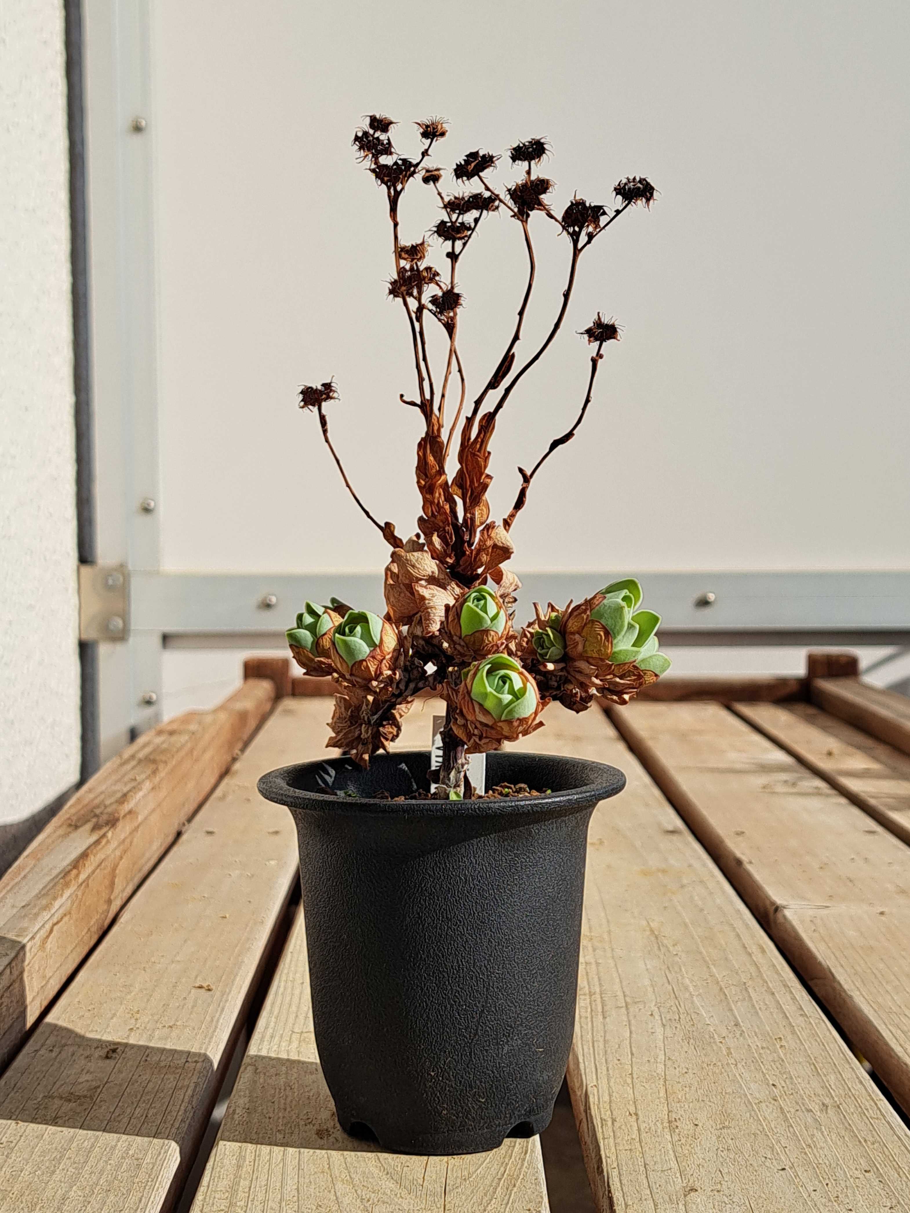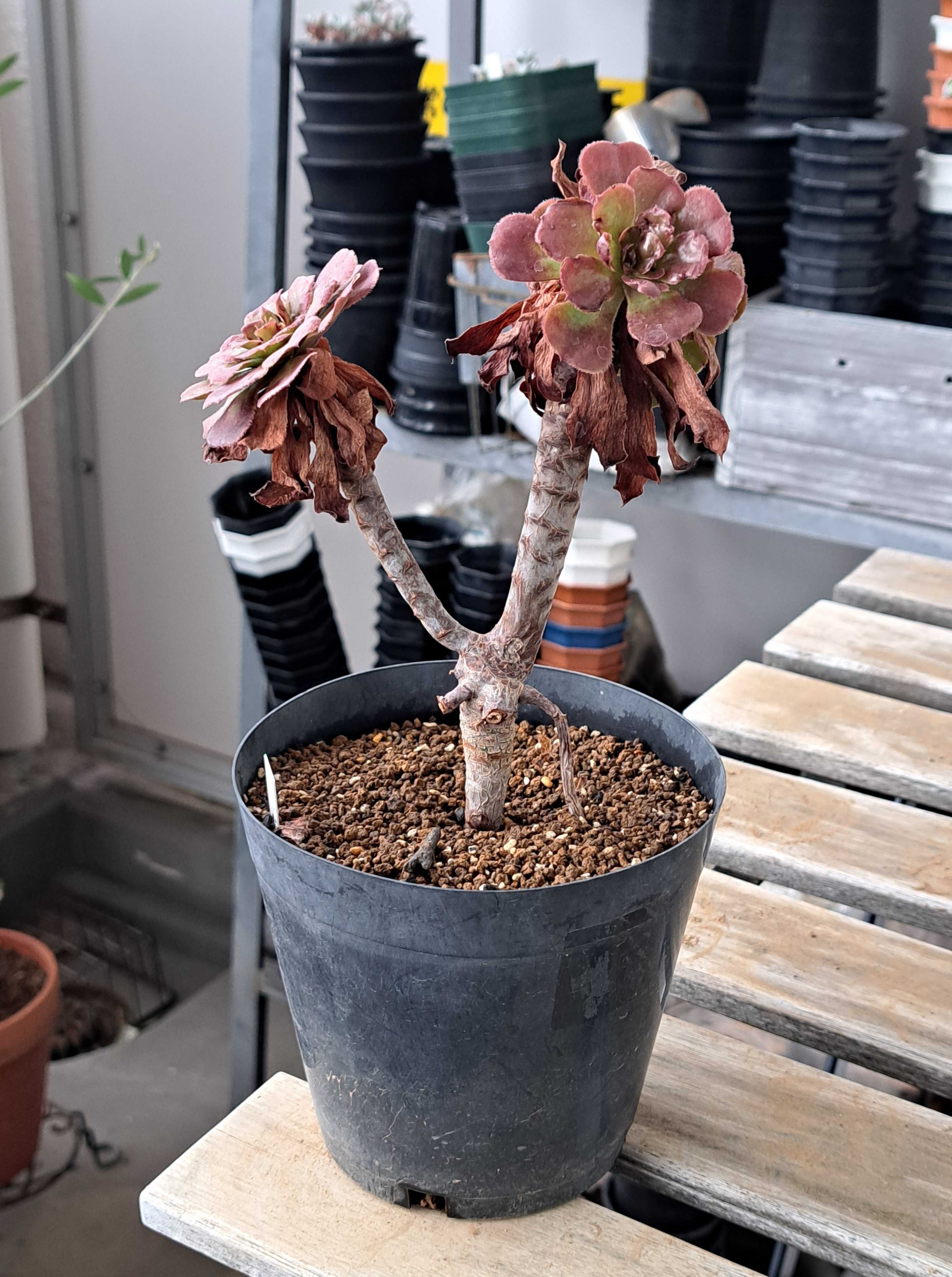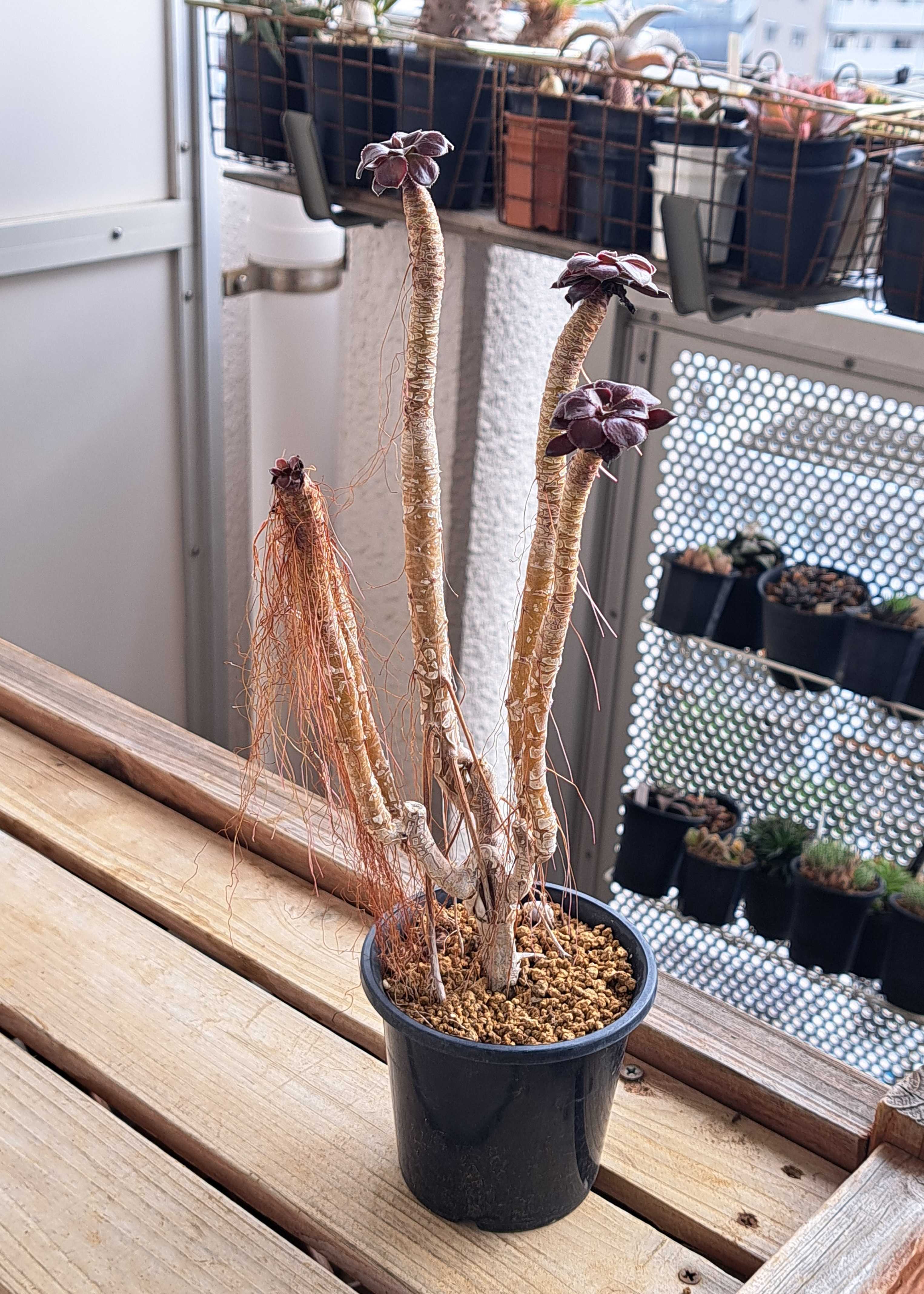 アエオニウムその3は黒法師だ。気根ボーボー黒法師。生育が悪い。そもそも気根が出てきたのも茎に異常があるためだと思われる。ロゼットまで水分や栄養分が上がってこないのだ。全く動いていないわけではない。ゆっくりとロゼットは成長している。問題はその成長速度だ。これが普通。縮こまっていたロゼットが盛り上がり葉が長くなる。この時期はだいたいこうなのだ。茎の大元に異常があるため全枝生育不良なのだ。少し前から思っていたが切っちゃえ。切り口を数日乾かし土に挿す。残った元の方。コイツはもうダメかもしれんが芽が出る可能性もあるので捨てずに持っておく。二股の黒法師。枝先はさらに分岐している。コイツも通常より生育は悪いが一応動いてはいる様子。ロゼットは盛り上がり葉が伸びてきた。5個あるロゼット。中にはミドリのものや黒とミドリが混じるものがいる。以前はもっと黒ミドリ入り交じりが多かったのだがいつの間にかこうなった。数本の寄せ植え。挿し木をまとめたものだ。黒っぽいヤツ、赤っぽいヤツ、まだら、いろいろいる。よく日に当てできるだけ黒く育てたいもんだね。(多肉植物)アエオニウム 黒法師 2.5〜3号(1ポット)まだら黒法師(マダラクロホウシ) アエオニウム属 多肉植物 9cmポット観葉植物 雑貨 おすすめ インテリア 暮らし 多肉植物 ポット ロゼット 多年草 Aeonium【黒法師】★ アエオニウム サンシモン ロゼット状の葉 多肉植物 おしゃれ インテリア 贈り物 プレゼント□多肉植物□ センポニウム デスティニー 4号ポット苗 〈アエオニウム(黒法師)×センペルビウムの交配によって生まれた新品種〉