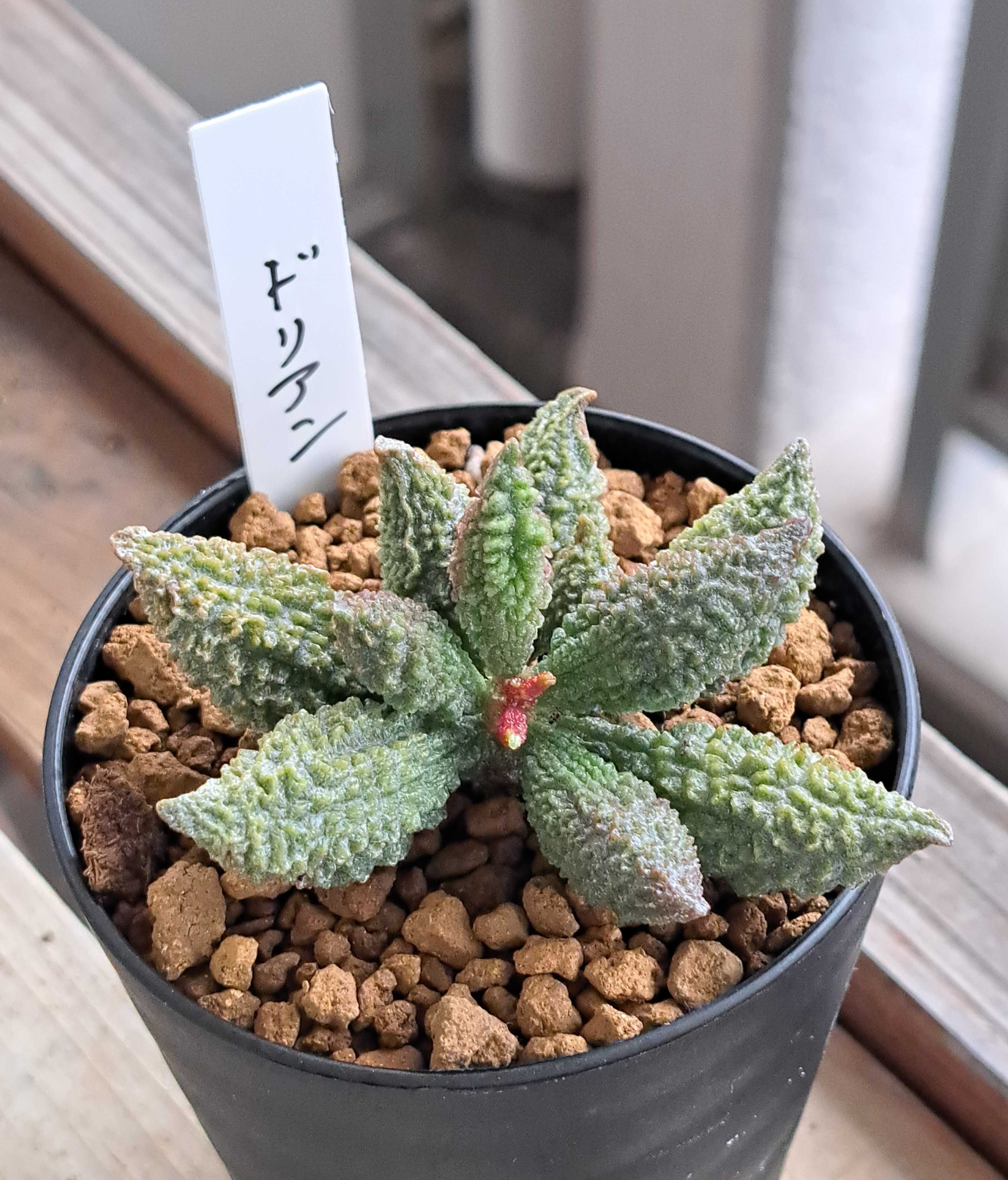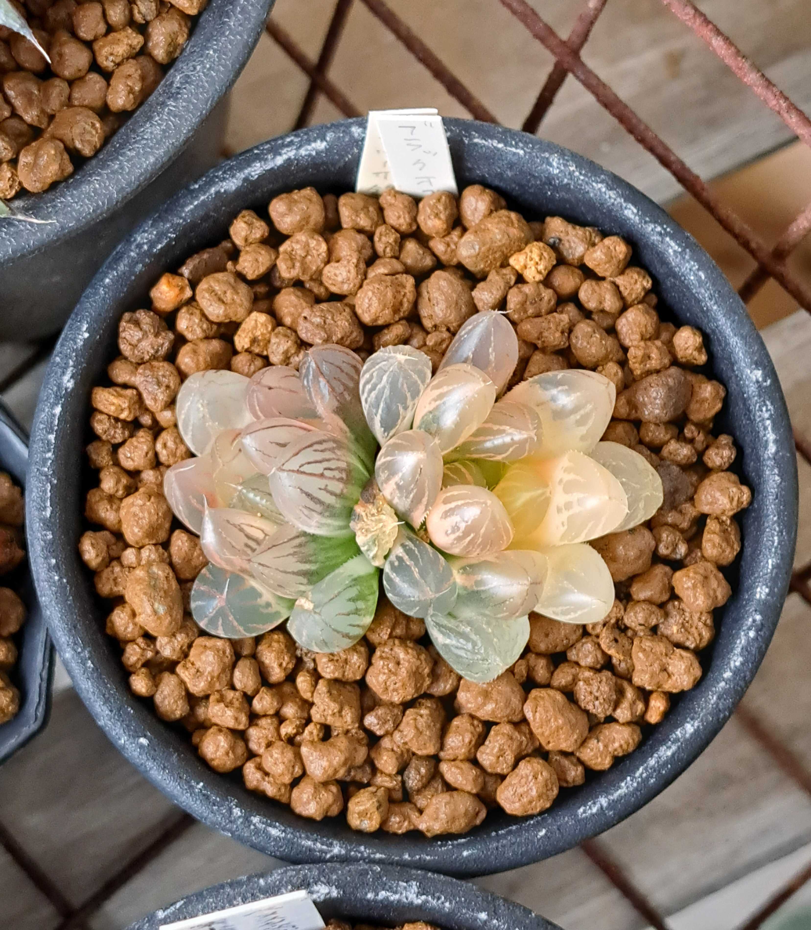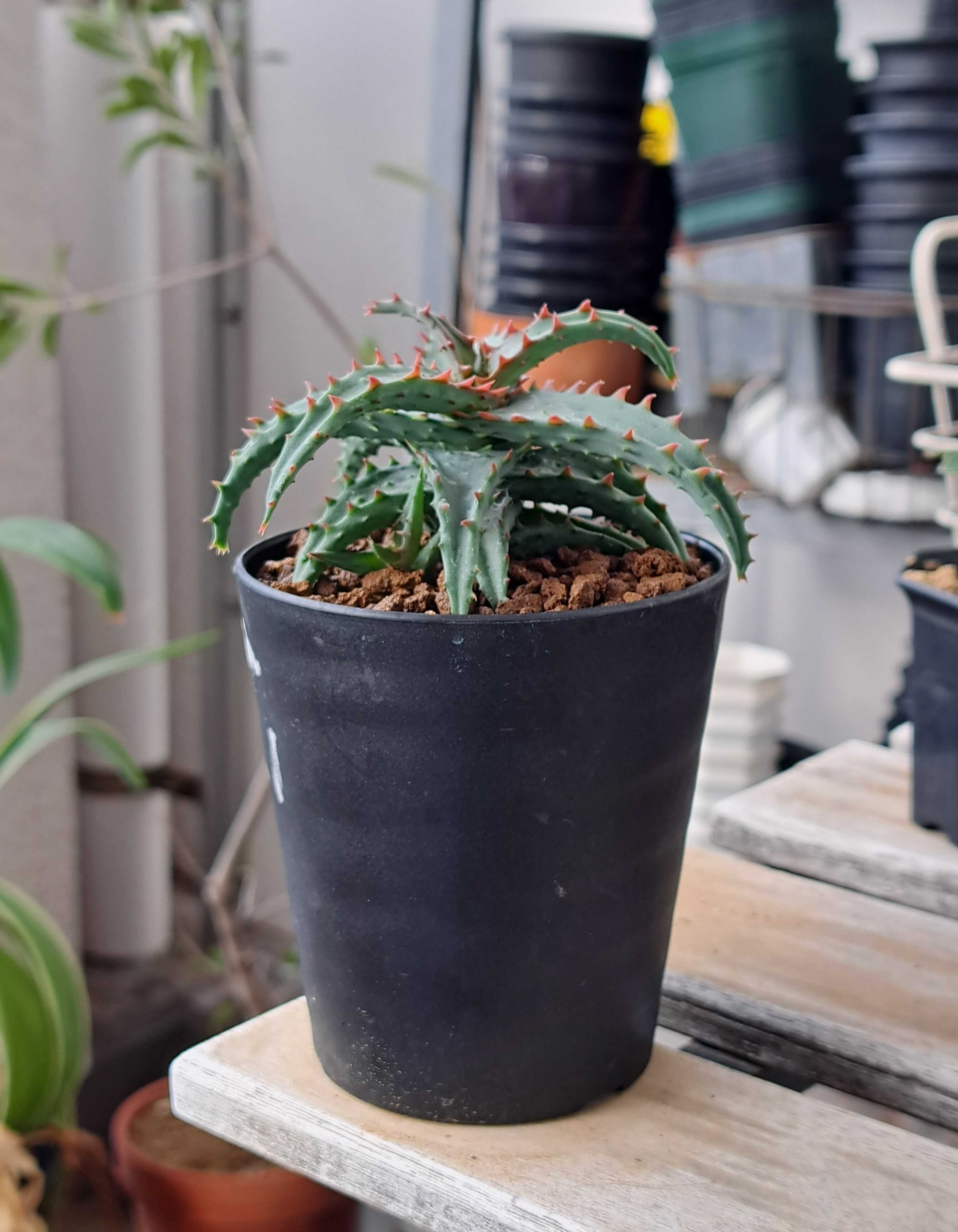 長い間ほったらかしにしていたハオルチアを植え替えたぞ。数日前に1回やったから第2弾だ。まずはブラックオブツーサ錦。育てやすいオブツーサは斑入りも同様。数年経っているが暑さにも寒さにも強く通年ベランダ柵裏半日陰で難なく過ごしている。普通のオブツーサの斑入りとはまた違った美しさ。なんだか幽玄な雰囲気を持つ。バデア白鳳。白雲が入るバデア。購入から何年経っただろうか?ええと………2020年5月か。5年以上経っているな。順調に育ってきた。最初は2号カクカク鉢でもデカいぐらいだったが今では3号鉢ではみ出すぐらい。紫玉絵巻。毛深いベヌスタ交配種。2023年2月にめちゃ小さいロゼットも形成されていないものを購入し2年半。だいぶ成長した。毛足の長いところ、紫の色味、スゲー好みだ。大きくなったら迫力出るだろうな。大黒白銀。ダークグレーと赤紫で構成されるピクタ。寒い時期にはもっと暗い色合いになる。どす黒い…と言っていいほどだ。パステル系のピクタとは一線を画す渋いヤツ。リミフォリア曙斑。買ったときはきれいな曙斑が入った素晴らしい株だったが斑はすぐに消えただのリミフォリアに成り下がった。これが購入時。2022年11月。このときは良かった…。斑はもう二度と戻らないのだろうか?多分そうなんだろうね…。さみしい...。ブラックオブツーサ錦多肉植物:ハオルチア Y氏 バディア*幅9cm 現品!一品限り白雪絵巻(シラユキエマキ)【デラックス多肉】ハオルチア属 多肉植物 10.5cmポット観葉植物 雑貨 おすすめ インテリア 暮らし ハオルシア haworthia サボテン 植物観葉植物/ハオルチア:森の妖精(シルバーボール×白銀絵巻) 2.5号スクエア鉢白銀の園(ハクギンノソノ) ハオルチア属 多肉植物 9cmポット観葉植物 雑貨 おすすめ インテリア 暮らし ハオルシア haworthia サボテン 植物