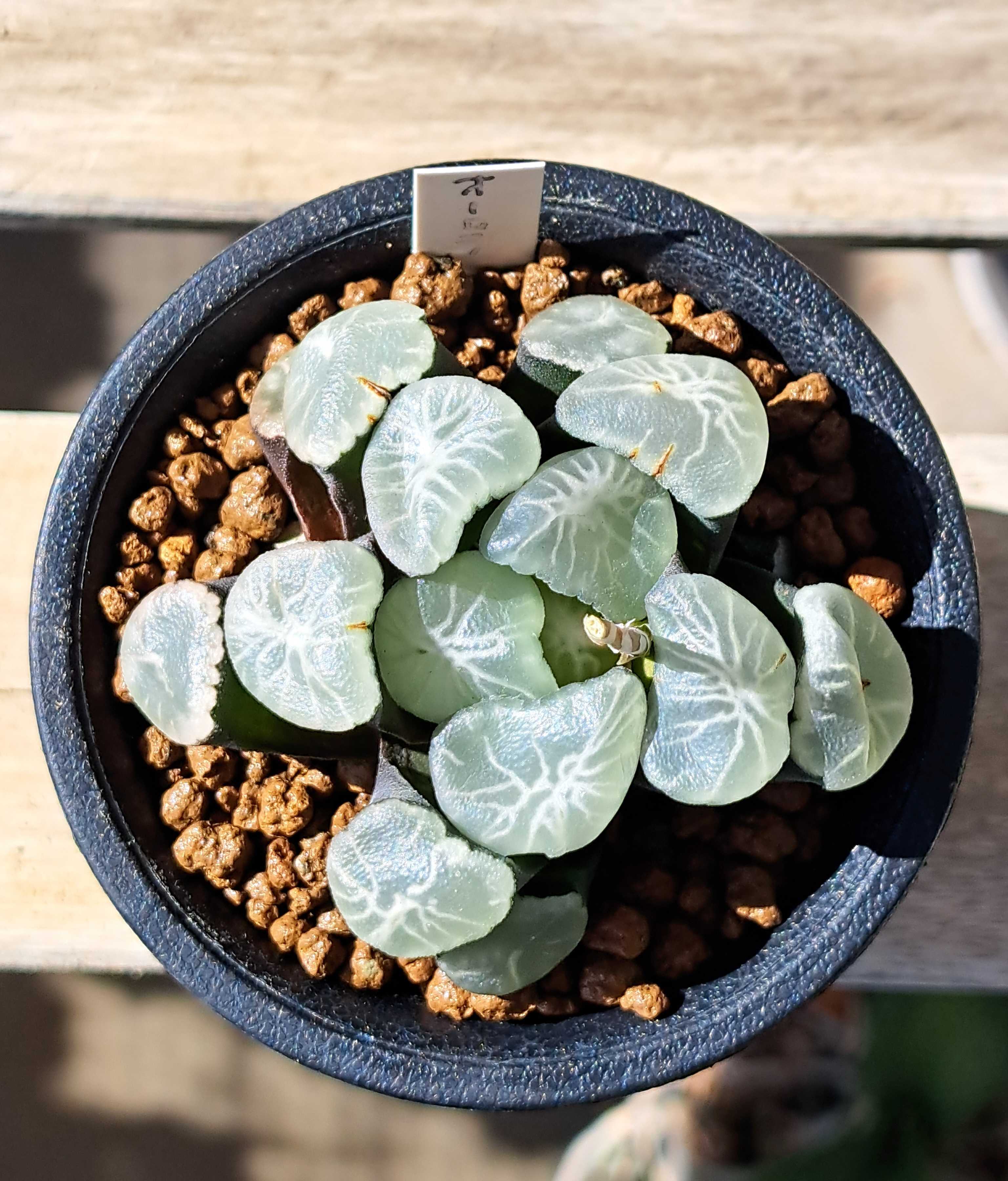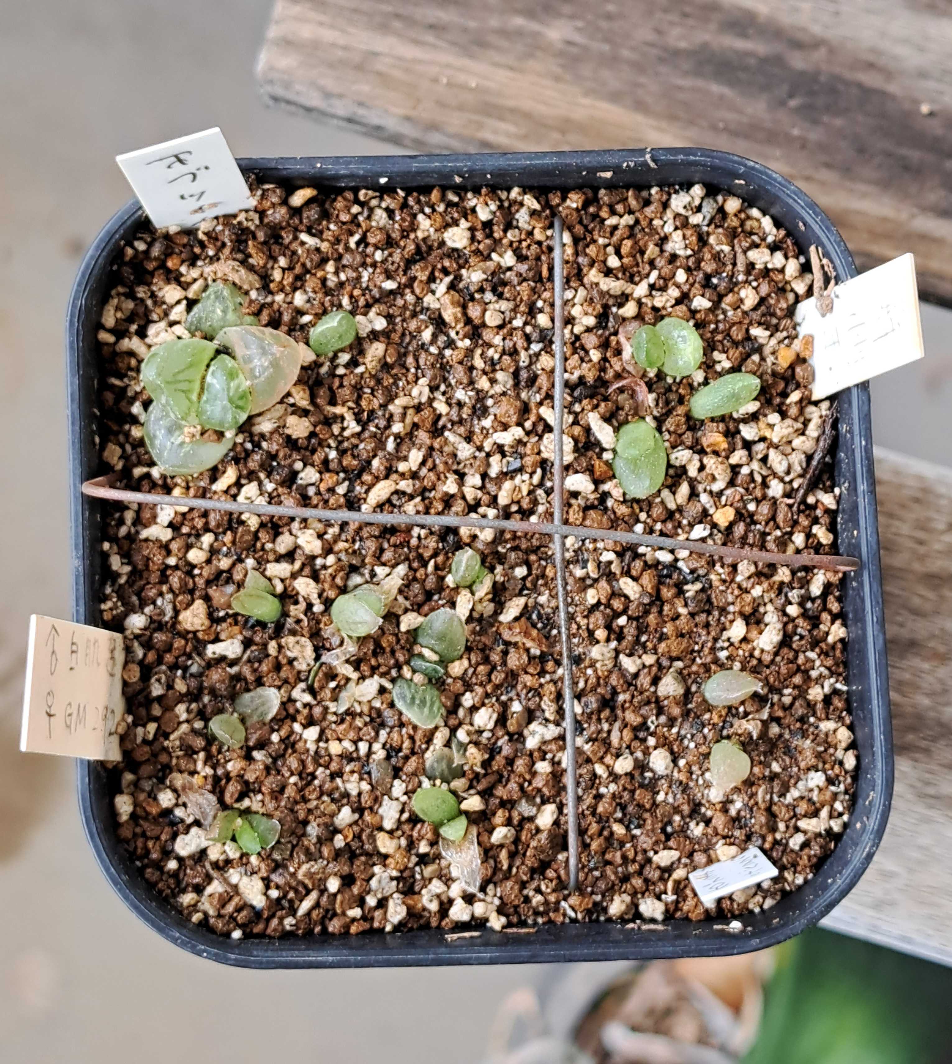 しばらく植え替えていなかったハオルチアをいくつか植え替えたので見てみよう。画像は全て植え替え後だ。4種寄せ植えから。葉挿しと実生の4種。播種後一回も植え替えていなかったので植え替え。めちゃ小っちゃいがいずれも数年経っている。ひとつずつ見ていく。オブツーサ錦。2022年5月葉挿し開始。3年5ヶ月でコレだ。ヘタクソか?いや、間違いなくヘタクソだ。なぜならコイツ↓も2年4ヶ月経過しているのだ。蘇州玉露錦。2023年6月播種。実生だが2年でコレはないだろう。ヒドイ。白肌選抜ベヌスタ×GM292 。優良ベヌスタの掛け合わせだがこれまた時間が経っている。2022年7月播種。実に3年と3ヶ月が経過。ヘタクソ確定だ。そして一番ヒドイのがコレ。プラチナ×ベヌスタ。最近芽が出たばかりに見えるがこれまた2年以上経っている。どれも全然育っていない。なので土を更新し再チャレンジだ。荒磯葉挿し。確か2020年12月ごろ挿したもので5年近くが経過している。5年でこれか?という感じだがさっきの4種植えよりはだいぶマシだ。それらしい模様が出てきている。この模様が良いのだ。フツーの玉扇。それぞれ単独植えにしていたが全然成長しないし逆に下葉が枯れてきたので寄せ植えに。4鉢→1鉢に減って良かった。大黒M字。カキコ。寄せ植えだったのを単独植えに。なかなか良い窓模様。デカくなるとM字型になる。玉扇イルミネーション斑。これも全然成長しないヤツ。カキコと葉挿しなのだがもう2、3年経っている。真ん中のヤツは単独植えにしていたのだが変化が全くない。鉢数も減るしこの際寄せ植えにした。こうやって見るとホント成長してないヤツばっかだな。土も更新したことだし少しは成長してほしいものだ。頼むよみんな。(多肉植物)韓国苗 ハオルチア 玉扇 トランカータ ホワイトドラゴン(1株)(多肉植物)韓国苗 ハオルチア 玉扇 トランカータ 白亜(1株)(多肉植物)韓国苗 ハオルチア 玉扇 トランカータ 玄武(1株)多肉植物:ハオルチア 玉扇 駿府*幅8cm 現品!一品限り多肉植物:ハオルチア 玉扇 白紋*幅6.5cm 現品!一品限り