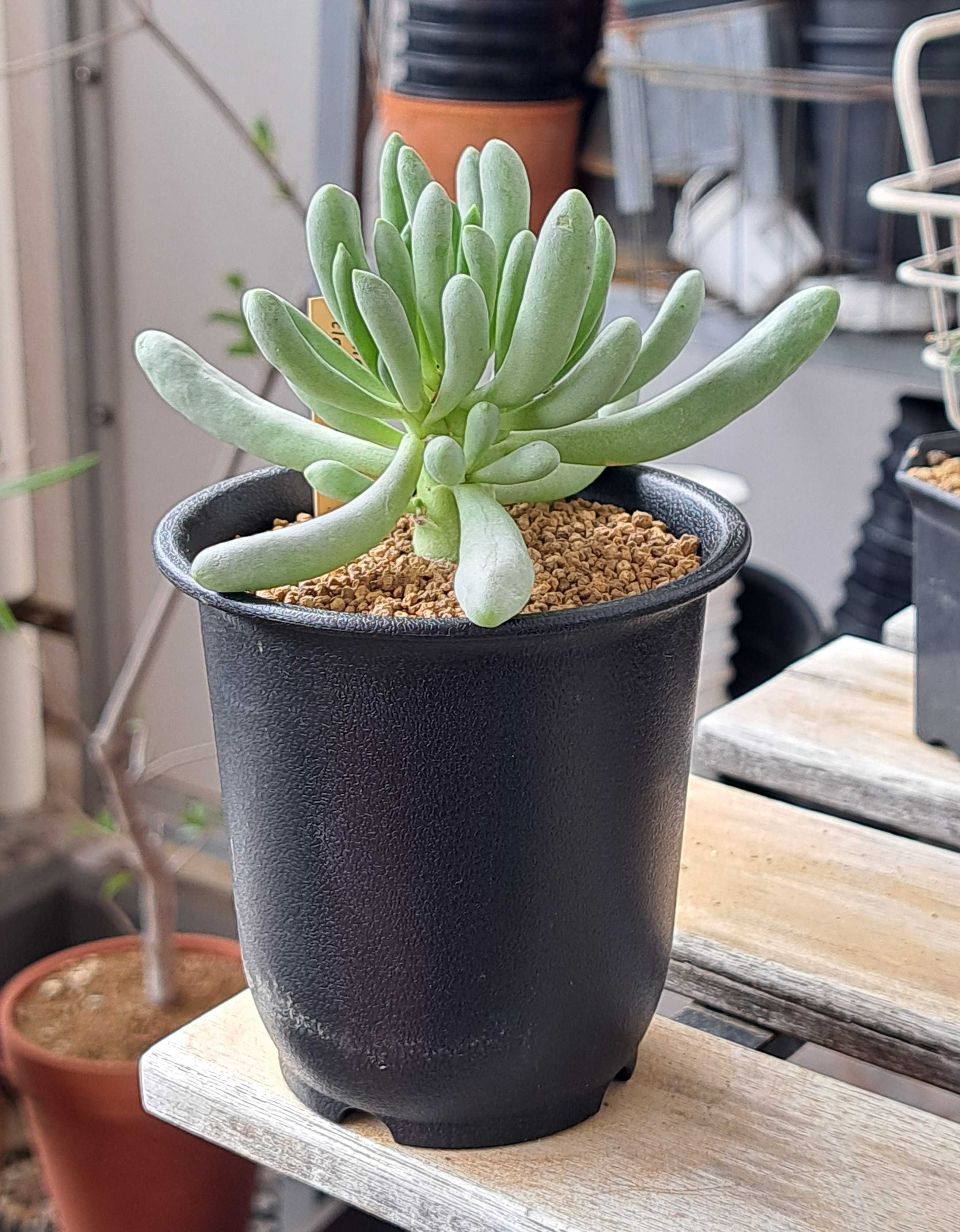 ダドレアは夏に弱い。これまでいくつかのものは夏を越せず枯れていった。そこで去年めちゃめちゃ弱そうなヤツを室内夏越しさせたところうまくいったので今年は全員室内置きとした。室内夏越し後のダドレアたちを見てみよう。まずはブリトニー。下葉はかなり枯れ込んでいるが生きた葉がこれだけ残っていれば成功だろう。生育期になればまた葉が出ていずれ復活する。フランクレイノルト。コイツも下葉が枯れ小さくなってしまったが何とか生き残っている。7月31日時点ではこんな感じ。ややショボくなってしまったが去年よりはマシだ。ちなみに昨年10月3日はコレだ。若干良くなっているのが分かる。今年は大きく成長してほしいね。グリーニー。下葉の枯れが激しい。室内でもコレだからもうこれ以上どうすることもできない。一日中エアコンつけるかサーキュレーターで常に風を当てるか、そのぐらいしか方法はない気がする。まあでもこの状態なら合格だ。葉はたくさん残っている。分岐しているところもあるし、春頃にはきれいな姿を見せてくれるはずだ。ノーマ。ノーマもグリーニーも同じものではないかと思うが一応ノーマ。4分岐しているもの。葉はだいぶ少なくなったが何とか残った。もうひと鉢。寄せ植えだが脱落者ゼロで夏越し。いや立派。昼間はまだ25℃を越えるがかなり過ごしやすい気候になってきた。もう外でいいだろう。外の日陰に当面は置き、2週間後ぐらいから徐々に日に慣らしていく。ダドレアは動き出しがやたら遅く晩秋ぐらいにならないと動かない。ゆっくり慣らしていけば良いのだ。動き出しが遅い分春は遅くまで成長する。6月ぐらいまでか?よく分からんが毎年そう。なので今年も始動は11月ごろだと思われる。亀甲竜やフィロボルスなどとは大きく違うんだね。(多肉植物)ダドレア ノーマ 3号(1鉢)グノマ丸葉仙女盃 ダドレア Mサイズ Dudleya antoni 多肉植物 中型種 ロゼットタイプ きれい かわいい 観葉植物パキフィッツム ダドレア Mサイズ Dudleya pachyphytum 多肉植物 中型種 ロゼットタイプ きれい かわいい 観葉植物
