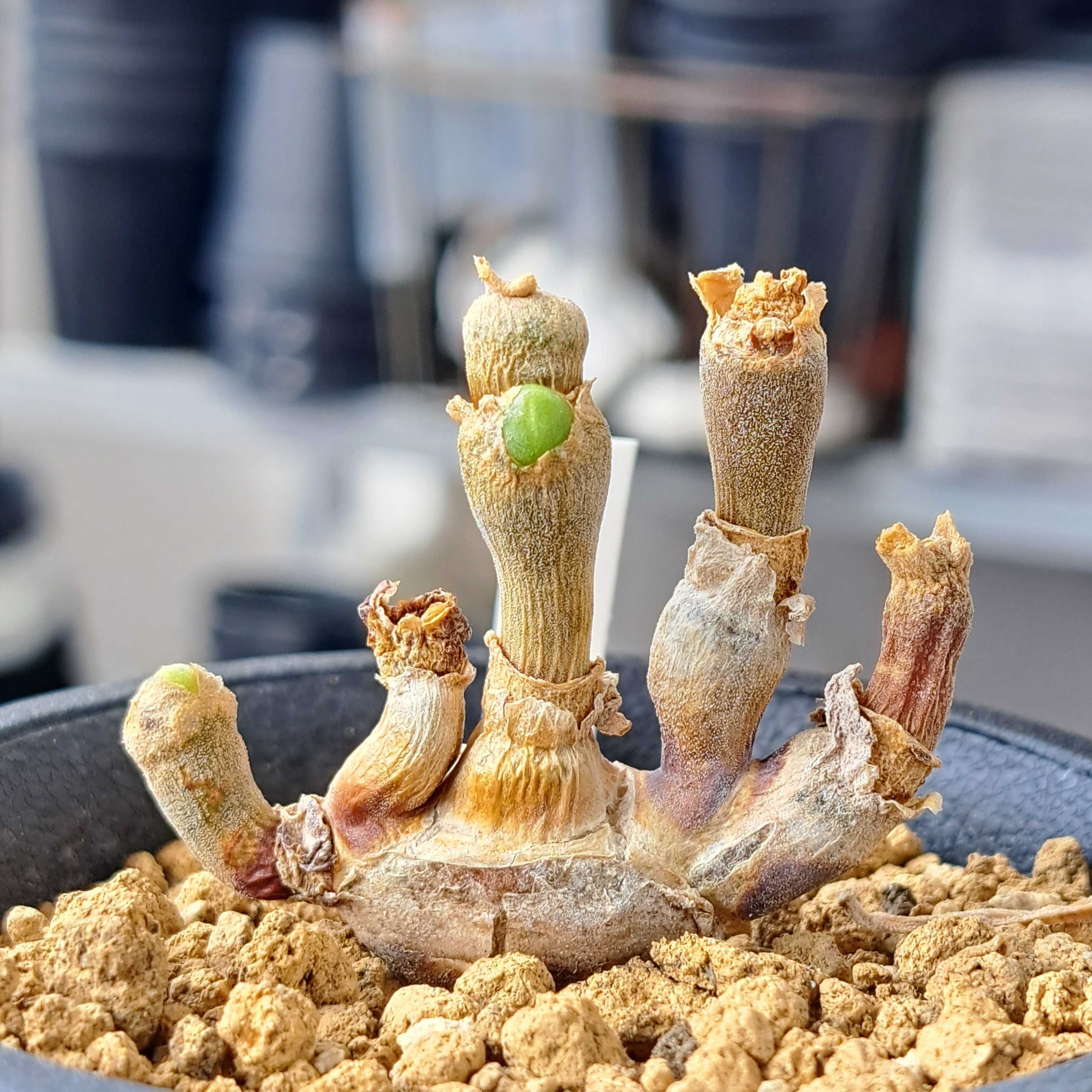 今日はセネシオを記事にする。七宝樹の葉が出てきた。今回はちゃんと成長しそうだ。初夏ごろにも葉を出しかけたことがあったのだが、そのときはちゃんと成長しなかった。毎回秋から冬が成長期。今度は間違いない。サギナータス。7月ごろ出た芽が順調に育ちここまでになった。相変わらずいつが成長期なのかはっきりしない。去年の根挿しも生育中。去年作られた茎節の上部が伸びてきている。毎年新茎節が出るわけじゃないのね。動きがないヤツもいる。他は全員動いているのにコイツだけダメ。何が原因なのだろう?ピクチカウリス。始動は4月と早かったが夏は停滞、そして今また活性化してきた様子。春と秋成長する…春秋型ということか?地際から出ているこの部分も、夏の間は全く動かなかったが、ようやく葉が出始めたようだ。最後にスケイポサス。真夏にほとんど枯れてしまい残ったのはこれだけ。コイツもボロッボロだが葉が出かかっている。これを大事に育てるしかない。変わり果てた姿だがはたして復活するかどうか…。セネシオ・ラティキペス 9cm鉢 カクタス長田 キク科 多肉植物 冬型 コーデックス 塊根植物 珍奇植物 南アフリカ原産オトンナ・クレムノフィラ 9cm鉢 カクタス長田 キク科 多肉植物 冬型コーデックス 塊根植物 サボテン 珍奇植物 南アフリカ原産ヒドノフィツム・パプアナム 6cm鉢 カクタス長田 アリ植物 蟻の巣玉 アカネ科 夏型コーデックス マレーシア原産 塊根性 観葉植物観葉植物/ステファニア:スベローサ 3.5号鉢植え*