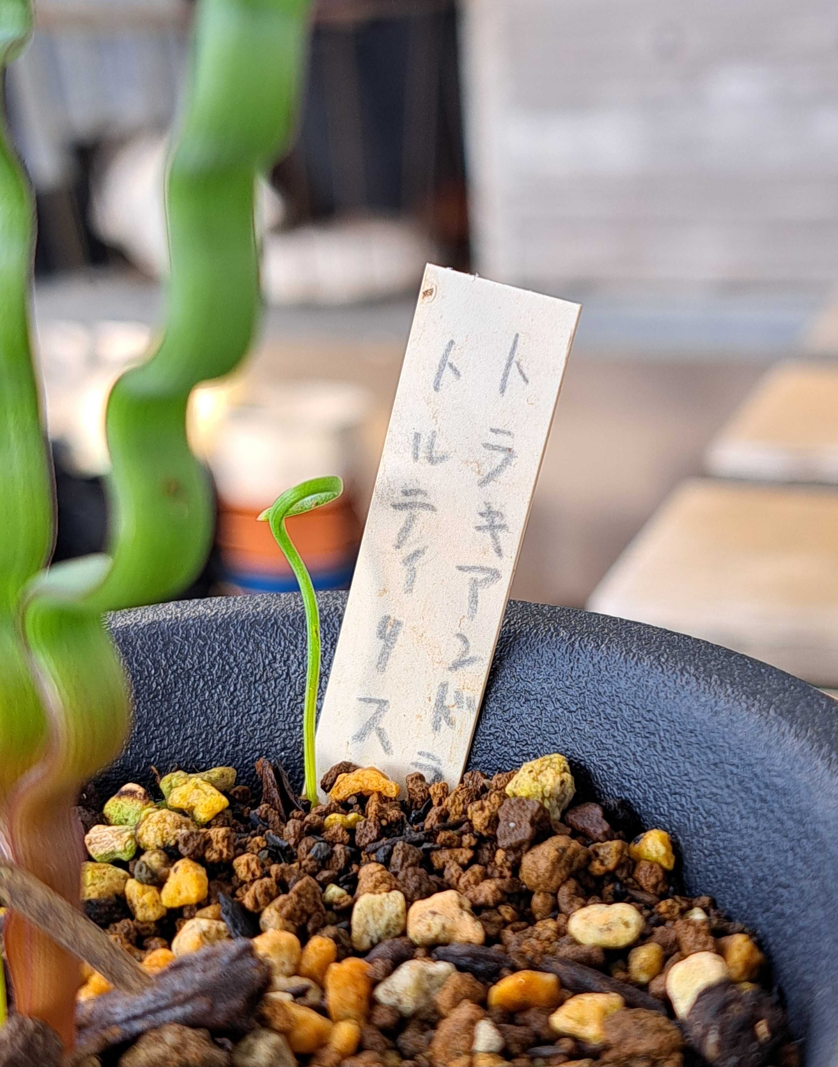 亀甲竜を植え替えたのは9月13日。1号2号3号ともツルが出始めていたところだったが、その後の調子はどうだろう?確認してみるか。1号タテ長。9月13日植え替え直後。現在。ひじきのような黒い棒状物だけだったのが変化し葉を出している。去年初めて支柱にツルがからまった。年々ツルも長くなっているのだ。今年はどれくらいまで伸びるか。楽しみに観察しよう。2号まん丸のツルツル。9月13日。現在。おお。早くもツルが支柱に巻き付いている。1号よりも小さくひび割れもまだあまりない幼苗なのにツルは勢いが良い。塊根も今年はひび割れが進むだろう。どう割れていくか。これまた楽しみだ。3号バキバキ野郎。9月13日。現在。前回はまだツルが出ていなかったがいつの間にかするする伸びこんな状態に。やっぱデカいヤツは早ええわ。毎年そうだが2号3号は先にツルが伸びてその後葉が大きくなるが1号はツルが伸びる前に葉がデカくなる。ツルが先のヤツ、葉が先のヤツ。個体の性質の違いなんだろうね。亀甲竜 ミニ ディオスコレア エレファンティペス 2.5号 塊根植物 観葉植物 小さい 卓上 希少 種 コーデックス 多肉植物 冬型 おしゃれ 鉢 移転祝い ガーデニング 贈り物 プレゼント 亀甲龍夏ギフト お中元観葉植物/ディオスコレア(亀甲竜):エレファンティペス3号ポット亀甲竜 きっこうりゅう ディオスコレア・エレファンティペス 実生2年目 3号鉢 塊根植物 コーデクッス 多肉植物 観葉植物 人気種 ヤマノイモ科 ディオスコレア属 Dioscorea elephantipesアフリカ亀甲竜観葉植物/ディオスコレア(亀甲竜)6号23-01