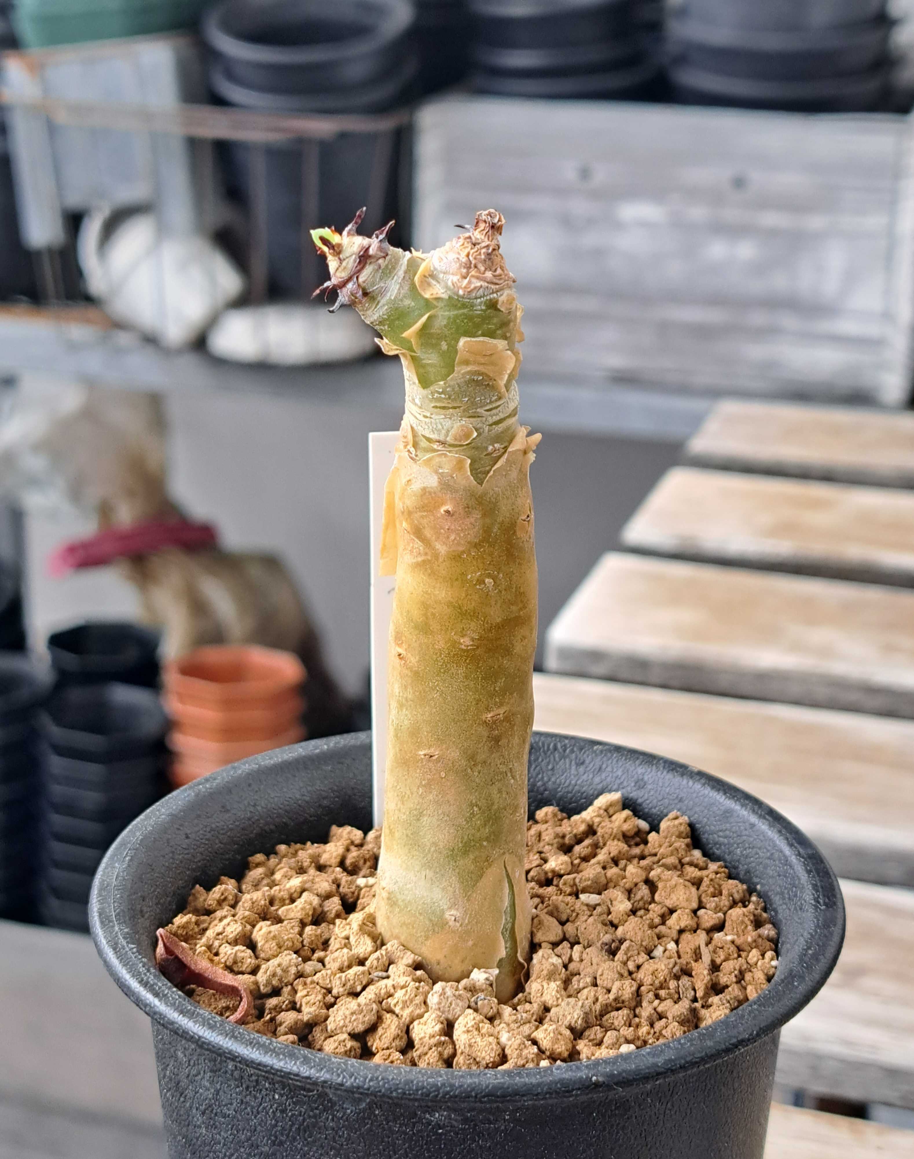久しぶりに小っちゃいグラキリス1号から5号の様子を見る。無事に夏を越しただろうか?1号「単頭」うん。無事だ。パキポディウムは夏型。夏に枯死することはまずないのだ。ただ、コイツらはまだ幼苗。ちょっとしたことで傷んだり枯れたりする危険性はある。注意が必要だ。下葉が数枚変色している。紅葉が始まったようだ。2号「右に枝」右以外にも左や前から枝が出かかっていたのだが小さいうちに切り取った。あくまで「右に枝」として作るのだ。夏の間塊茎はあまり太っていないようだが下ぶくれでなかなかの良形。まだ紅葉も始まっていない様子。3号「細野郎」相変わらず細い。2号みたいにぼってりしてほしいのだが、そうはならない。来年に期待だな。一方、葉は枯れまくり、丸坊主寸前。小さいパキポは早くに紅葉落葉する。今では3.5号鉢になったデンシフローラムも最初は9月ごろ紅葉していたものだ。デカくなるにつれ紅葉は遅くなる。なので心配はいらないだろう。4号「円錐」下部はでっぷり。そこから上に行くにしたがって円錐状に細くなるコイツ。肌に焼けたあとが残る。コイツも紅葉から落葉へと進行中。残る葉はわずか。丸坊主も時間の問題だ。5号「枝だらけ」やたらと枝を出しているヤツ。買ったときからこうだった。個体差なのだろうが同じグラキリスでも性質には大きな違いがあるんだな。葉は残っている方だが結構傷んでいる。いつまで持つかは分からない。パキポディウム・グラキリス。全てベランダ最前部置き。水は週イチぐらいでたっぷり。紅葉落葉も始まったし今後は水やり頻度を下げていく。室内に入れるのはまだ先でいいだろう。本によるとこの時期もっともイモを太らせるとあるが、はたしてそうなるだろうか?多肉植物 caパキポディウム グラキリス 実生 7.5cm〜9cmポット 多肉植物 送料無料 コーデックス多肉植物 caパキポディウム グラキリス 実生 0904-006 現品販売 3号鉢 送料無料 多肉植物 コーデックスパキポディウム・グラキリス (実生) 7.5cm鉢 カクタス長田 キョウチクトウ科 グラシリス コーデックス 塊根植物 多肉植物 珍奇植物 サキュレントプランツ観葉植物/パキポディウム:グラキリス3.5号23-02観葉植物/パキポディウム:グラキリス(黒肌) 3.5号25-01